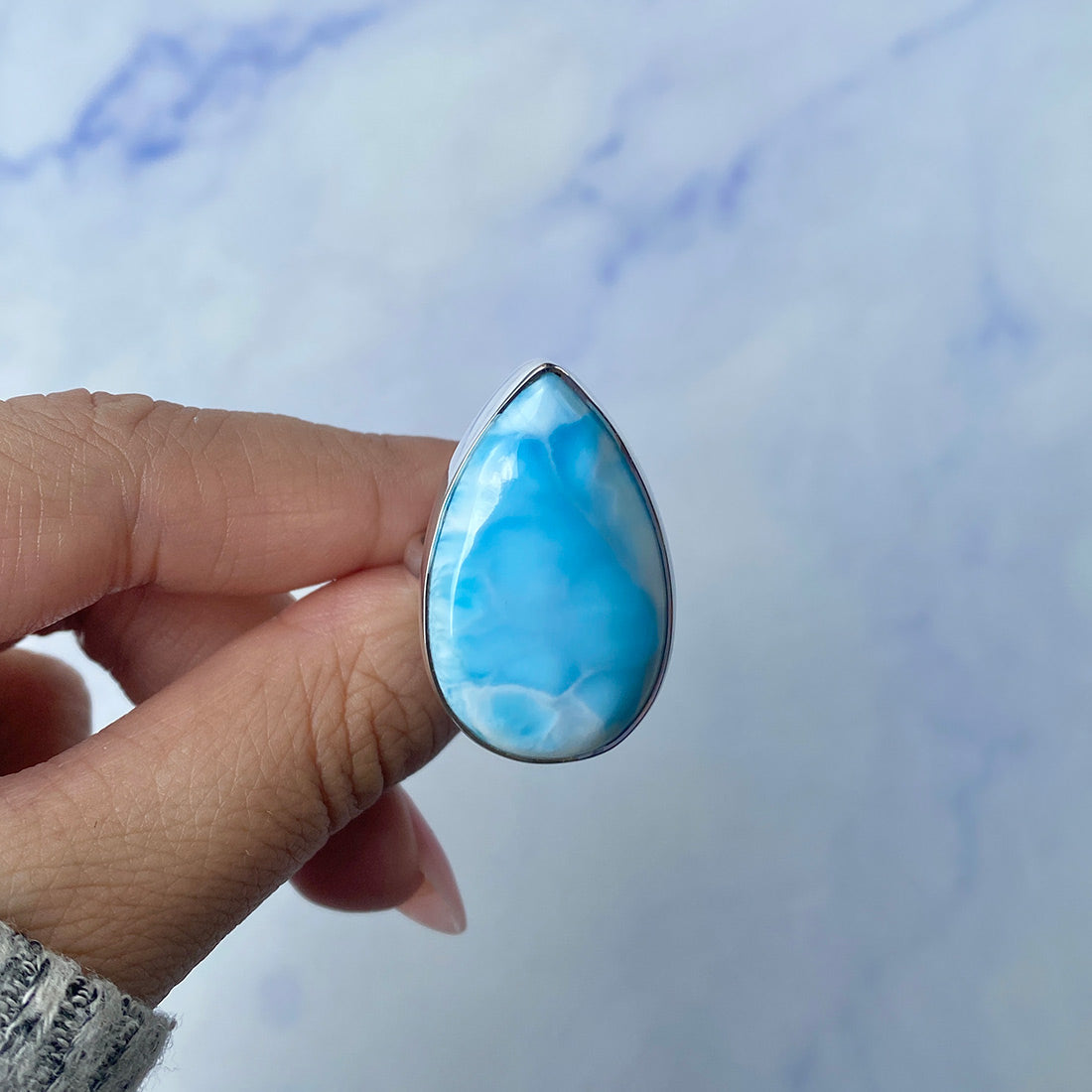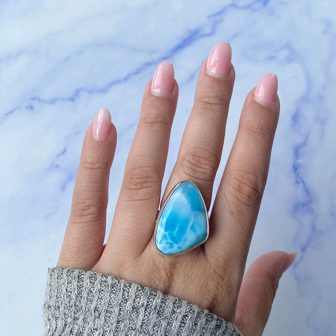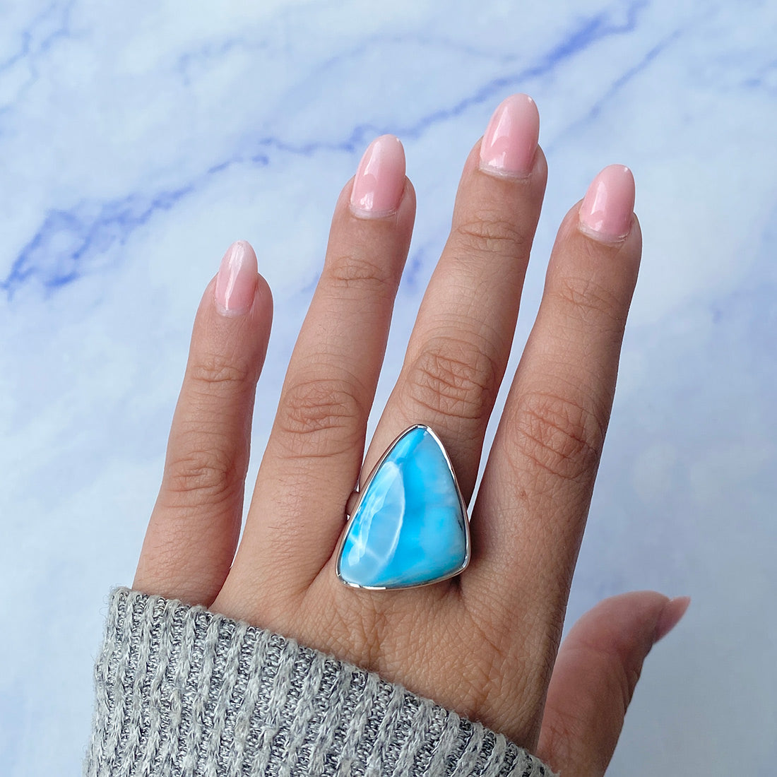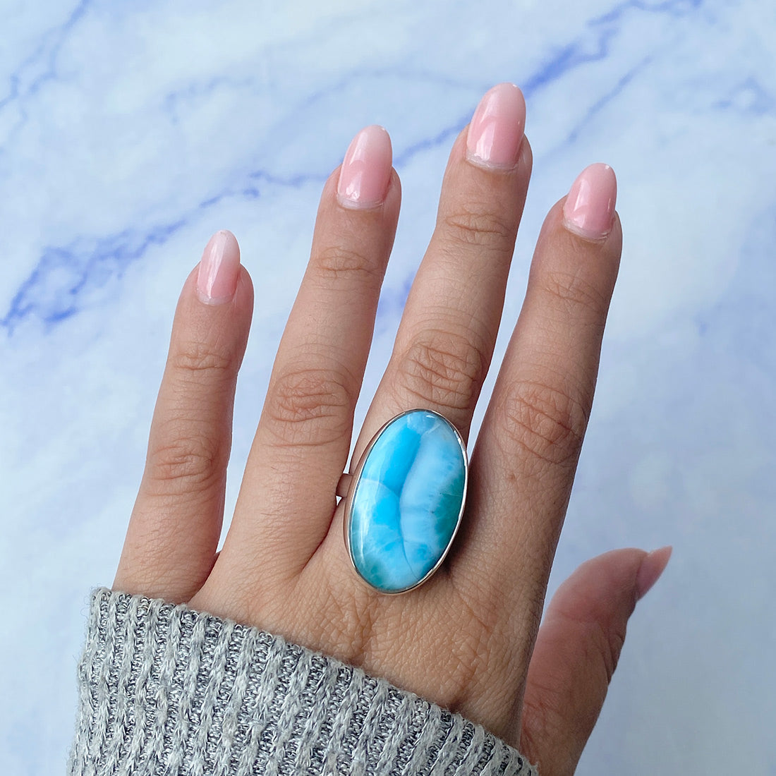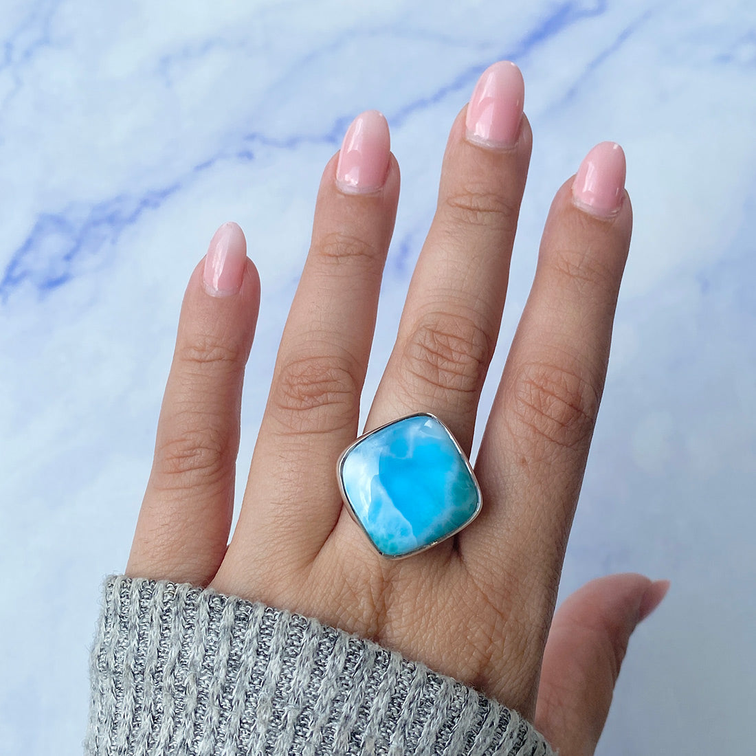 Larimar rings are thought to provide a number of therapeutic benefits. It is claimed to give relaxation and lessen tension and anxiety in the wearer by having a calming and soothing impact. Larimar's stunning blue hue is frequently connected to the sky and the ocean, fostering calm and peace. Some people think that wearing Larimar jewelry, such as Larimar bracelets, earrings, Larimar pendants, and necklaces, can aid in calming the mind and promoting inner peace.