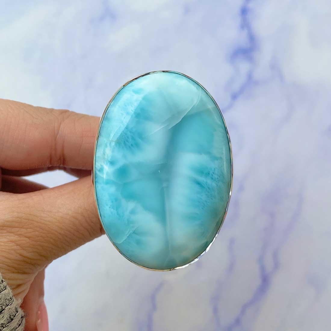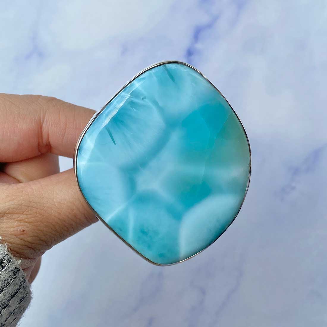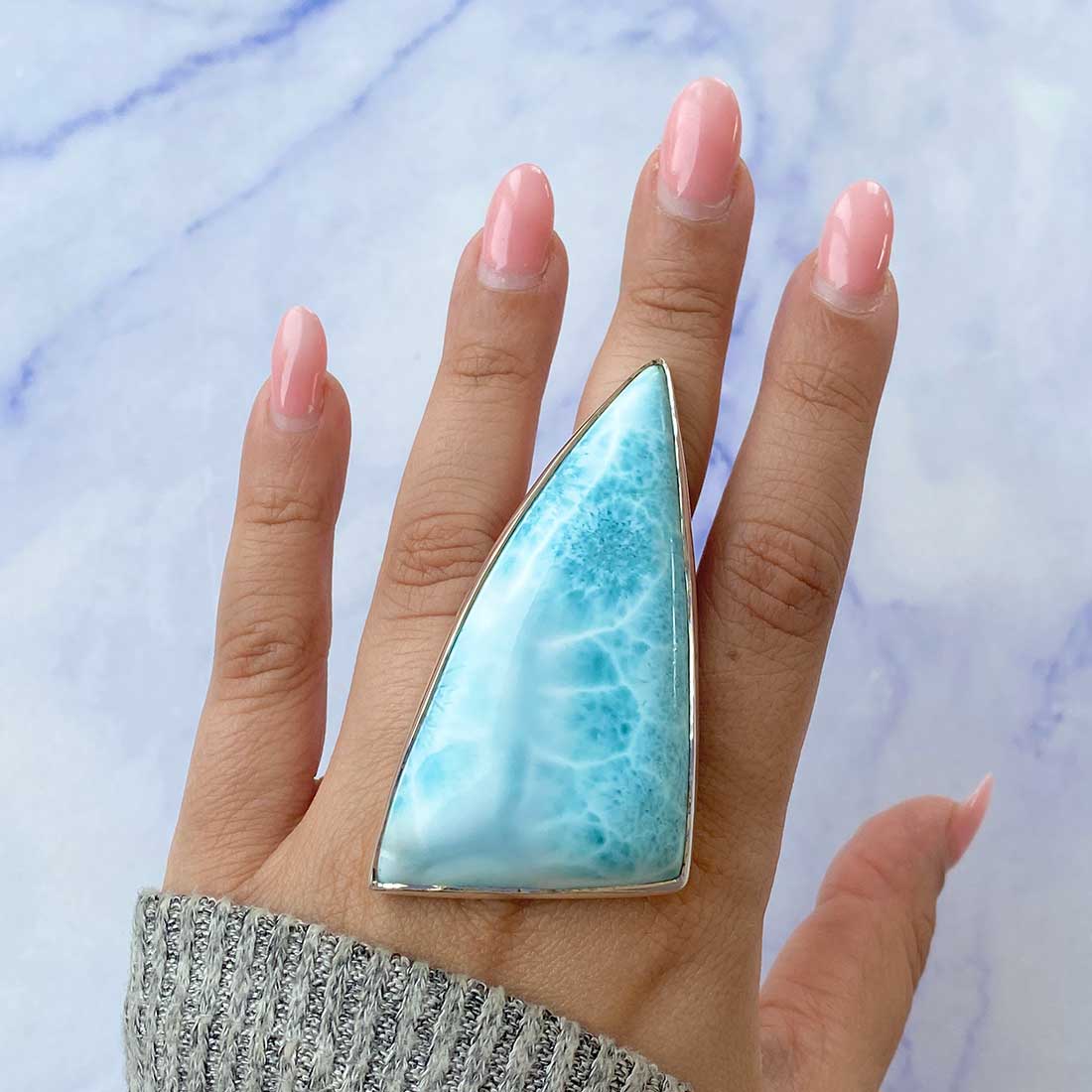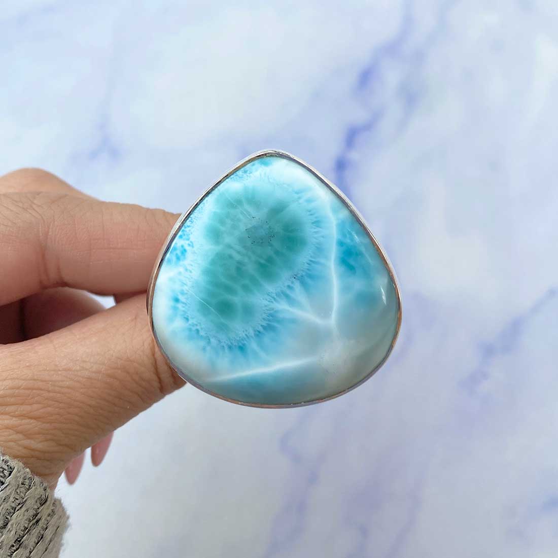 Larimar rings are thought to provide a number of therapeutic benefits. It is claimed to give relaxation and lessen tension and anxiety in the wearer by having a calming and soothing impact. Larimar's stunning blue hue is frequently connected to the sky and the ocean, fostering calm and peace. Some people think that wearing Larimar jewelry, such as Larimar bracelets, earrings, Larimar pendants, and necklaces, can aid in calming the mind and promoting inner peace.