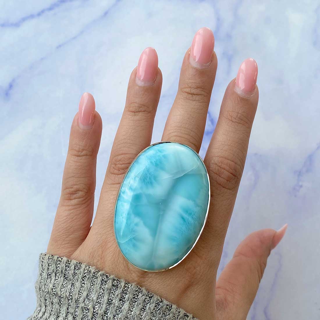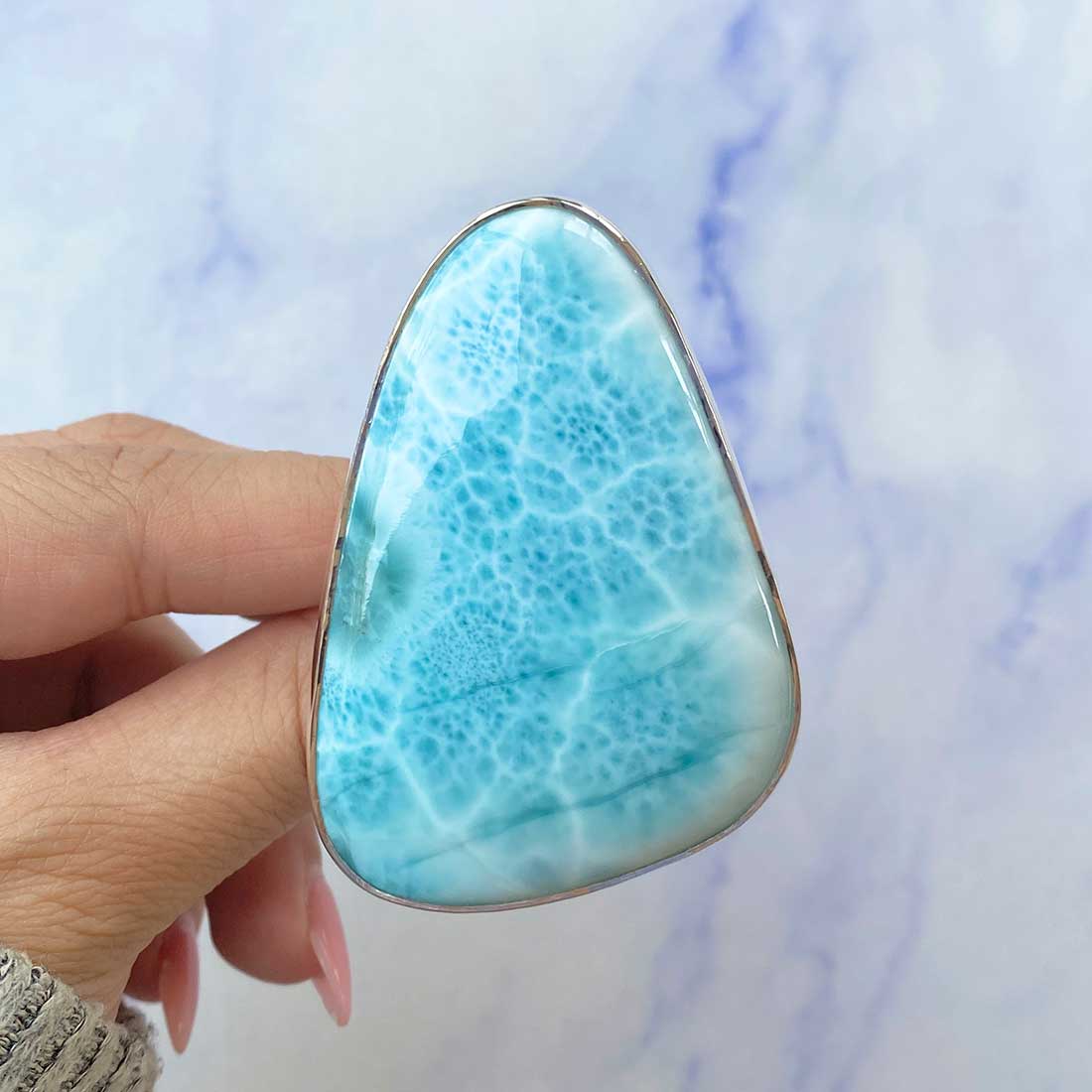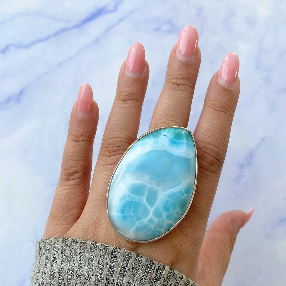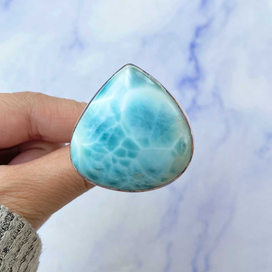 Larimar rings are thought to provide a number of therapeutic benefits. It is claimed to give relaxation and lessen tension and anxiety in the wearer by having a calming and soothing impact. Larimar's stunning blue hue is frequently connected to the sky and the ocean, fostering calm and peace. Some people think that wearing Larimar jewelry, such as Larimar bracelets, earrings, Larimar pendants, and necklaces, can aid in calming the mind and promoting inner peace.