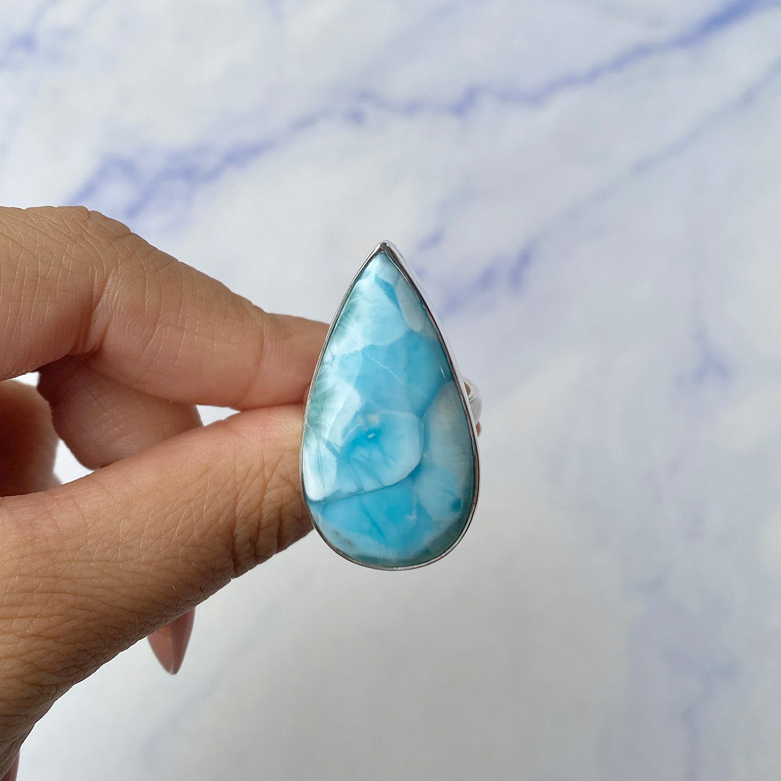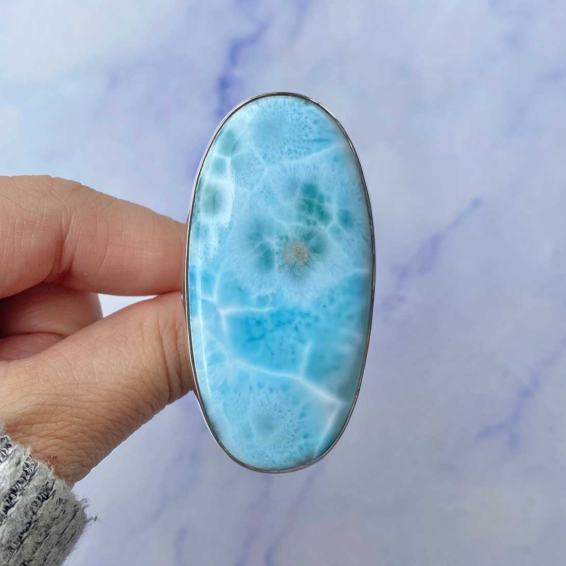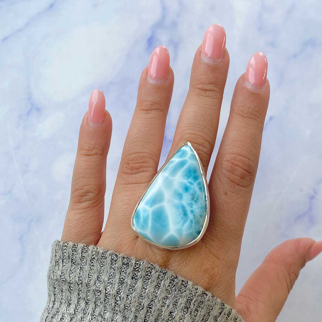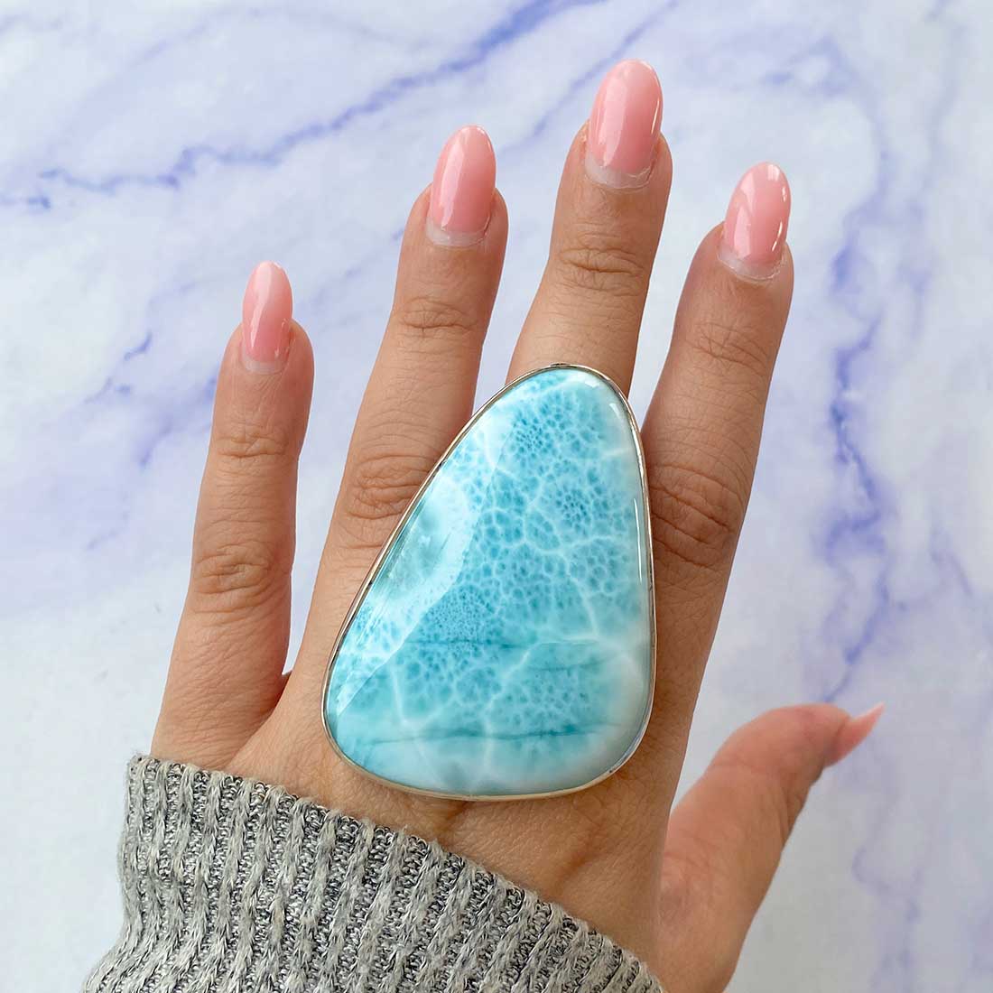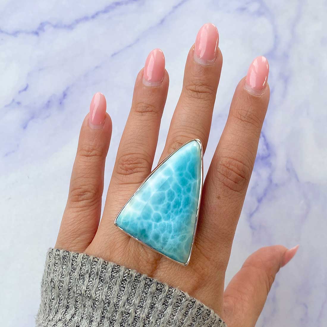 Larimar rings are thought to provide a number of therapeutic benefits. It is claimed to give relaxation and lessen tension and anxiety in the wearer by having a calming and soothing impact. Larimar's stunning blue hue is frequently connected to the sky and the ocean, fostering calm and peace. Some people think that wearing Larimar jewelry, such as Larimar bracelets, earrings, Larimar pendants, and necklaces, can aid in calming the mind and promoting inner peace.