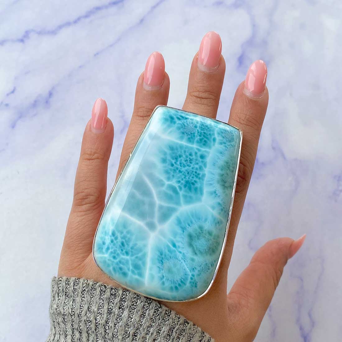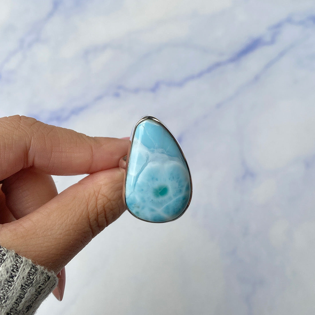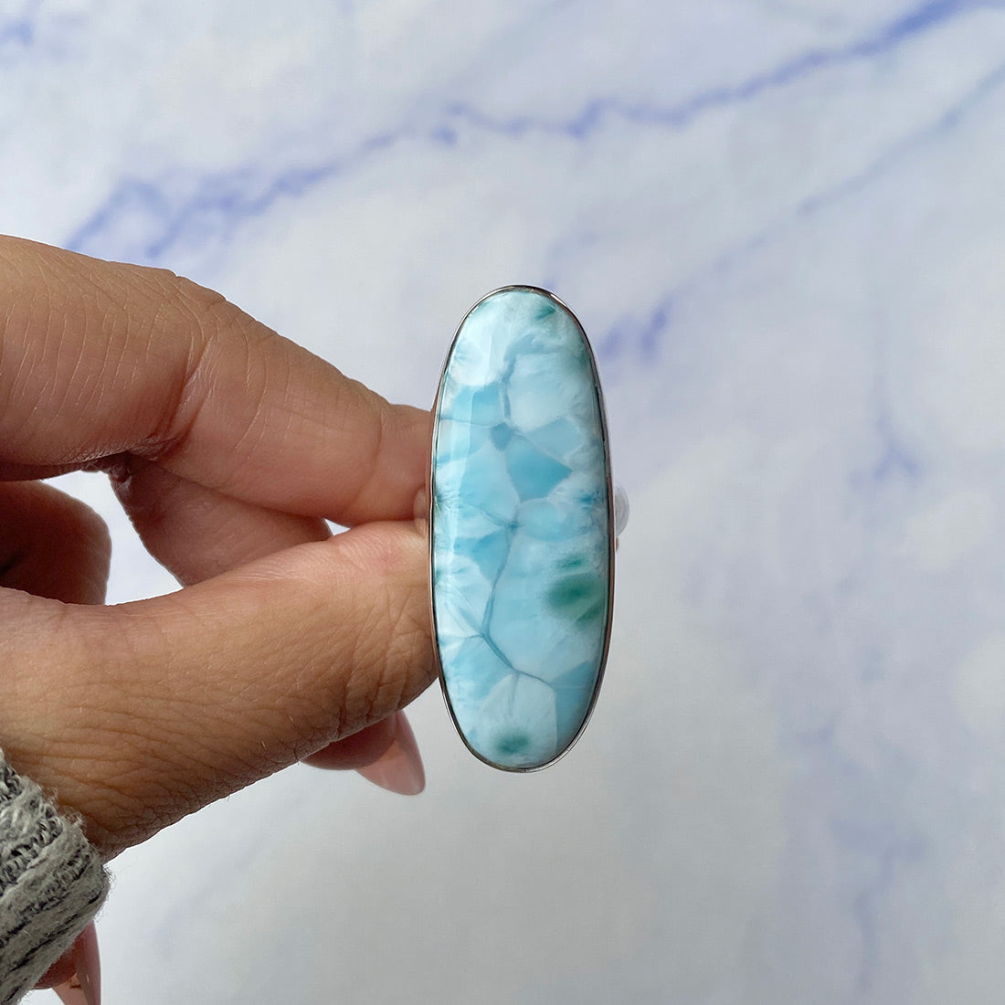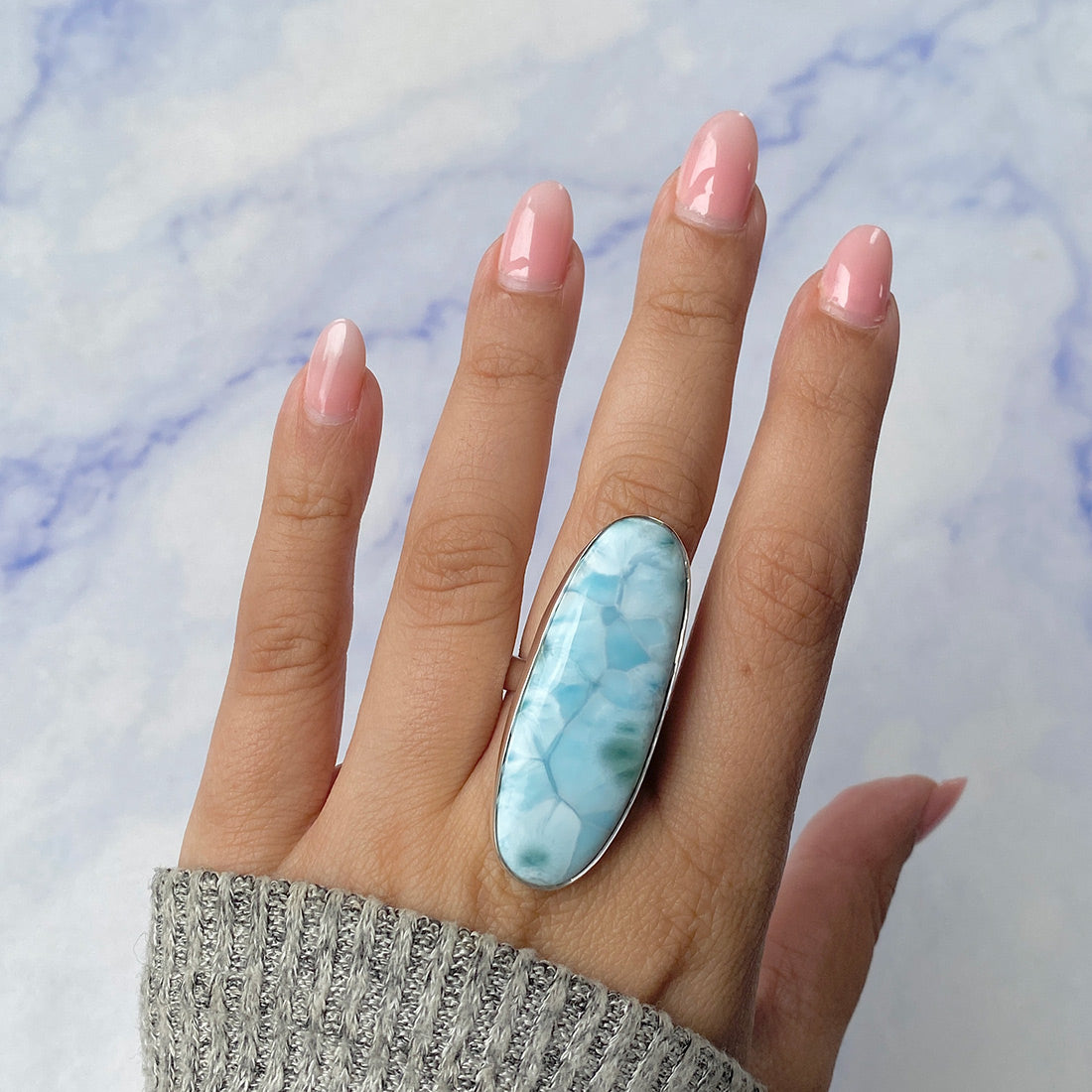 Larimar rings are thought to provide a number of therapeutic benefits. It is claimed to give relaxation and lessen tension and anxiety in the wearer by having a calming and soothing impact. Larimar's stunning blue hue is frequently connected to the sky and the ocean, fostering calm and peace. Some people think that wearing Larimar jewelry, such as Larimar bracelets, earrings, Larimar pendants, and necklaces, can aid in calming the mind and promoting inner peace.