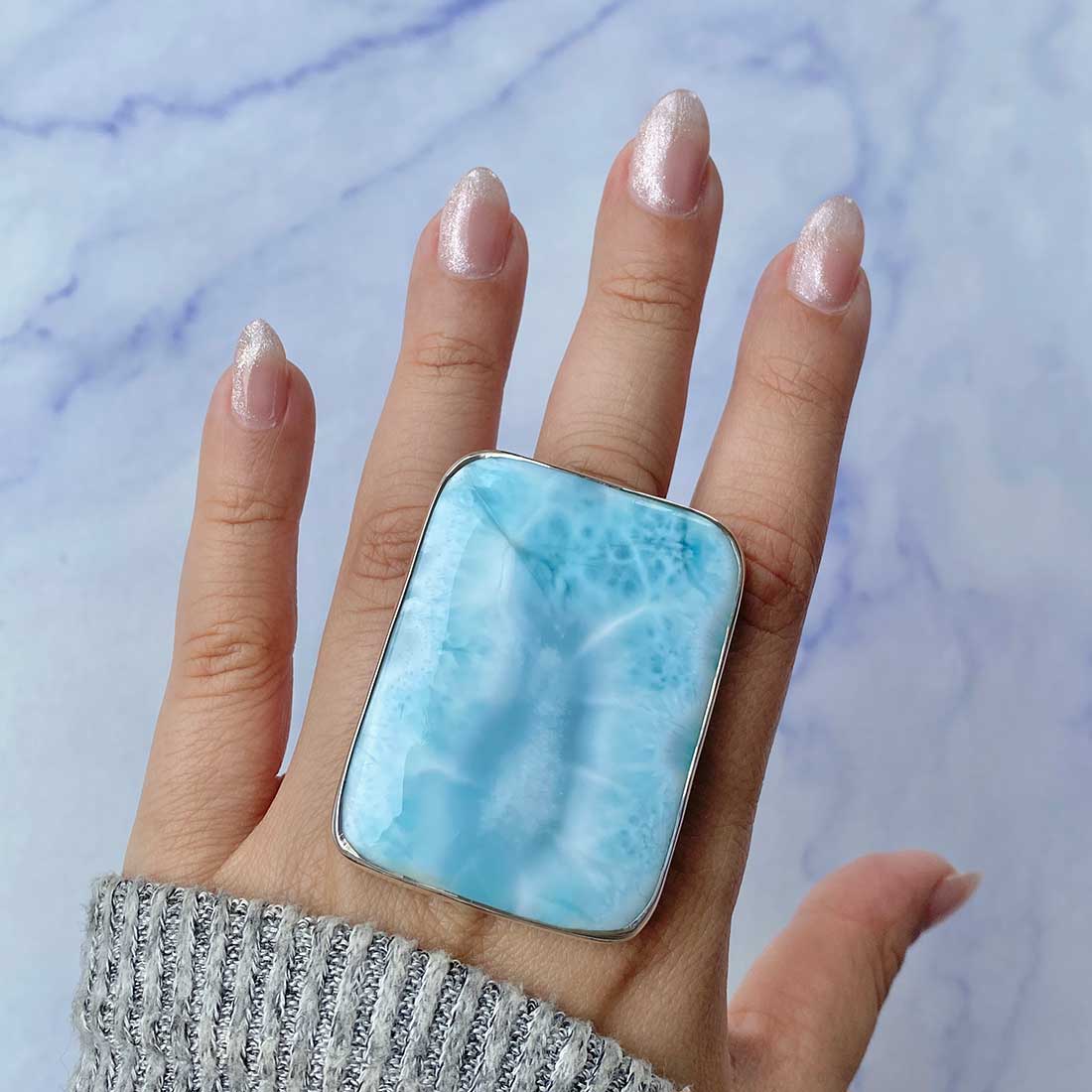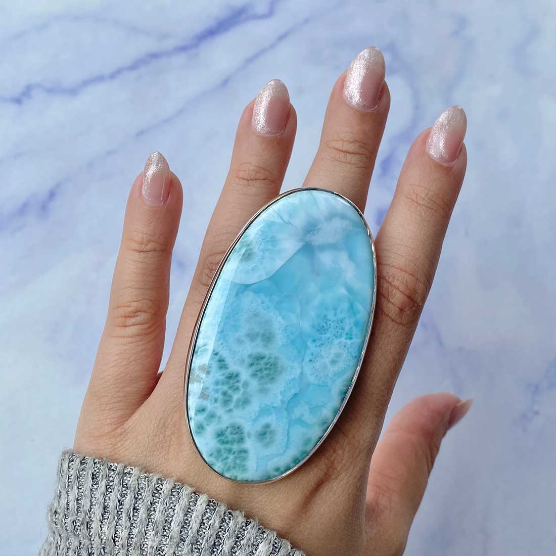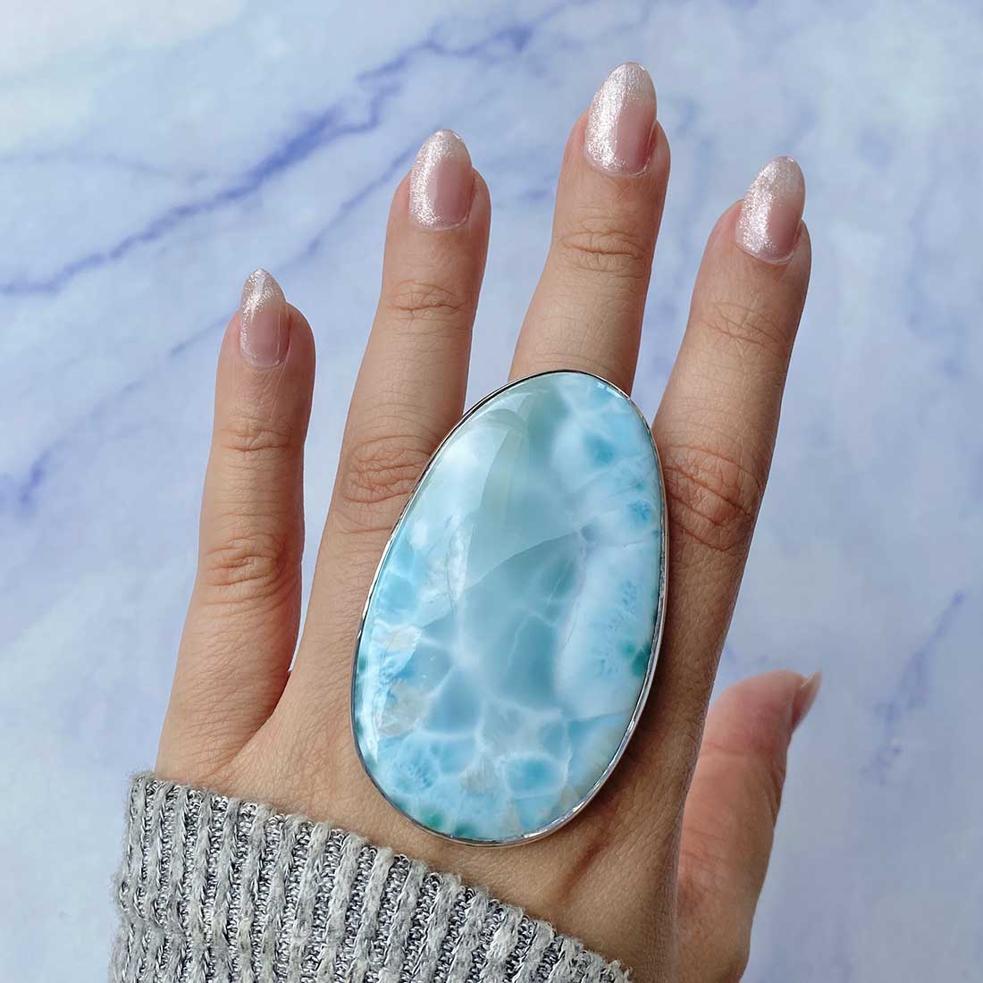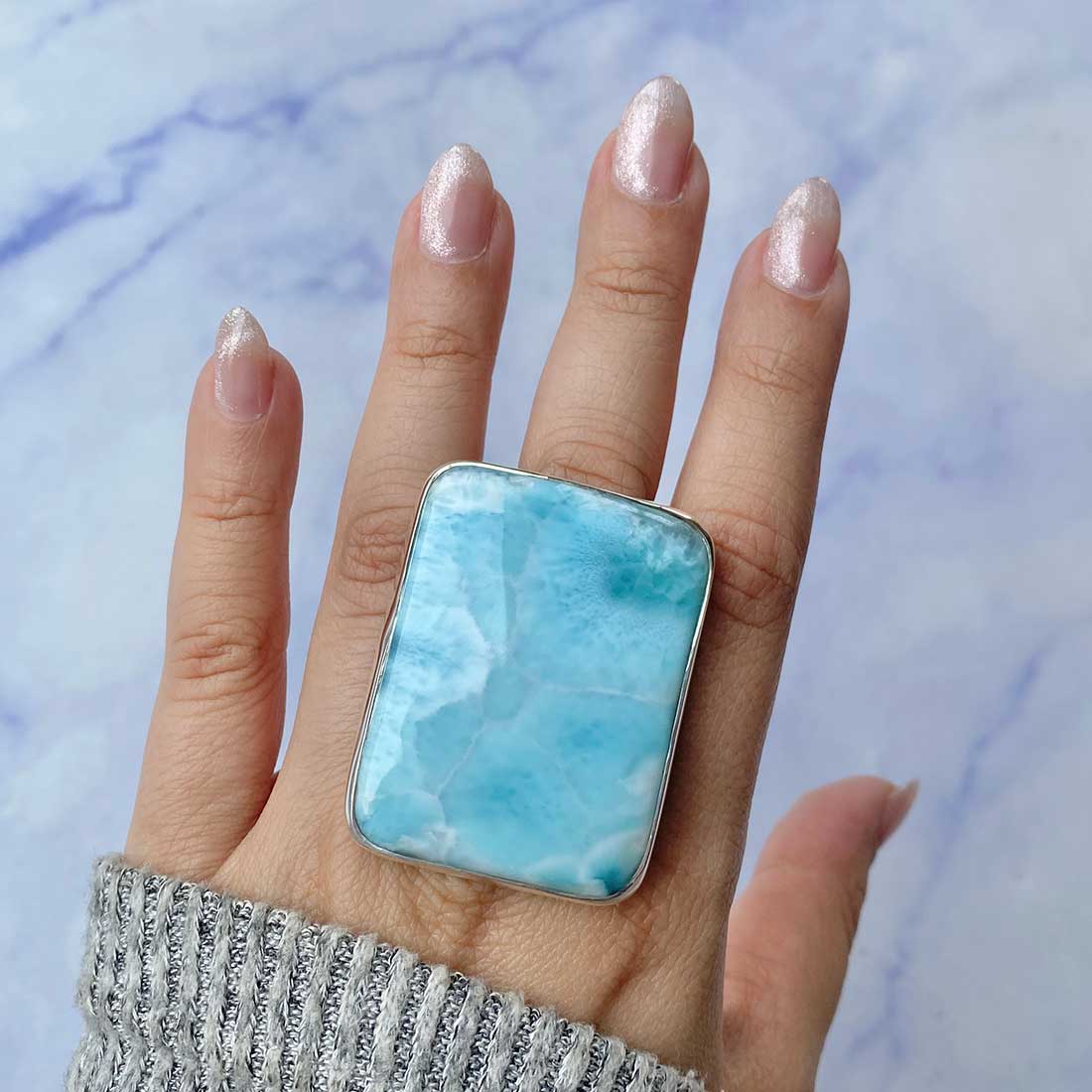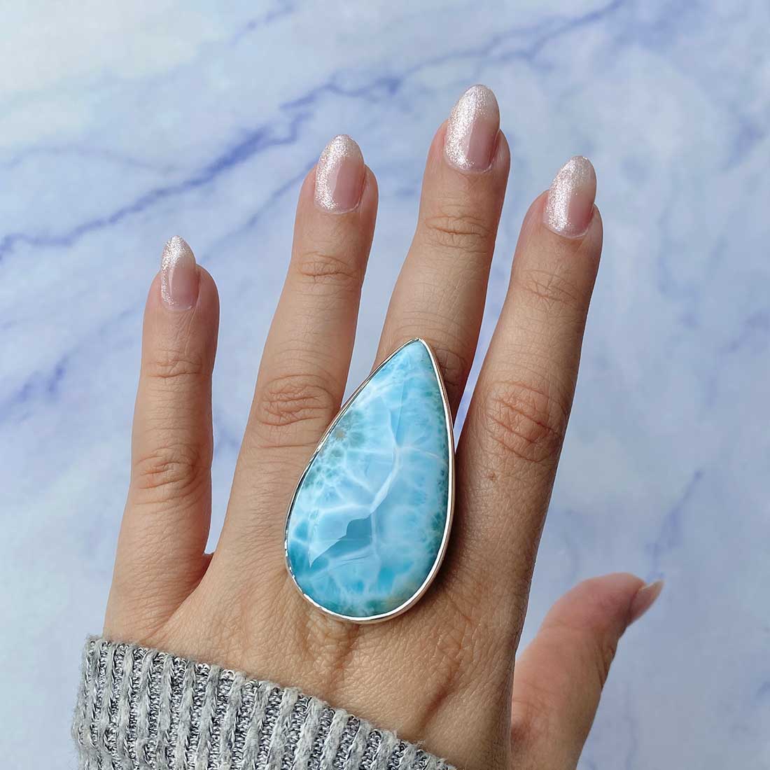 Larimar rings are thought to provide a number of therapeutic benefits. It is claimed to give relaxation and lessen tension and anxiety in the wearer by having a calming and soothing impact. Larimar's stunning blue hue is frequently connected to the sky and the ocean, fostering calm and peace. Some people think that wearing Larimar jewelry, such as Larimar bracelets, earrings, Larimar pendants, and necklaces, can aid in calming the mind and promoting inner peace.