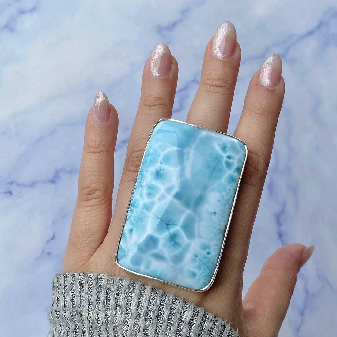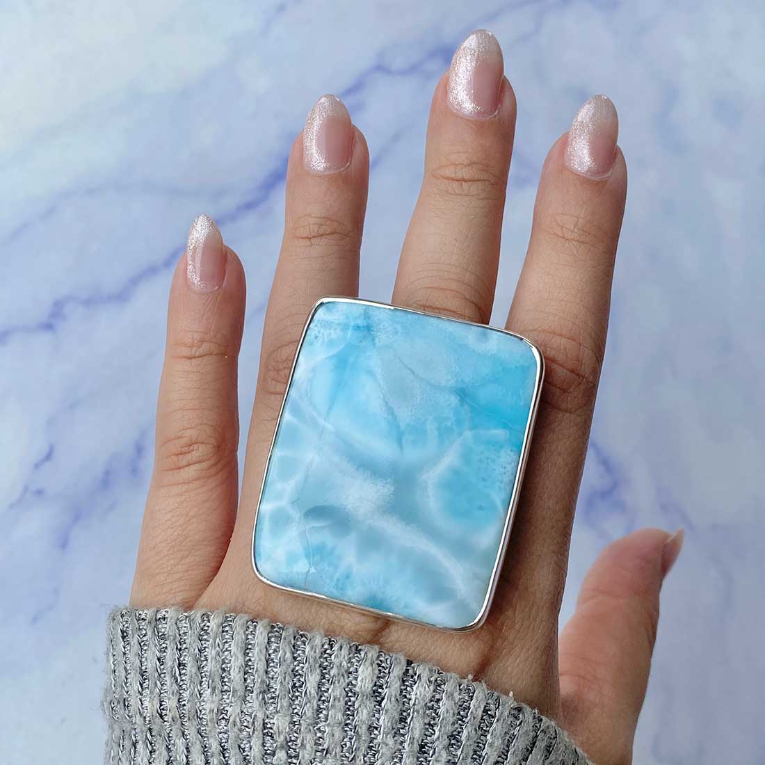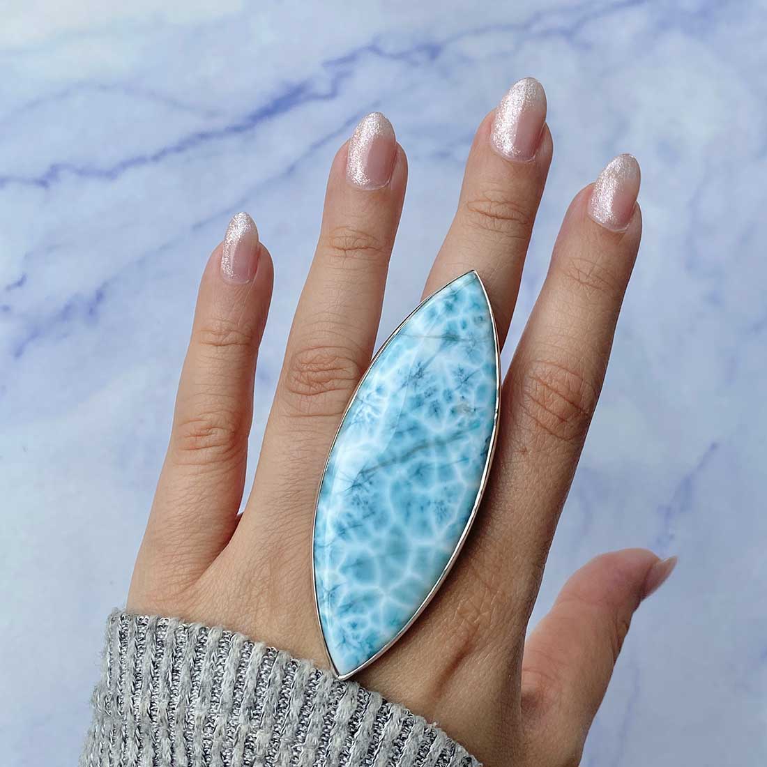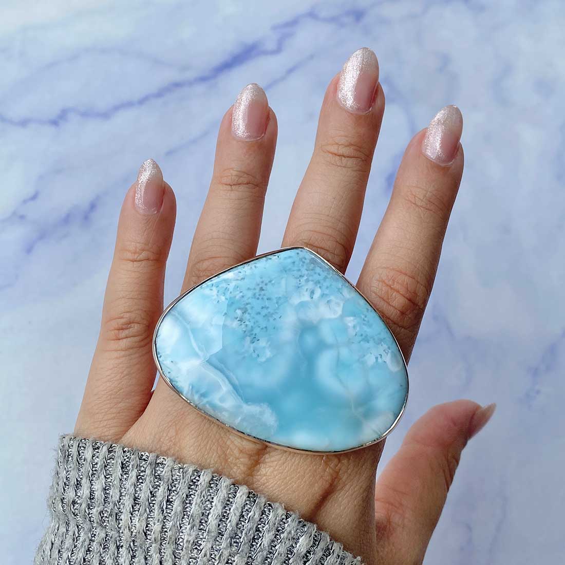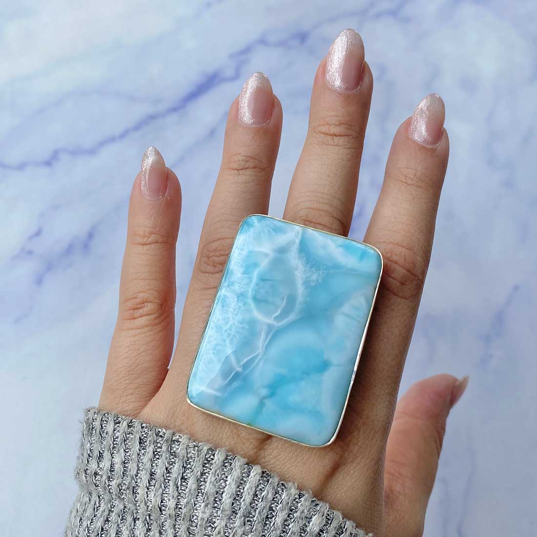 Larimar rings are thought to provide a number of therapeutic benefits. It is claimed to give relaxation and lessen tension and anxiety in the wearer by having a calming and soothing impact. Larimar's stunning blue hue is frequently connected to the sky and the ocean, fostering calm and peace. Some people think that wearing Larimar jewelry, such as Larimar bracelets, earrings, Larimar pendants, and necklaces, can aid in calming the mind and promoting inner peace.