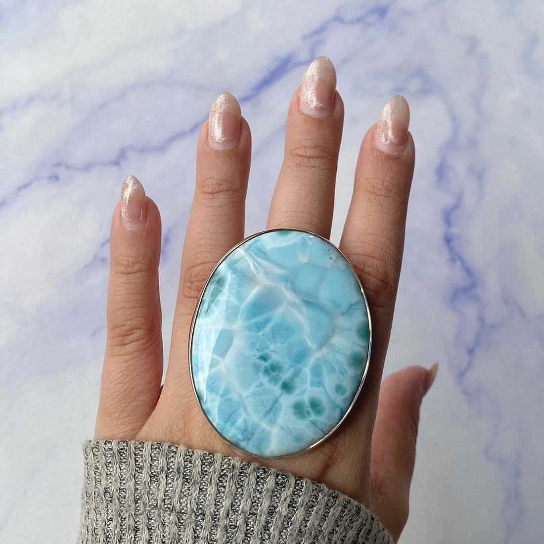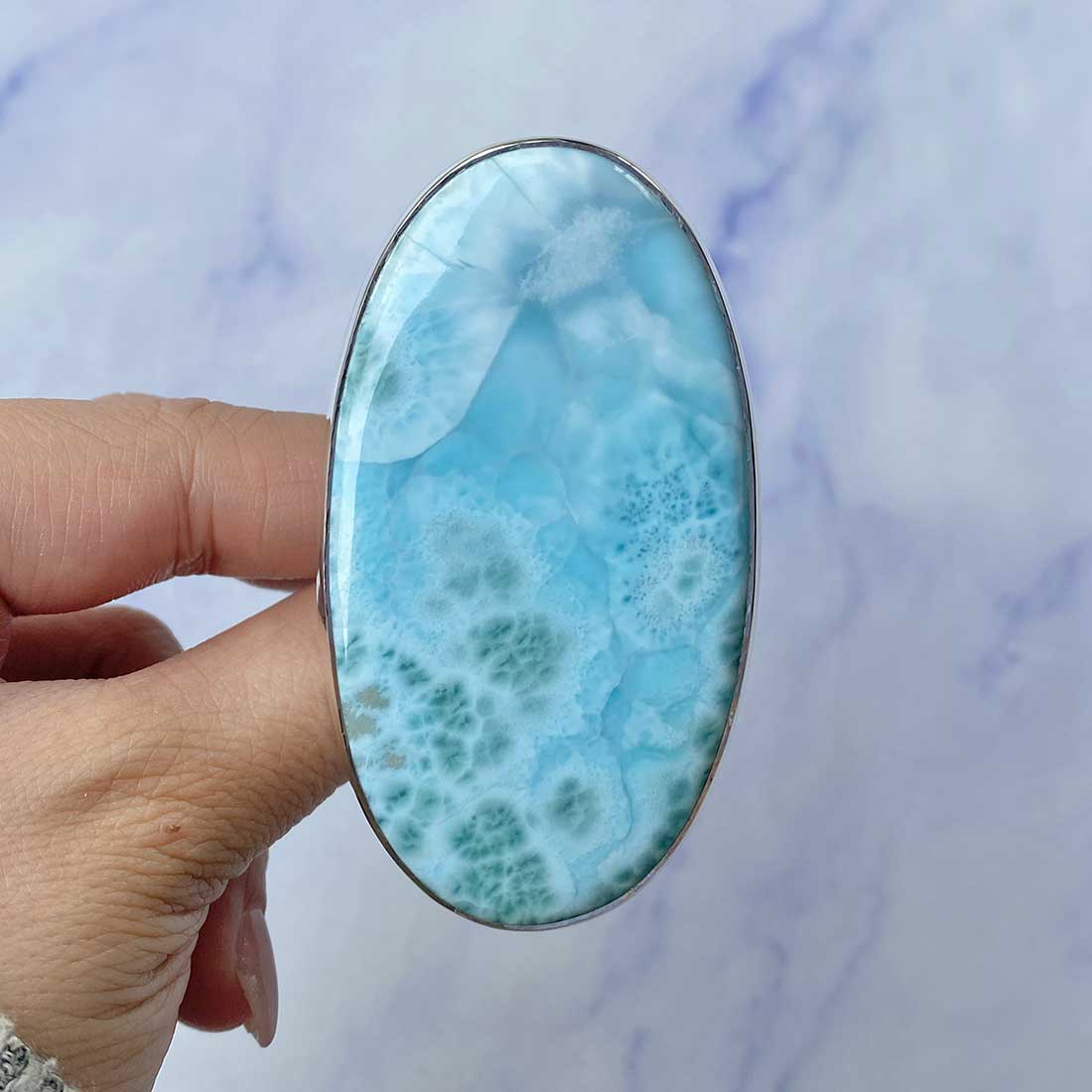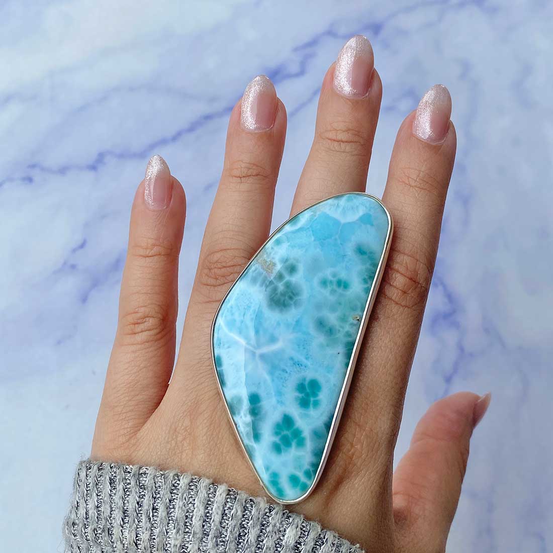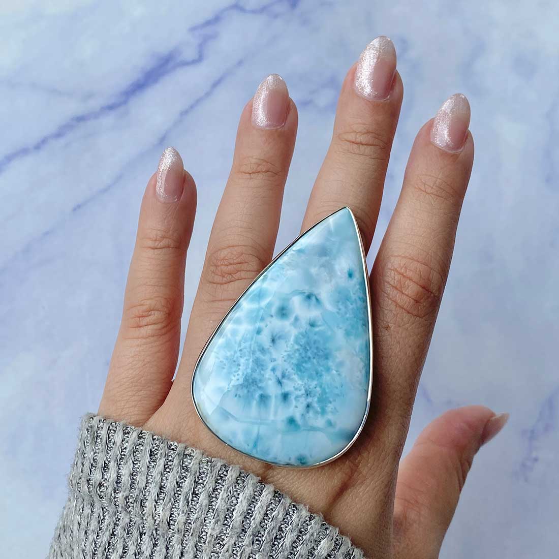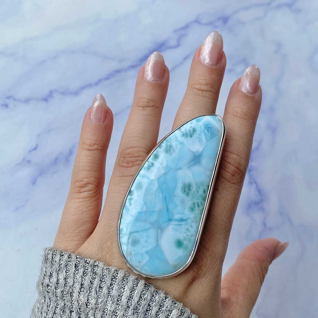 Larimar rings are thought to provide a number of therapeutic benefits. It is claimed to give relaxation and lessen tension and anxiety in the wearer by having a calming and soothing impact. Larimar's stunning blue hue is frequently connected to the sky and the ocean, fostering calm and peace. Some people think that wearing Larimar jewelry, such as Larimar bracelets, earrings, Larimar pendants, and necklaces, can aid in calming the mind and promoting inner peace.