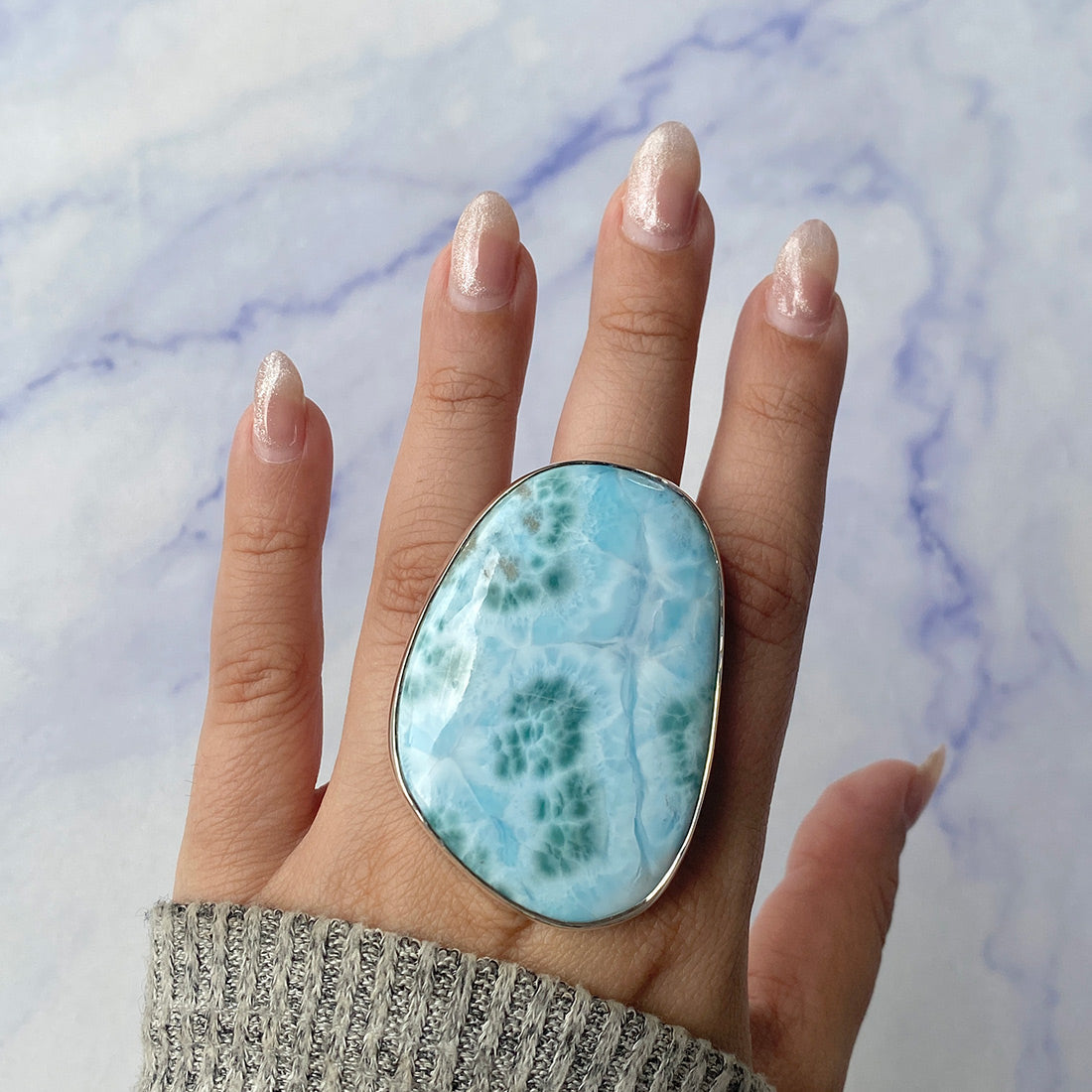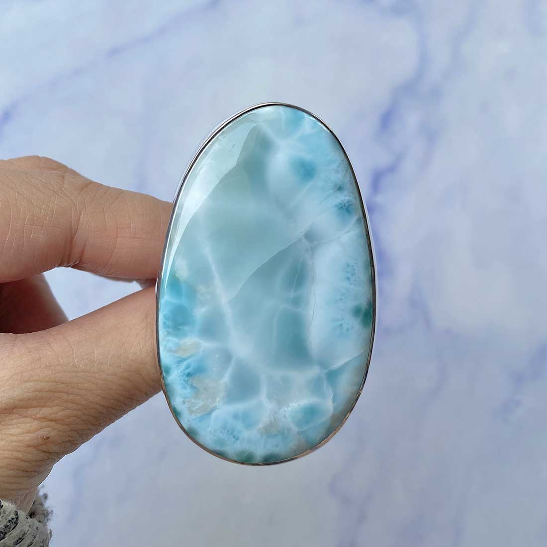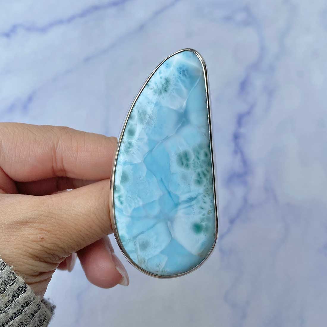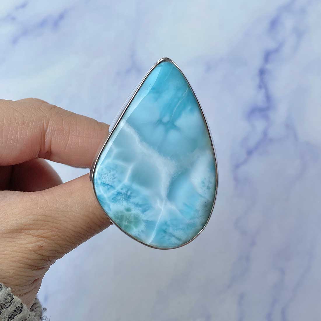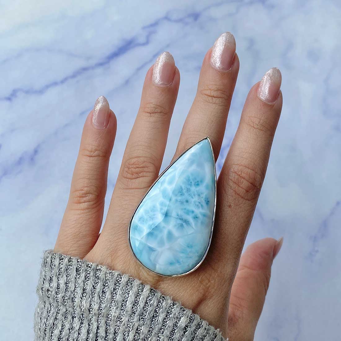 Larimar rings are thought to provide a number of therapeutic benefits. It is claimed to give relaxation and lessen tension and anxiety in the wearer by having a calming and soothing impact. Larimar's stunning blue hue is frequently connected to the sky and the ocean, fostering calm and peace. Some people think that wearing Larimar jewelry, such as Larimar bracelets, earrings, Larimar pendants, and necklaces, can aid in calming the mind and promoting inner peace.