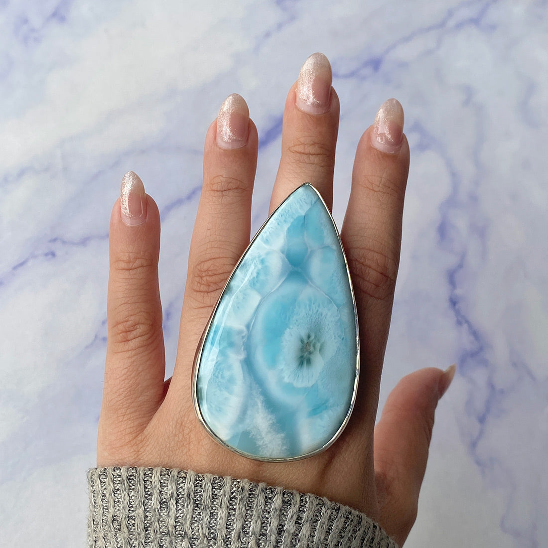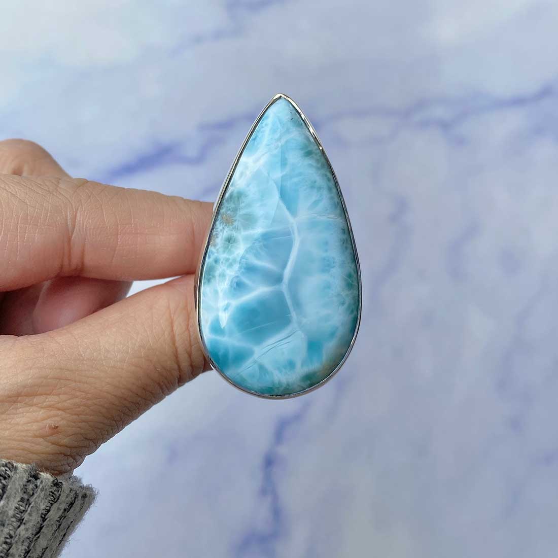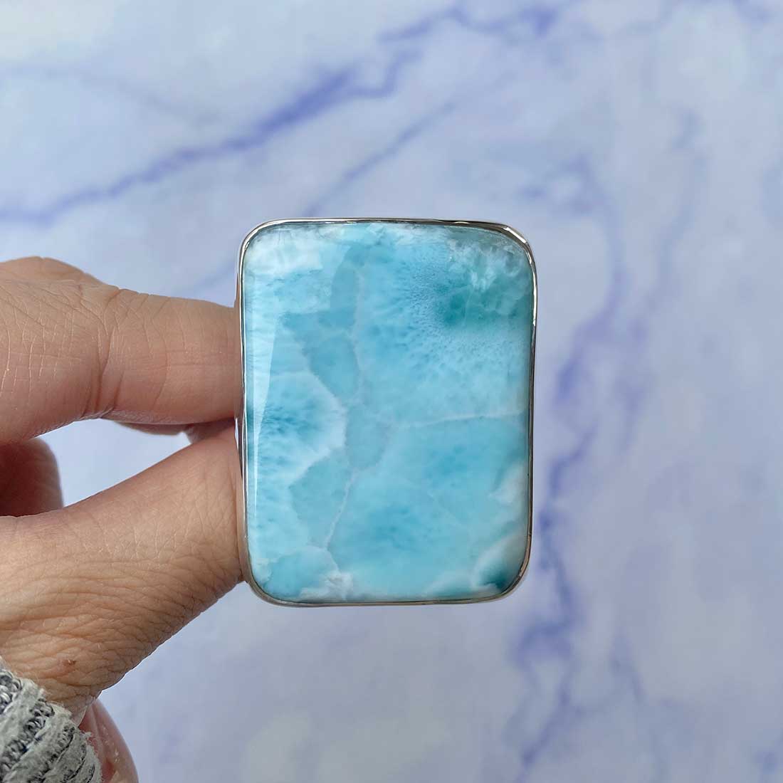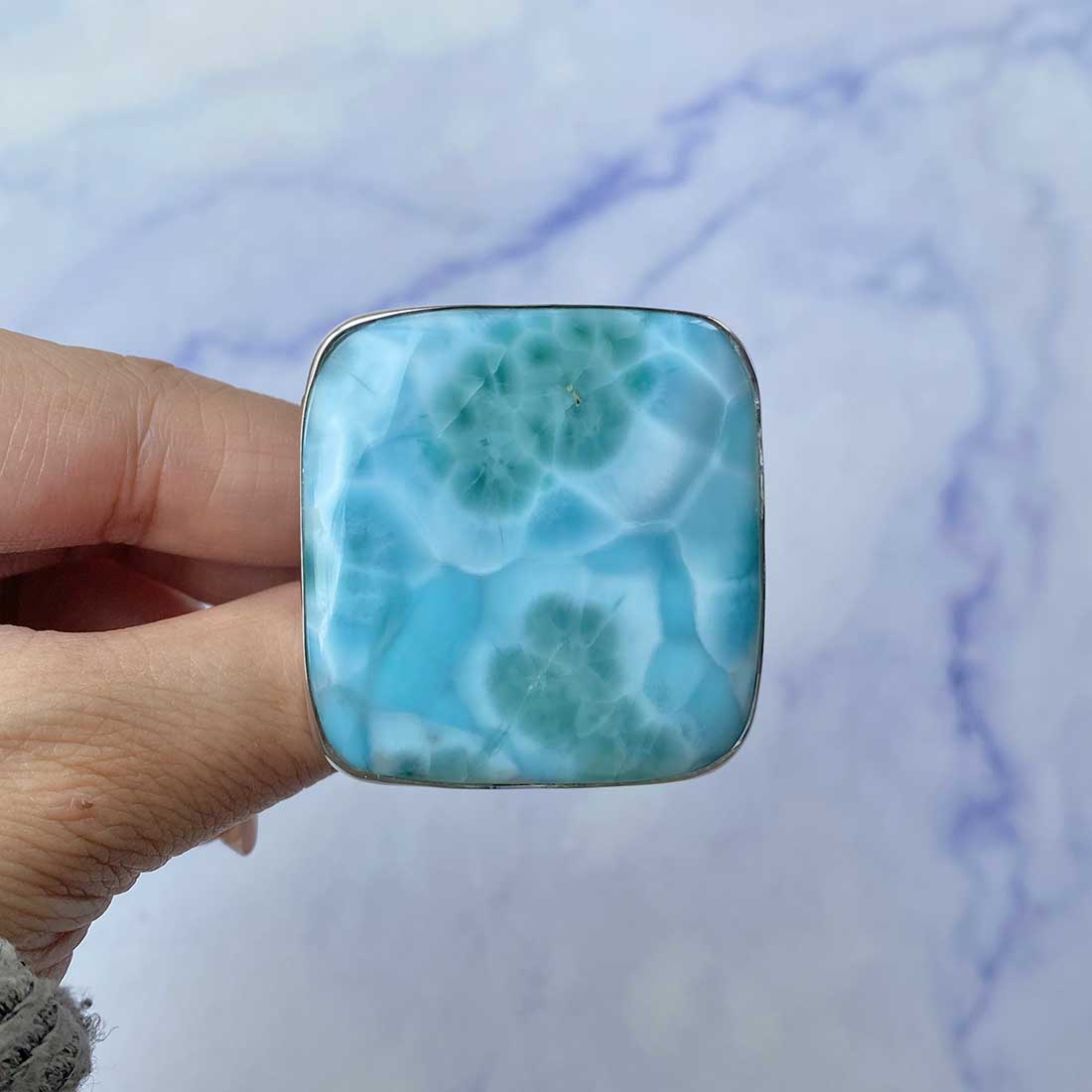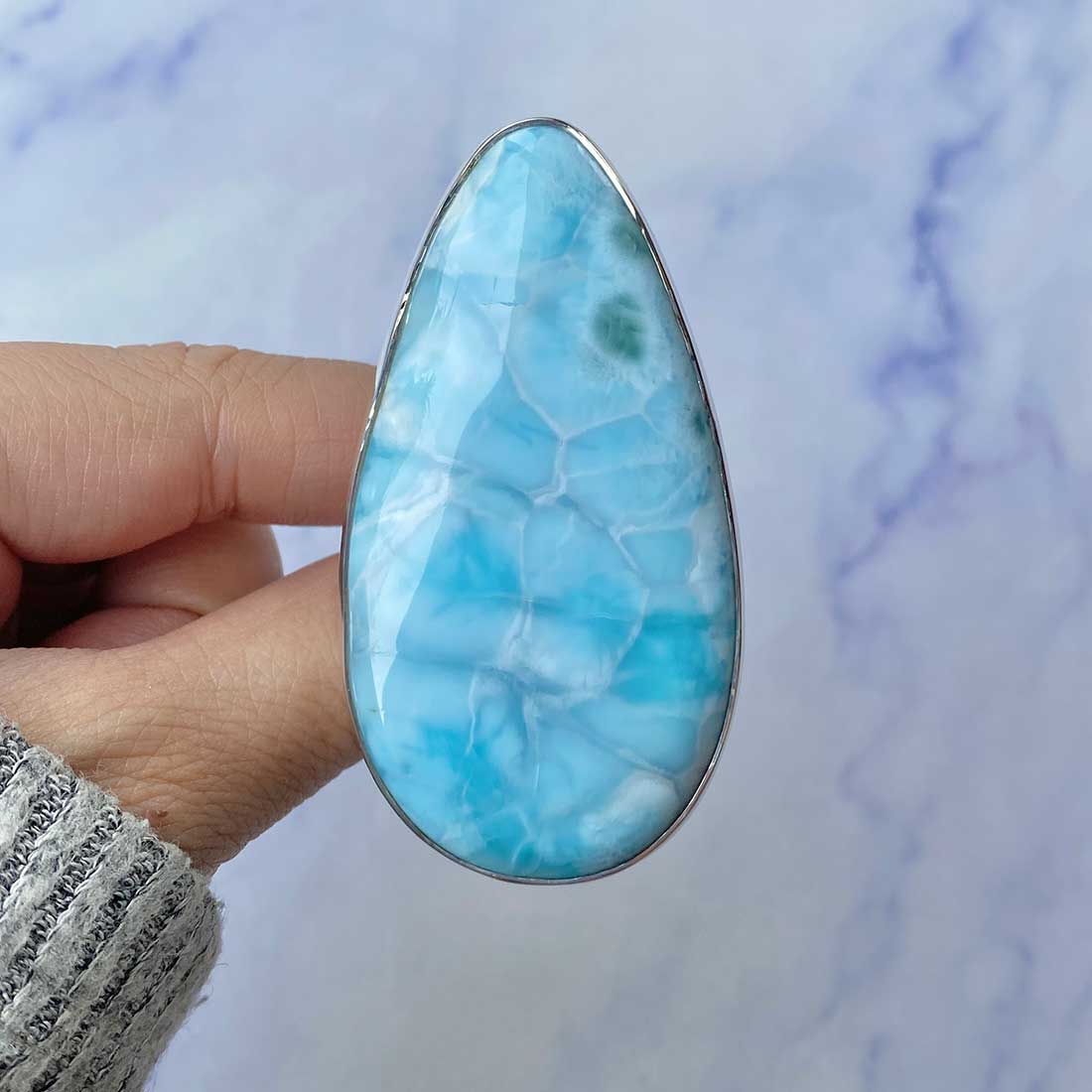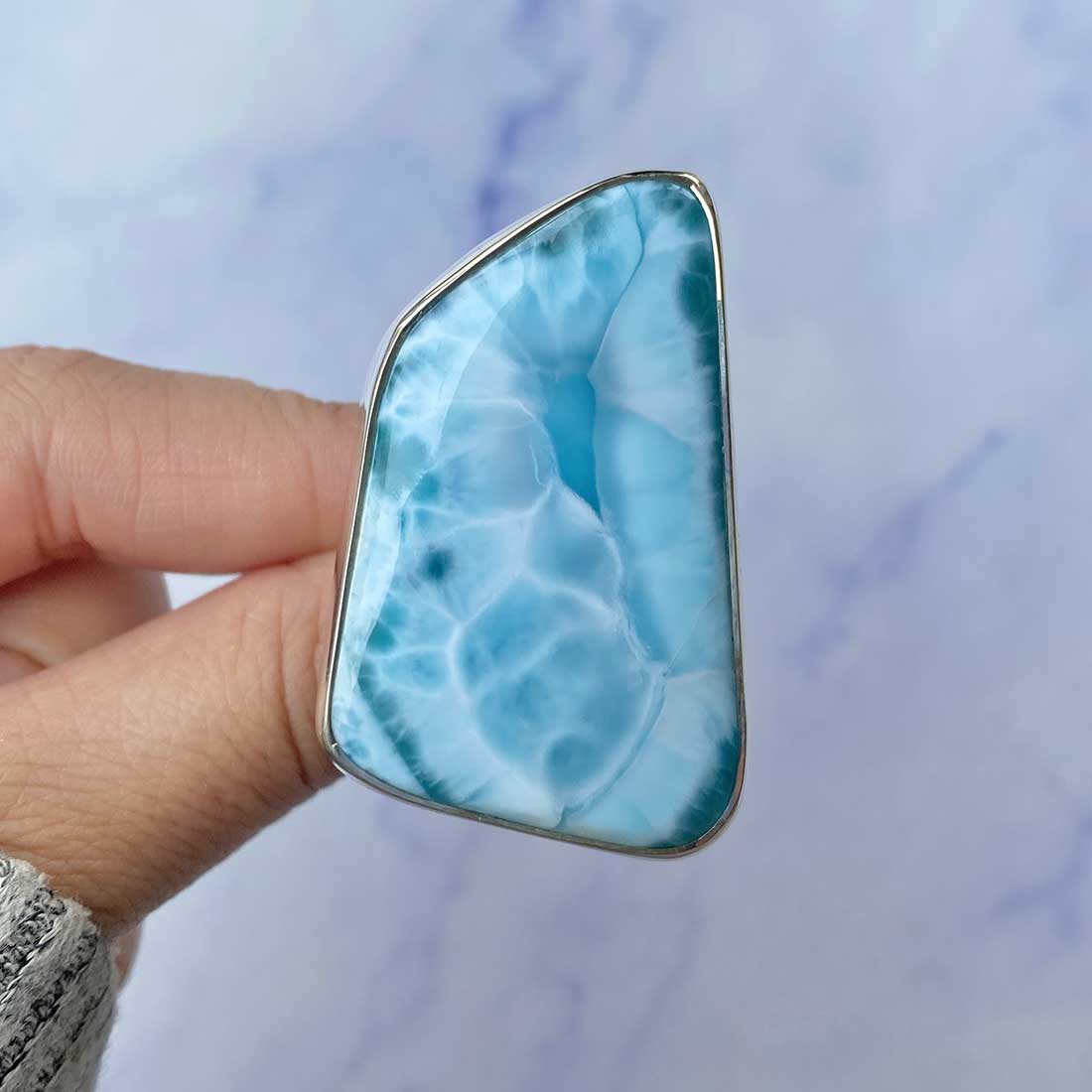Larimar rings are thought to provide a number of therapeutic benefits. It is claimed to give relaxation and lessen tension and anxiety in the wearer by having a calming and soothing impact. Larimar's stunning blue hue is frequently connected to the sky and the ocean, fostering calm and peace. Some people think that wearing Larimar jewelry, such as Larimar bracelets, earrings, Larimar pendants, and necklaces, can aid in calming the mind and promoting inner peace.