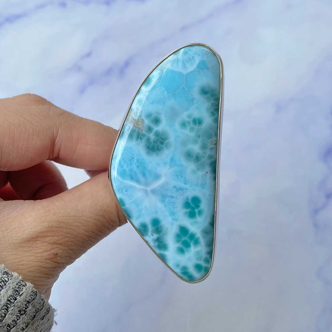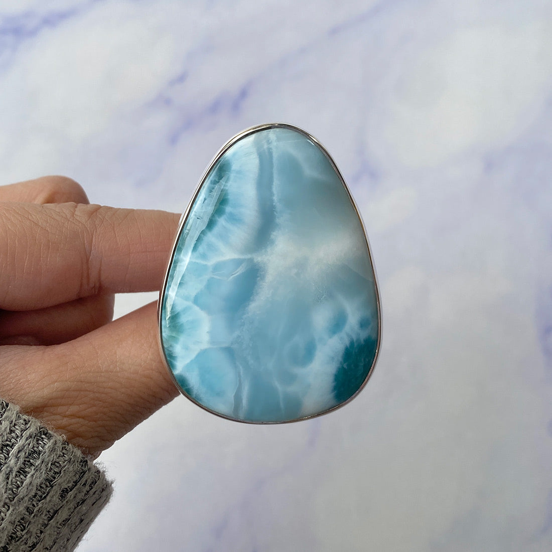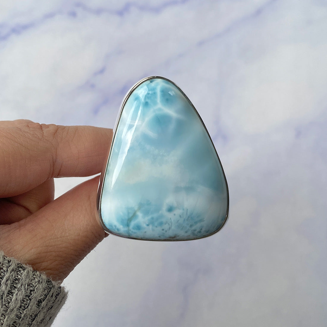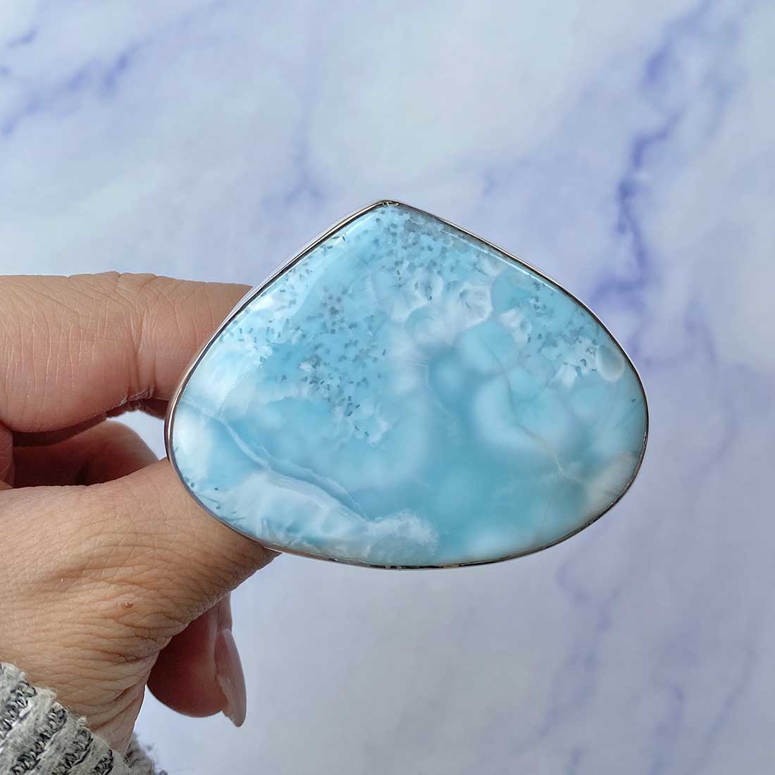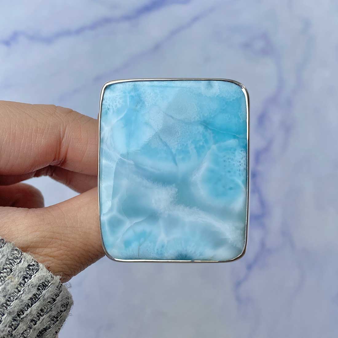 Larimar rings are thought to provide a number of therapeutic benefits. It is claimed to give relaxation and lessen tension and anxiety in the wearer by having a calming and soothing impact. Larimar's stunning blue hue is frequently connected to the sky and the ocean, fostering calm and peace. Some people think that wearing Larimar jewelry, such as Larimar bracelets, earrings, Larimar pendants, and necklaces, can aid in calming the mind and promoting inner peace.