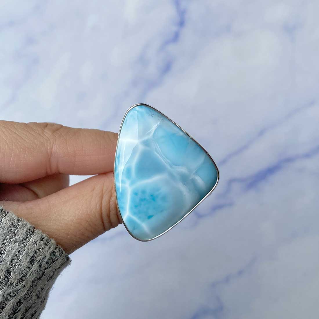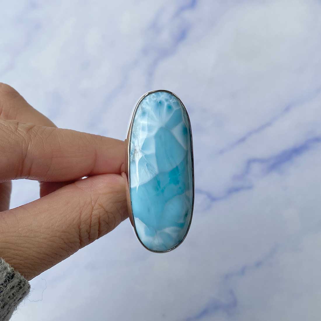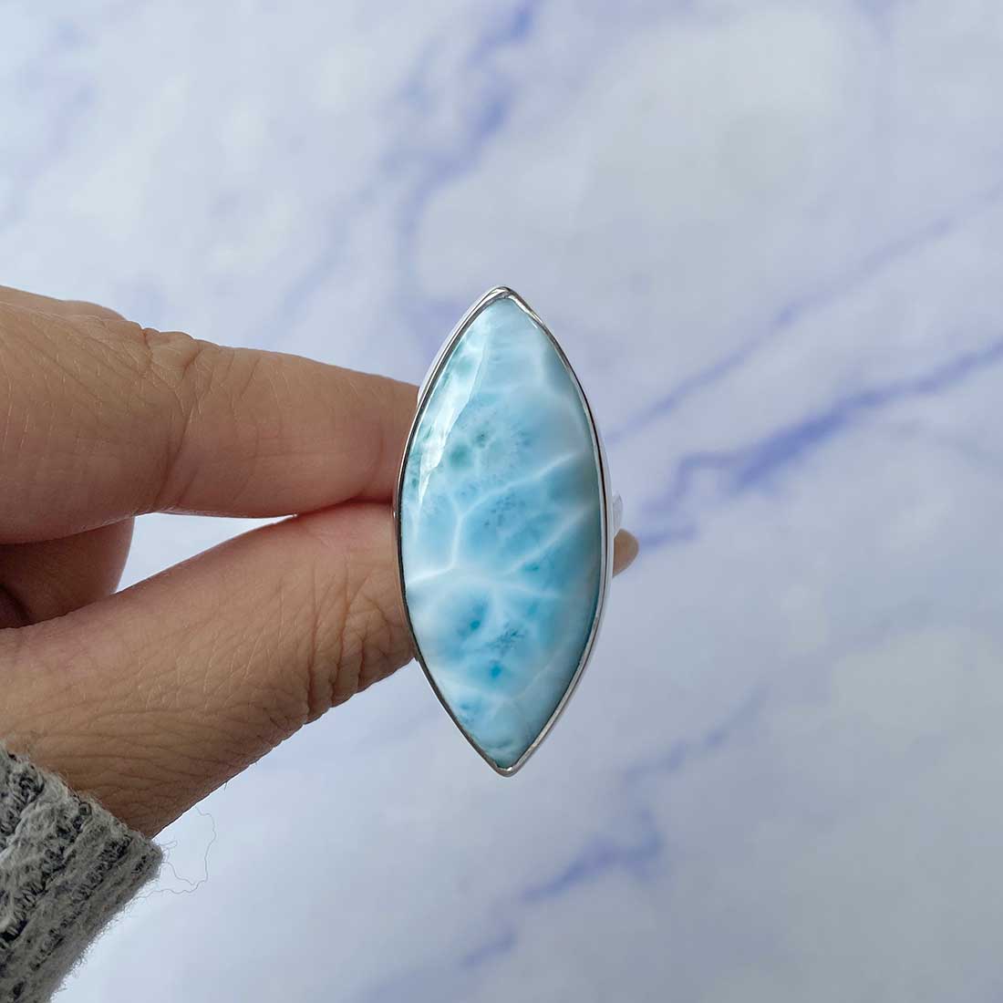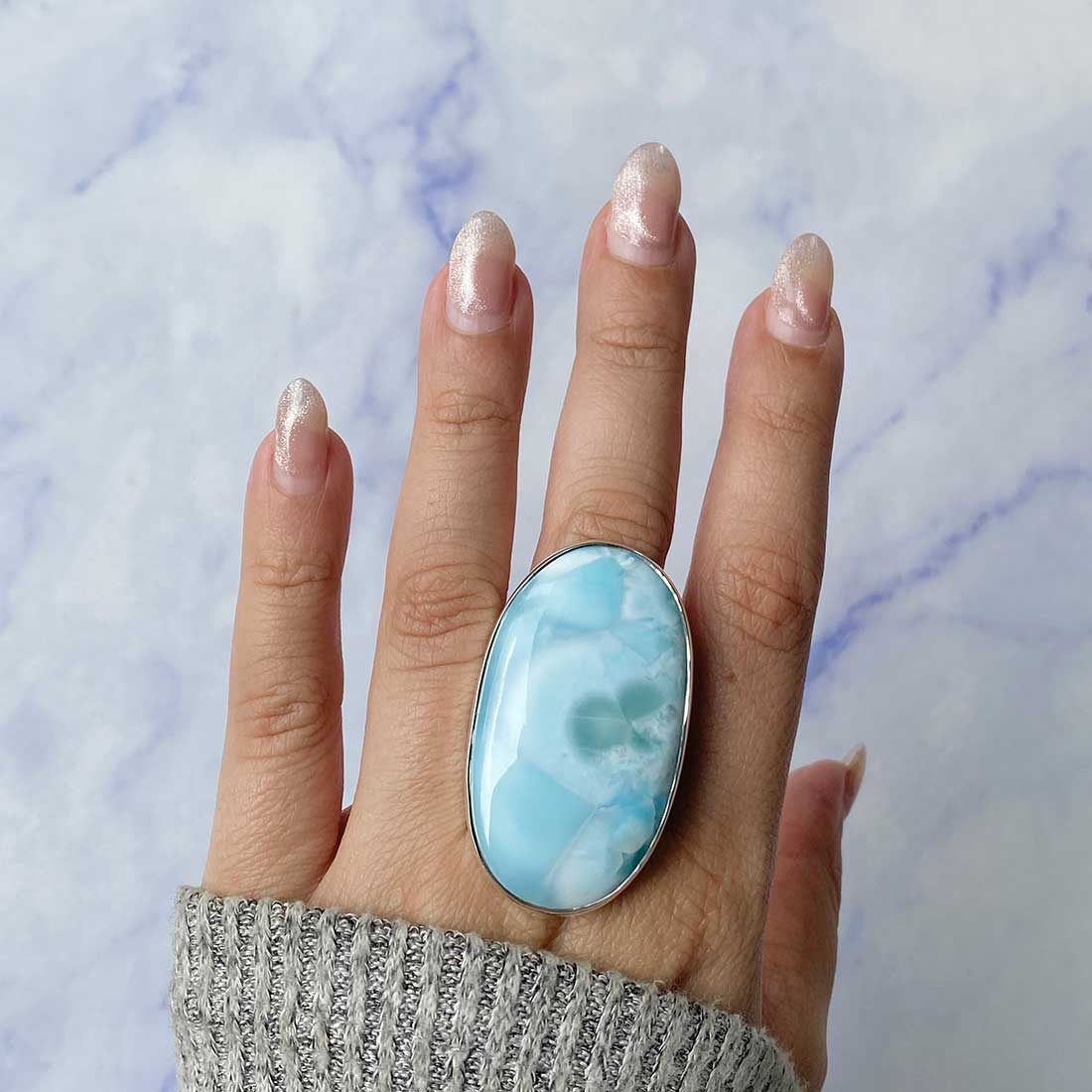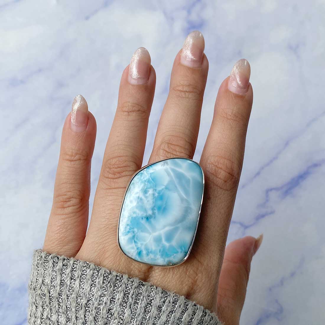 Larimar rings are thought to provide a number of therapeutic benefits. It is claimed to give relaxation and lessen tension and anxiety in the wearer by having a calming and soothing impact. Larimar's stunning blue hue is frequently connected to the sky and the ocean, fostering calm and peace. Some people think that wearing Larimar jewelry, such as Larimar bracelets, earrings, Larimar pendants, and necklaces, can aid in calming the mind and promoting inner peace.