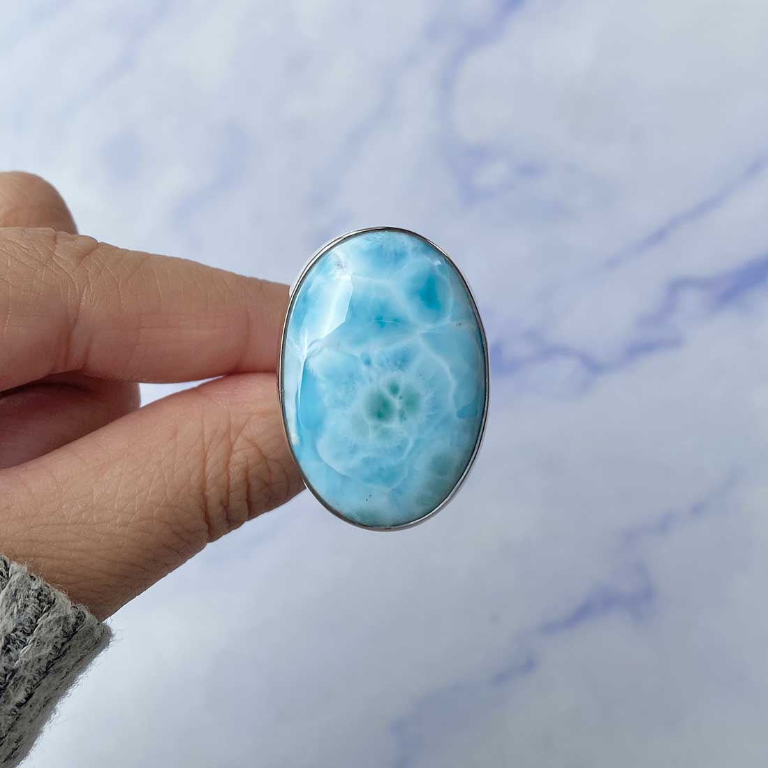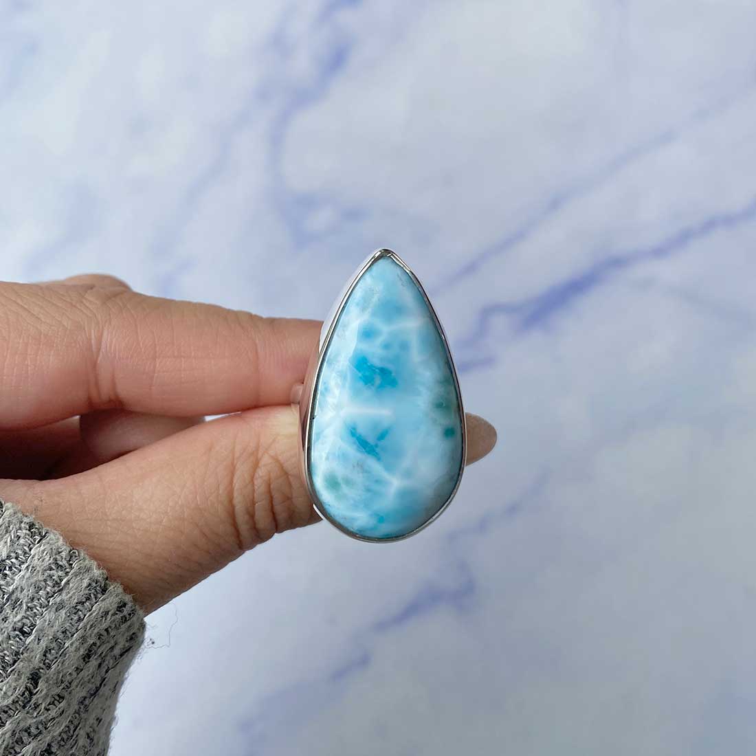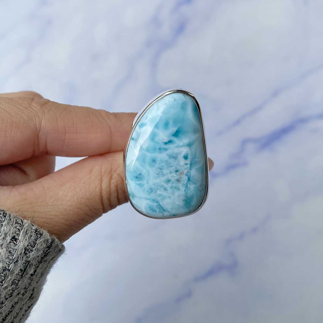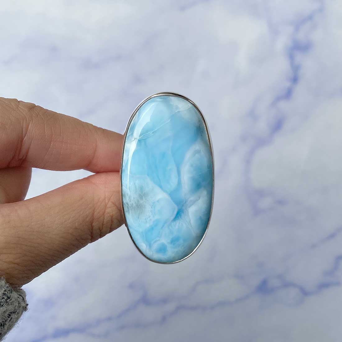 Larimar rings are thought to provide a number of therapeutic benefits. It is claimed to give relaxation and lessen tension and anxiety in the wearer by having a calming and soothing impact. Larimar's stunning blue hue is frequently connected to the sky and the ocean, fostering calm and peace. Some people think that wearing Larimar jewelry, such as Larimar bracelets, earrings, Larimar pendants, and necklaces, can aid in calming the mind and promoting inner peace.