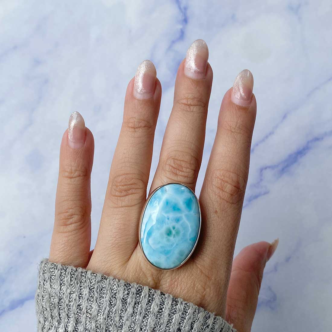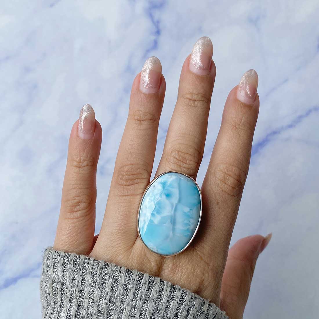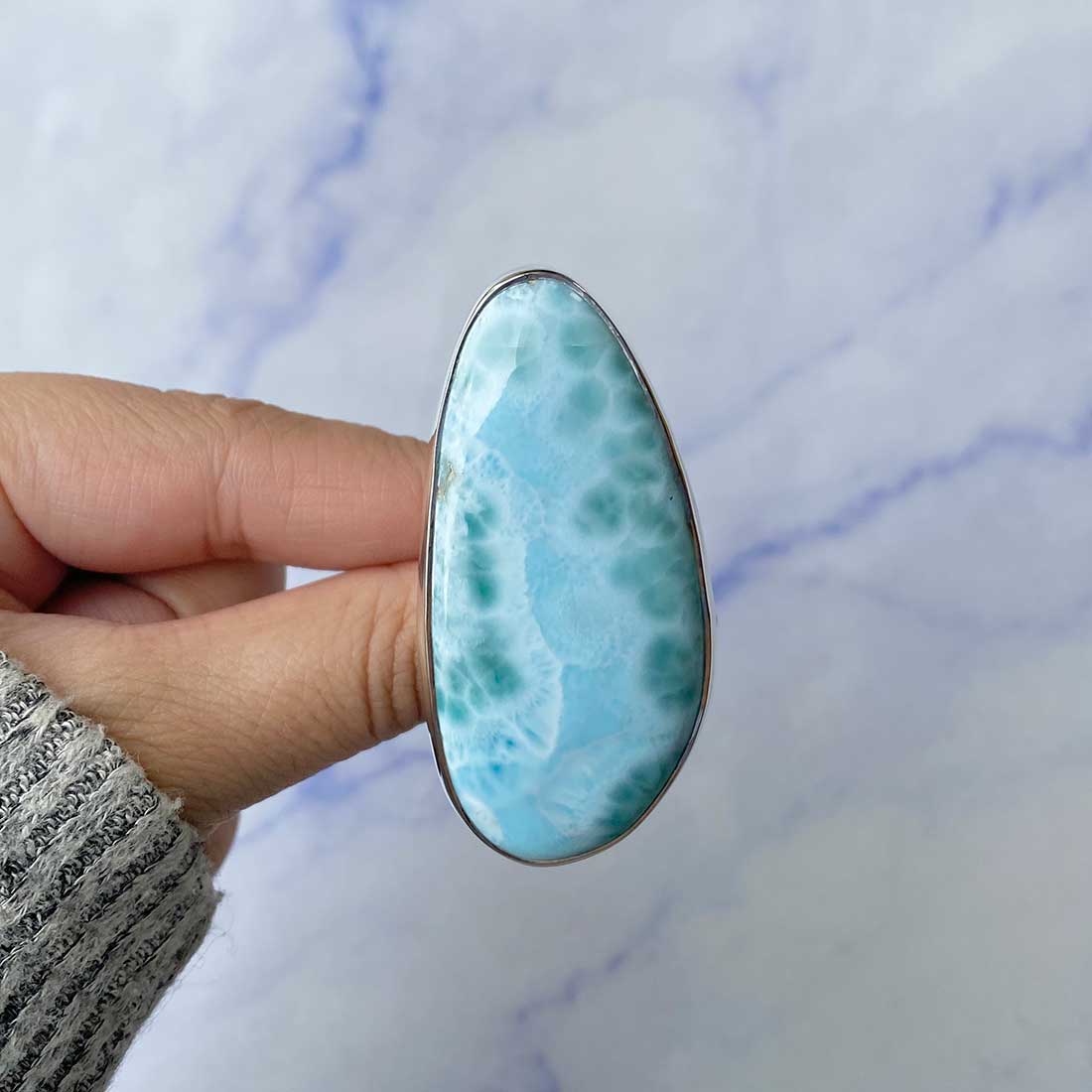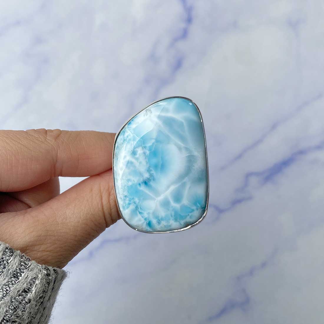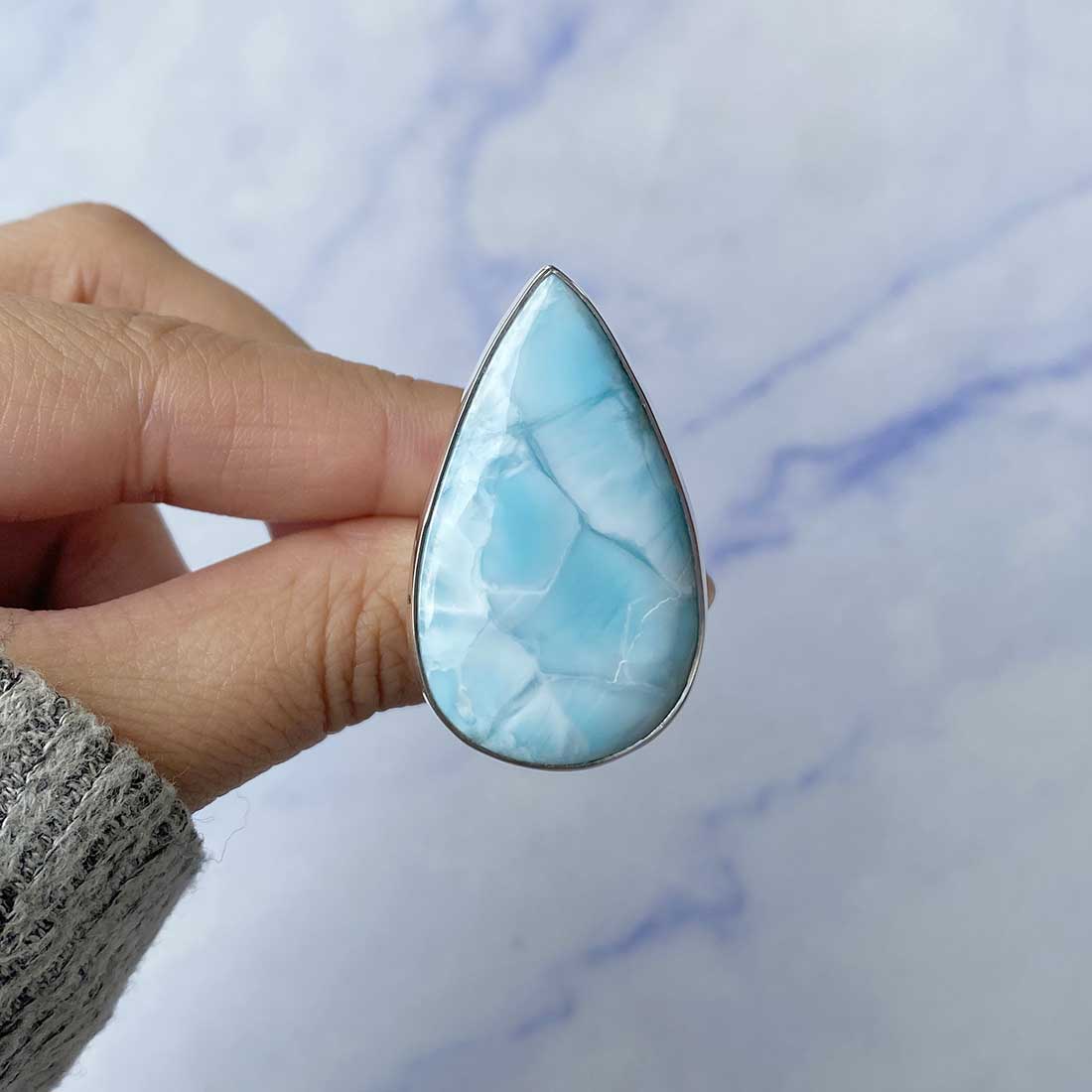 Larimar rings are thought to provide a number of therapeutic benefits. It is claimed to give relaxation and lessen tension and anxiety in the wearer by having a calming and soothing impact. Larimar's stunning blue hue is frequently connected to the sky and the ocean, fostering calm and peace. Some people think that wearing Larimar jewelry, such as Larimar bracelets, earrings, Larimar pendants, and necklaces, can aid in calming the mind and promoting inner peace.