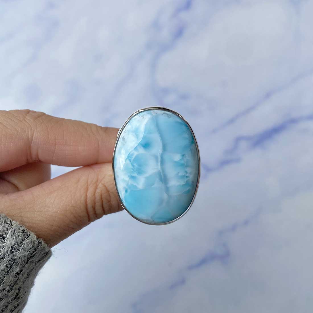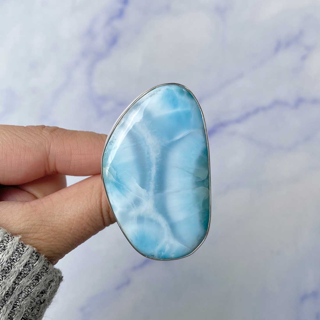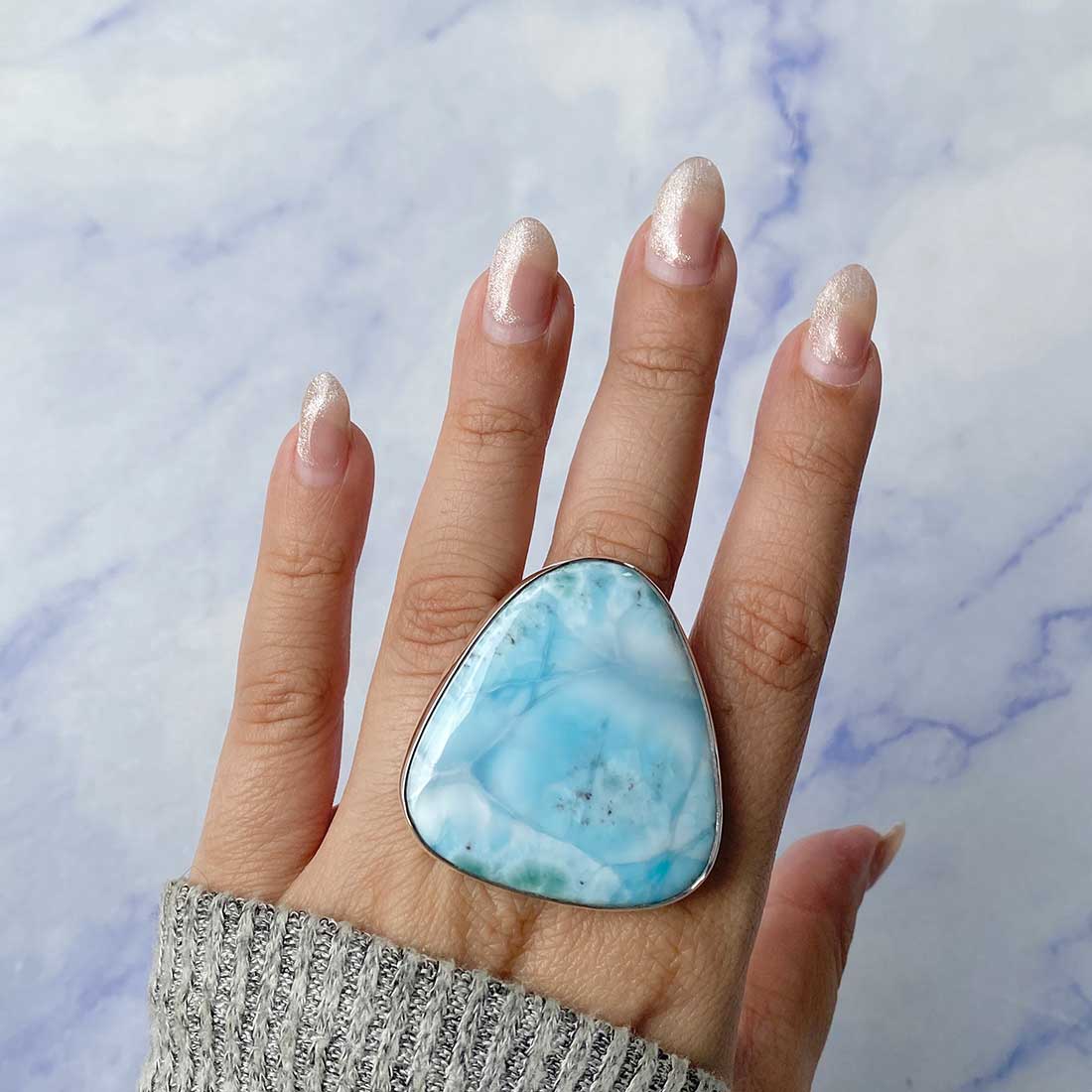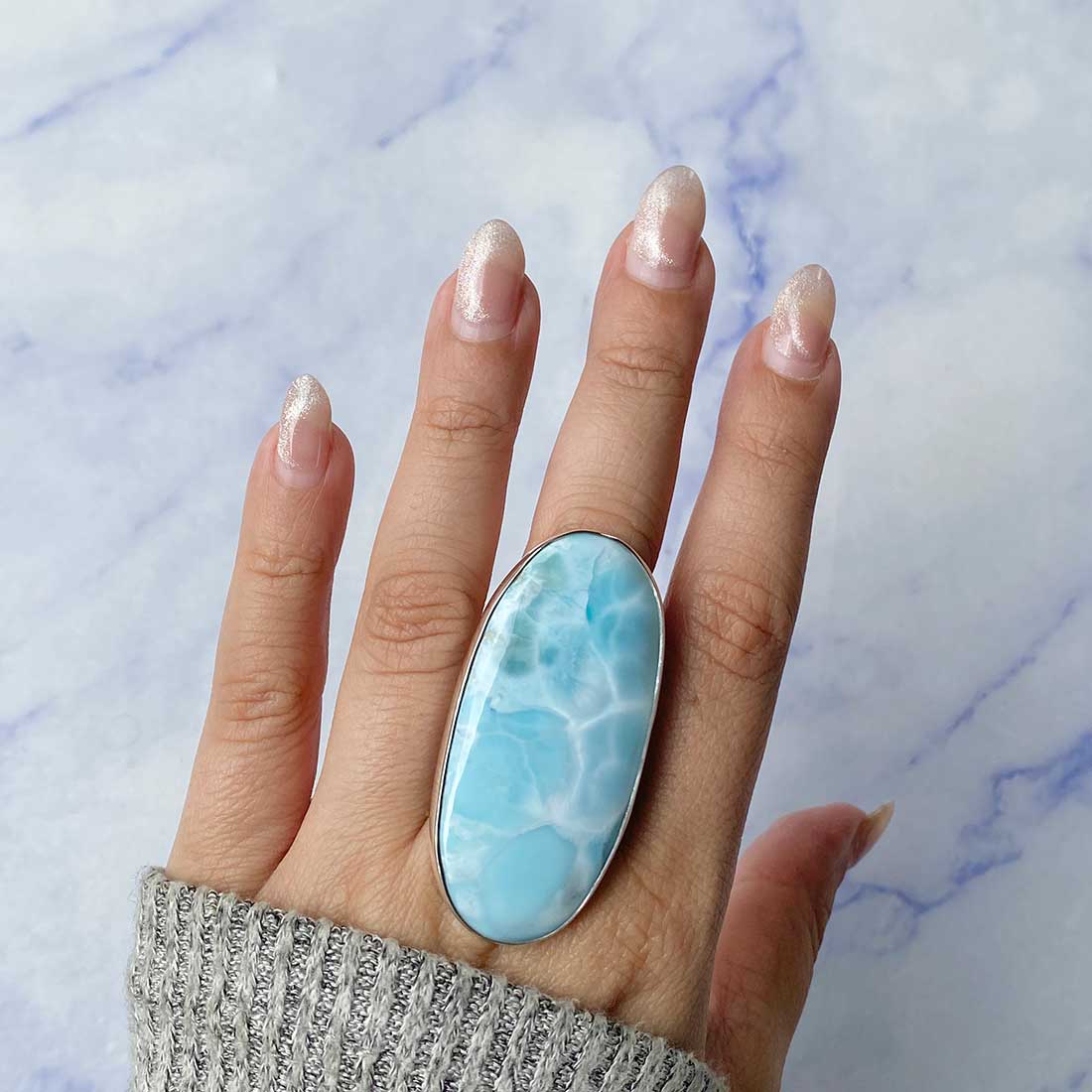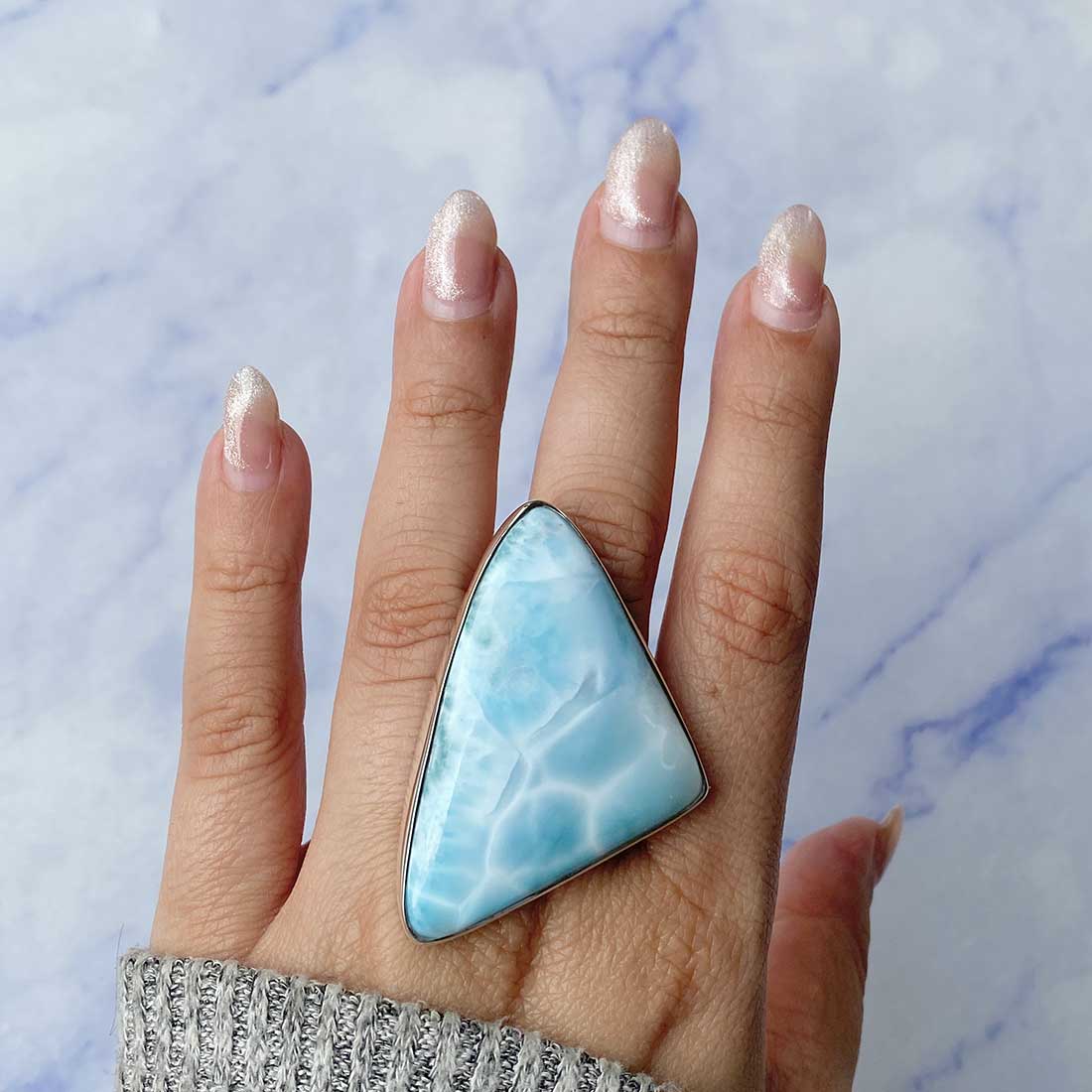 Larimar rings are thought to provide a number of therapeutic benefits. It is claimed to give relaxation and lessen tension and anxiety in the wearer by having a calming and soothing impact. Larimar's stunning blue hue is frequently connected to the sky and the ocean, fostering calm and peace. Some people think that wearing Larimar jewelry, such as Larimar bracelets, earrings, Larimar pendants, and necklaces, can aid in calming the mind and promoting inner peace.
