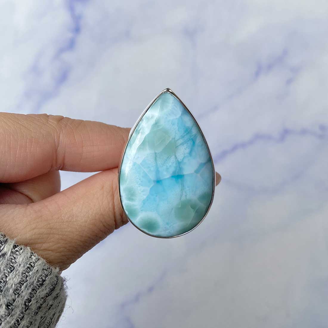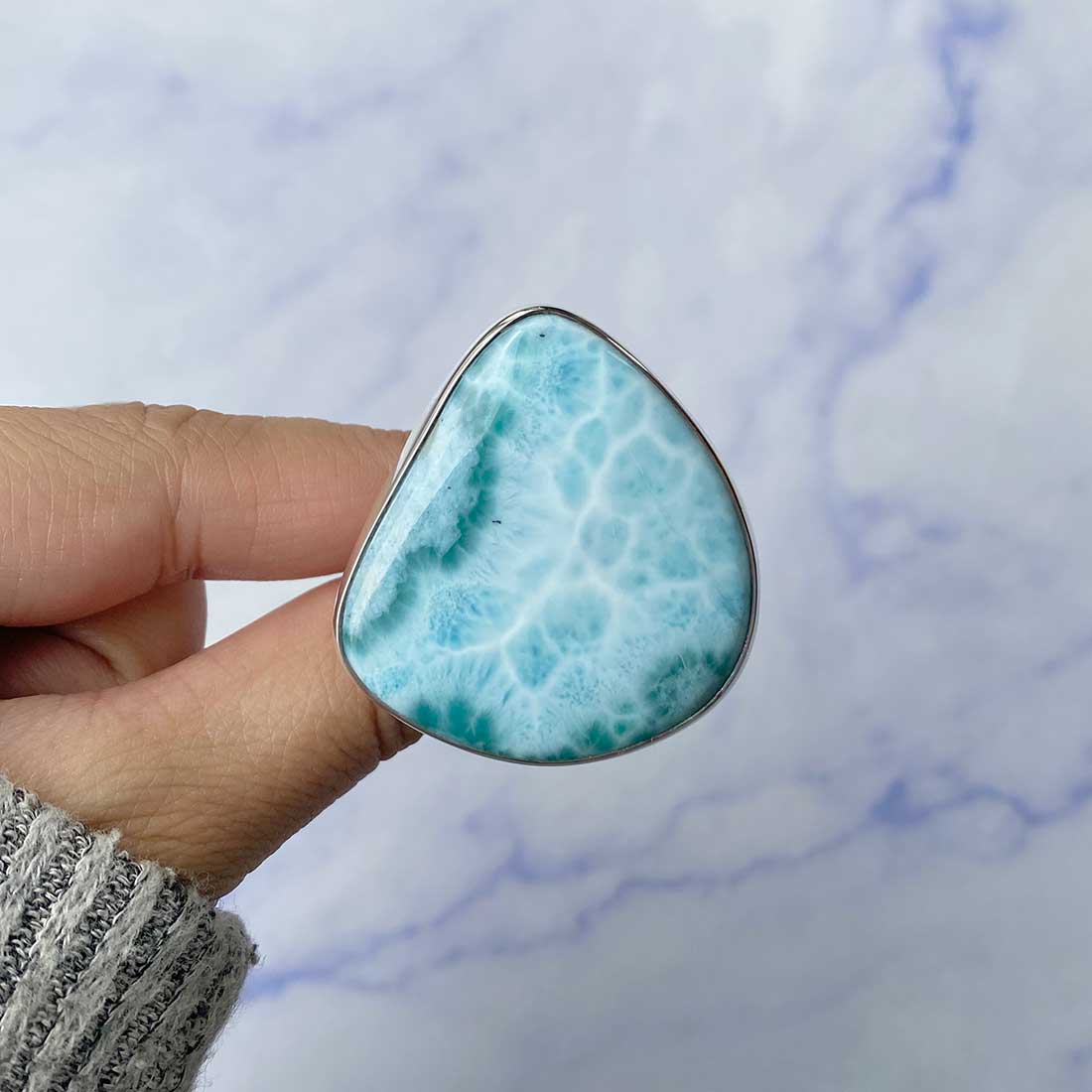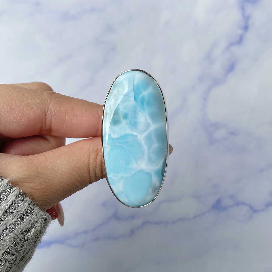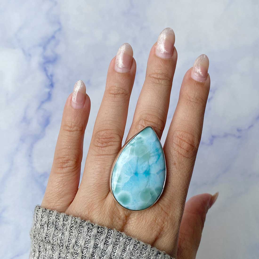 Larimar rings are thought to provide a number of therapeutic benefits. It is claimed to give relaxation and lessen tension and anxiety in the wearer by having a calming and soothing impact. Larimar's stunning blue hue is frequently connected to the sky and the ocean, fostering calm and peace. Some people think that wearing Larimar jewelry, such as Larimar bracelets, earrings, Larimar pendants, and necklaces, can aid in calming the mind and promoting inner peace.