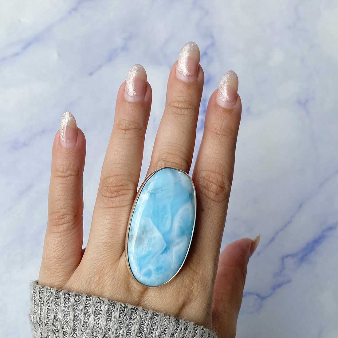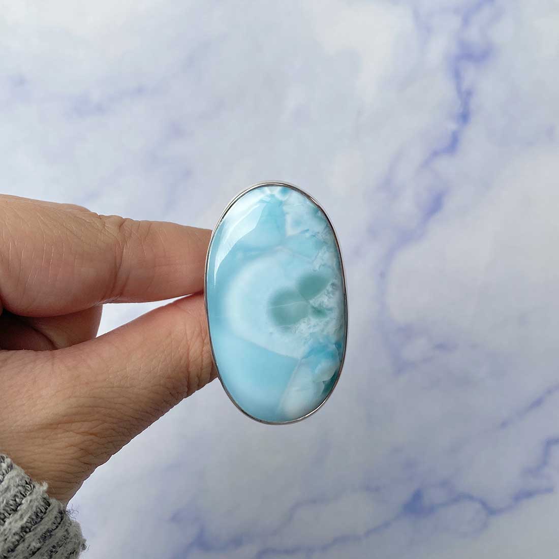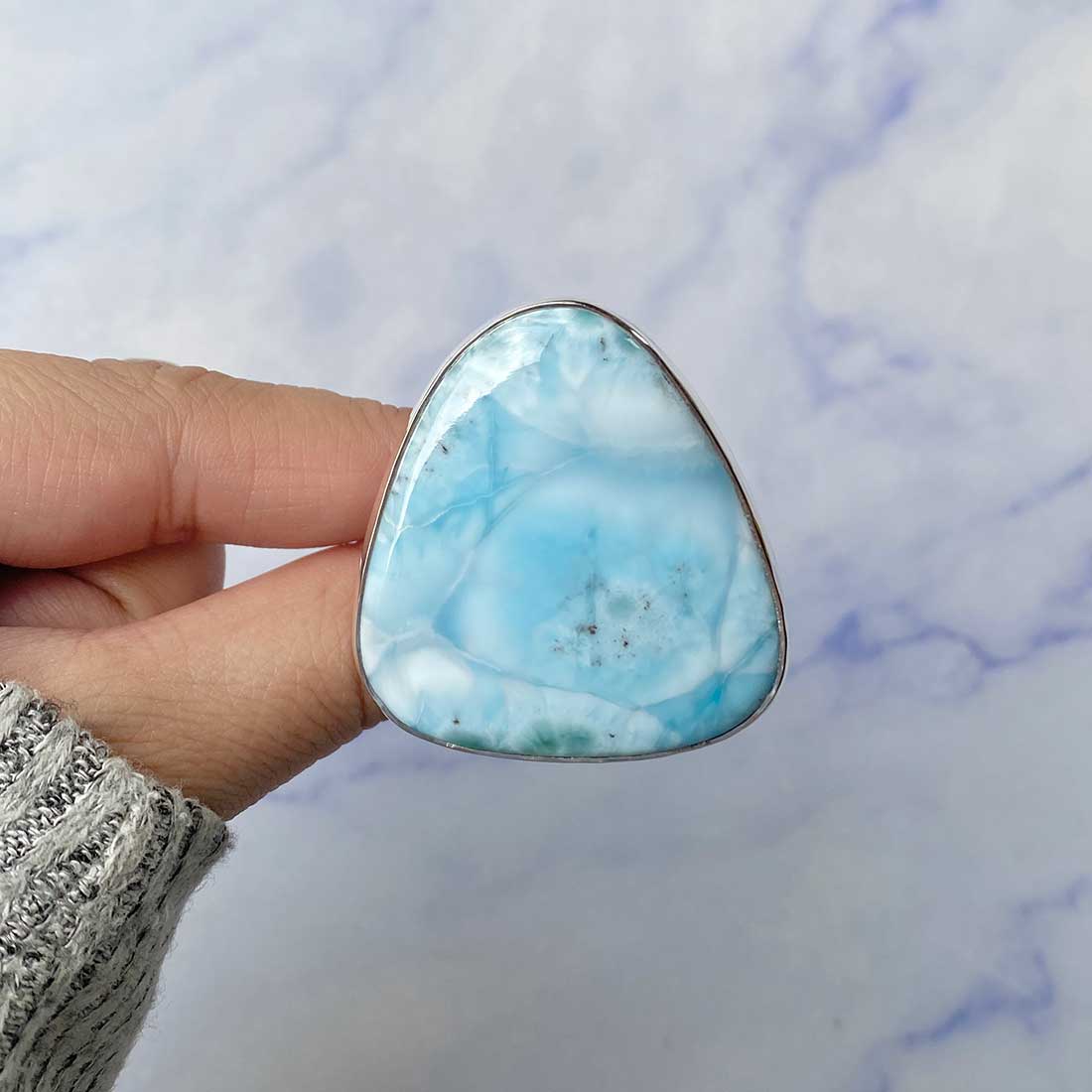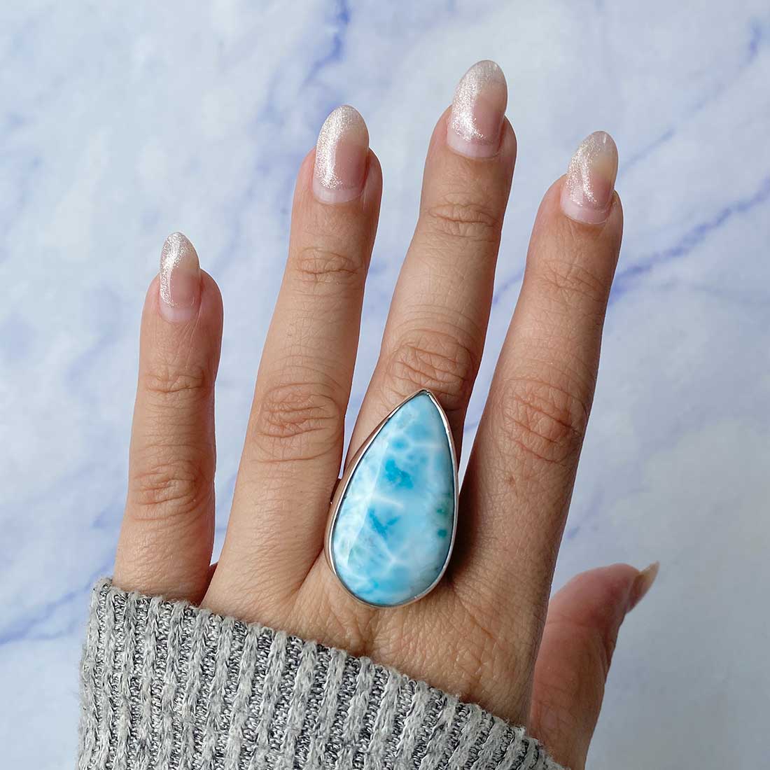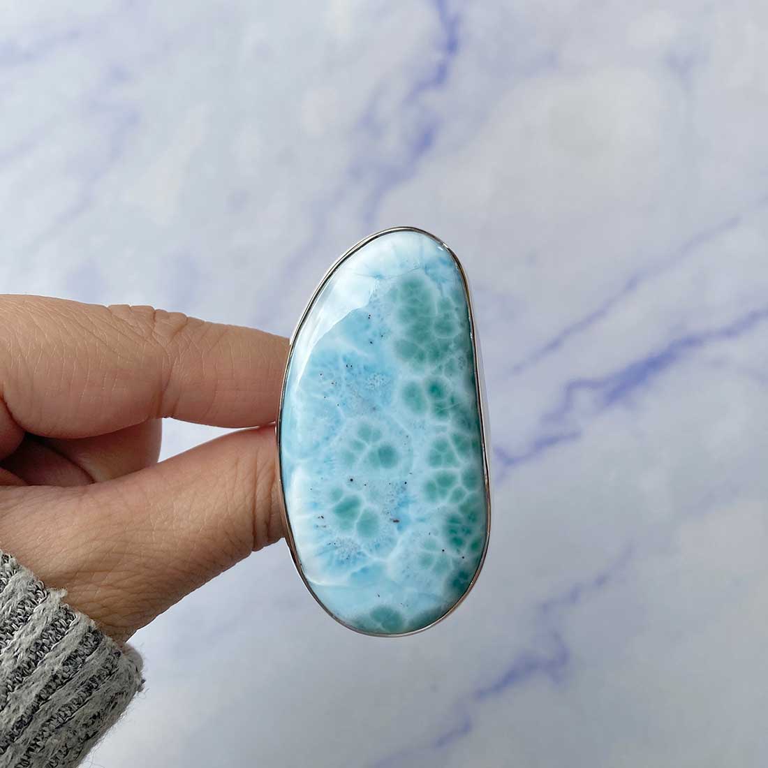 Larimar rings are thought to provide a number of therapeutic benefits. It is claimed to give relaxation and lessen tension and anxiety in the wearer by having a calming and soothing impact. Larimar's stunning blue hue is frequently connected to the sky and the ocean, fostering calm and peace. Some people think that wearing Larimar jewelry, such as Larimar bracelets, earrings, Larimar pendants, and necklaces, can aid in calming the mind and promoting inner peace.