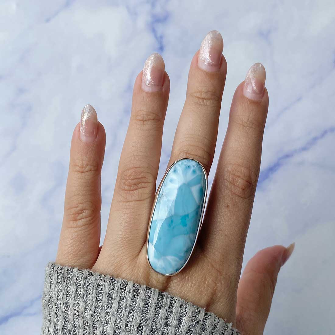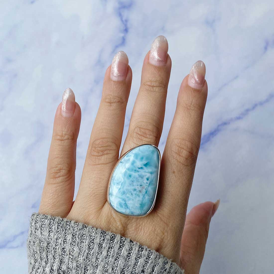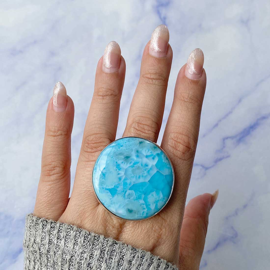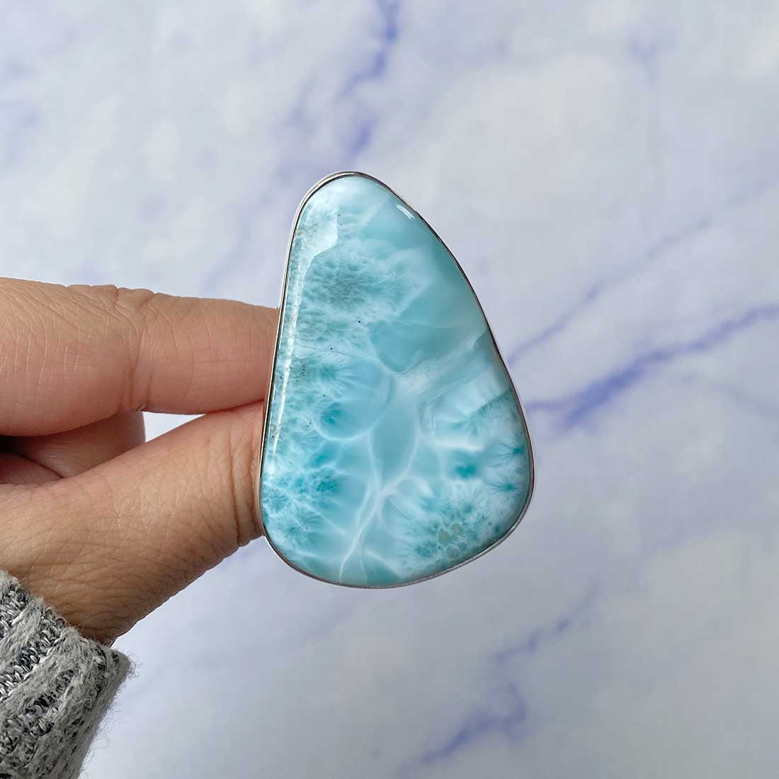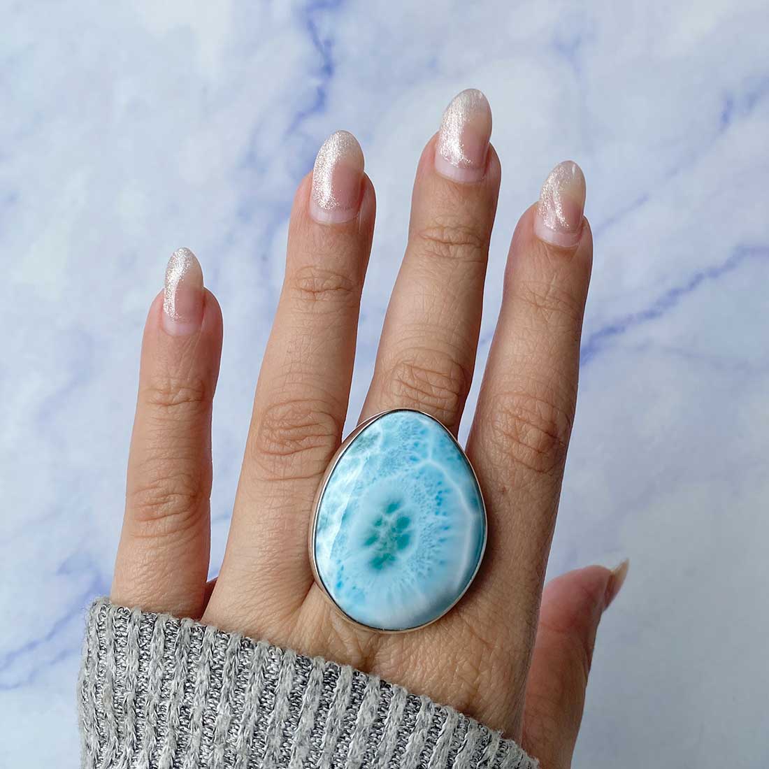 Larimar rings are thought to provide a number of therapeutic benefits. It is claimed to give relaxation and lessen tension and anxiety in the wearer by having a calming and soothing impact. Larimar's stunning blue hue is frequently connected to the sky and the ocean, fostering calm and peace. Some people think that wearing Larimar jewelry, such as Larimar bracelets, earrings, Larimar pendants, and necklaces, can aid in calming the mind and promoting inner peace.