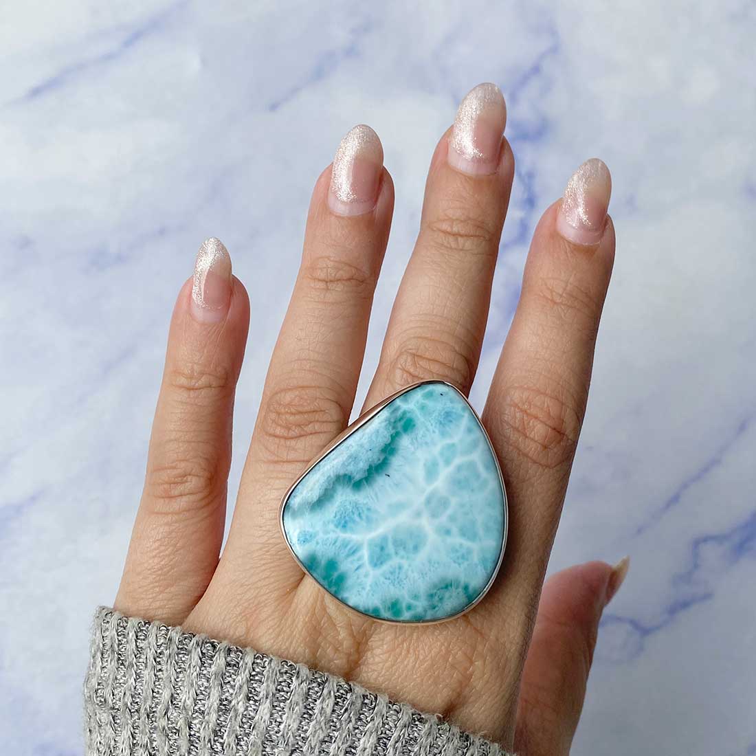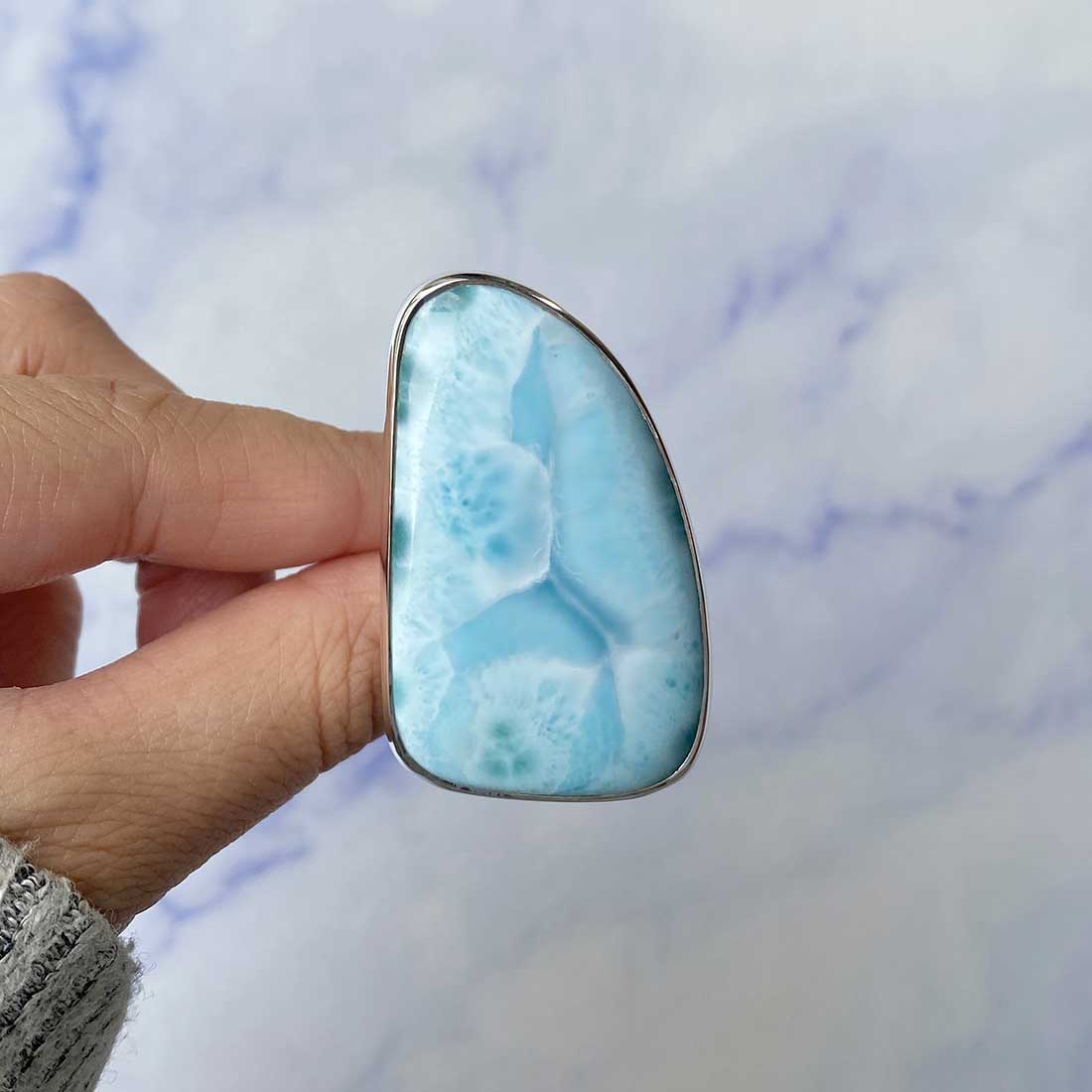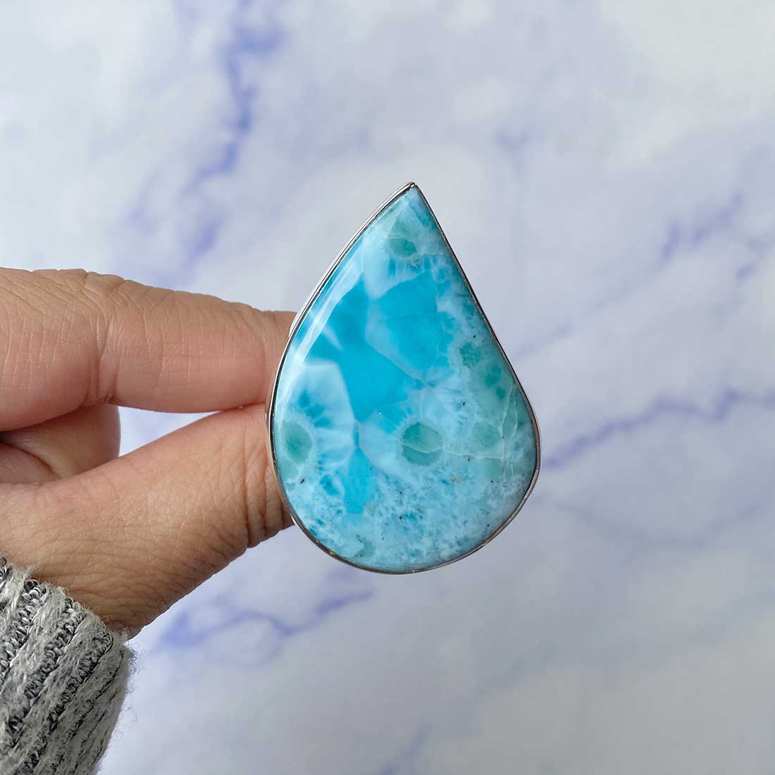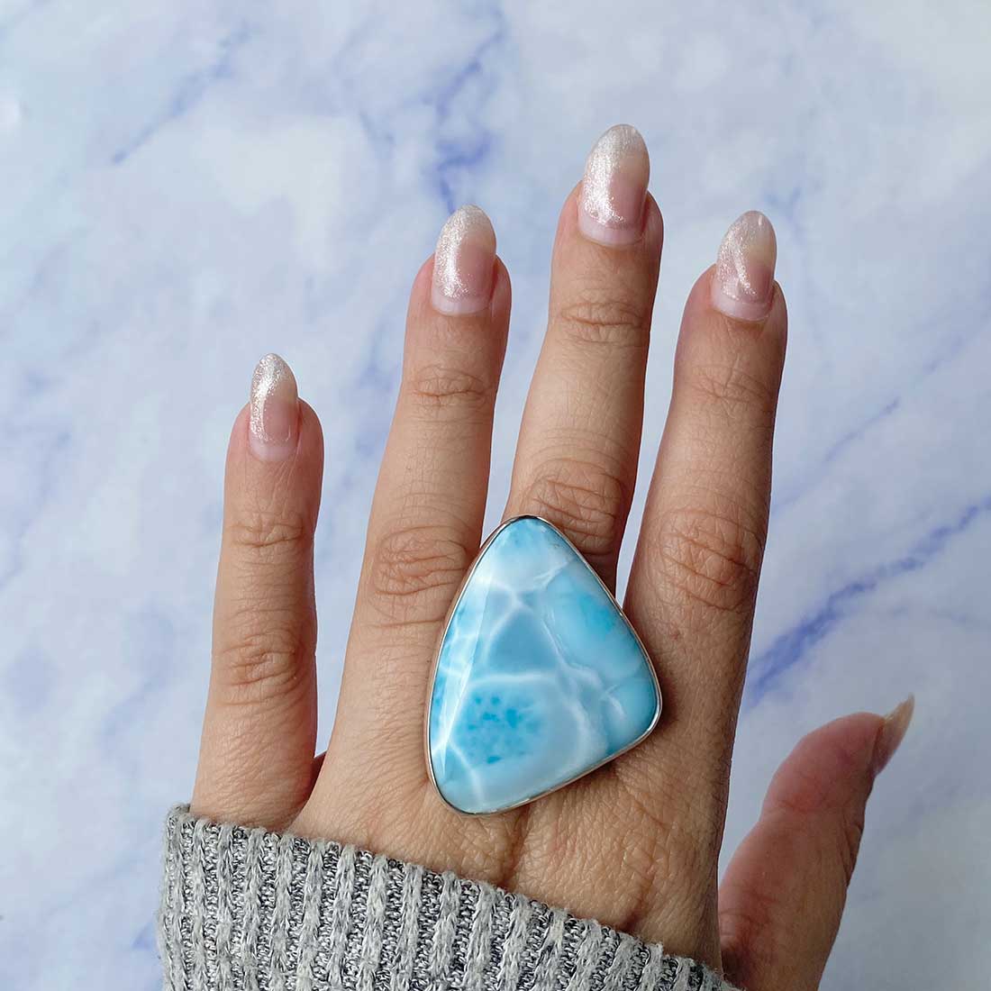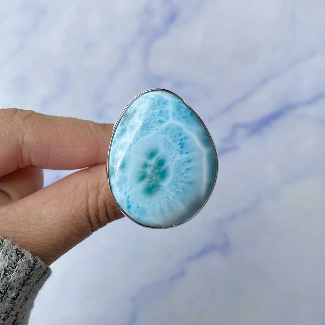 Larimar rings are thought to provide a number of therapeutic benefits. It is claimed to give relaxation and lessen tension and anxiety in the wearer by having a calming and soothing impact. Larimar's stunning blue hue is frequently connected to the sky and the ocean, fostering calm and peace. Some people think that wearing Larimar jewelry, such as Larimar bracelets, earrings, Larimar pendants, and necklaces, can aid in calming the mind and promoting inner peace.