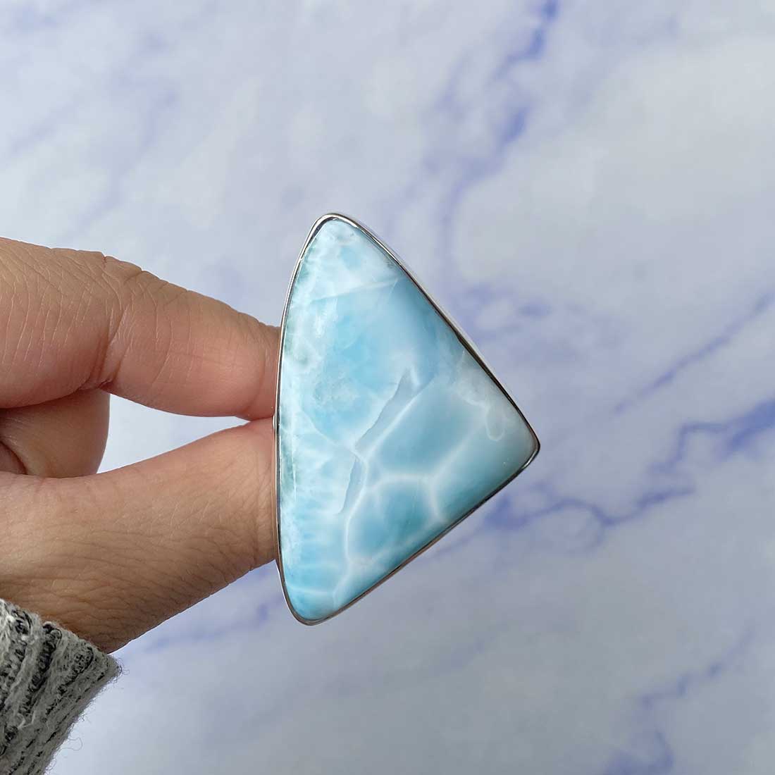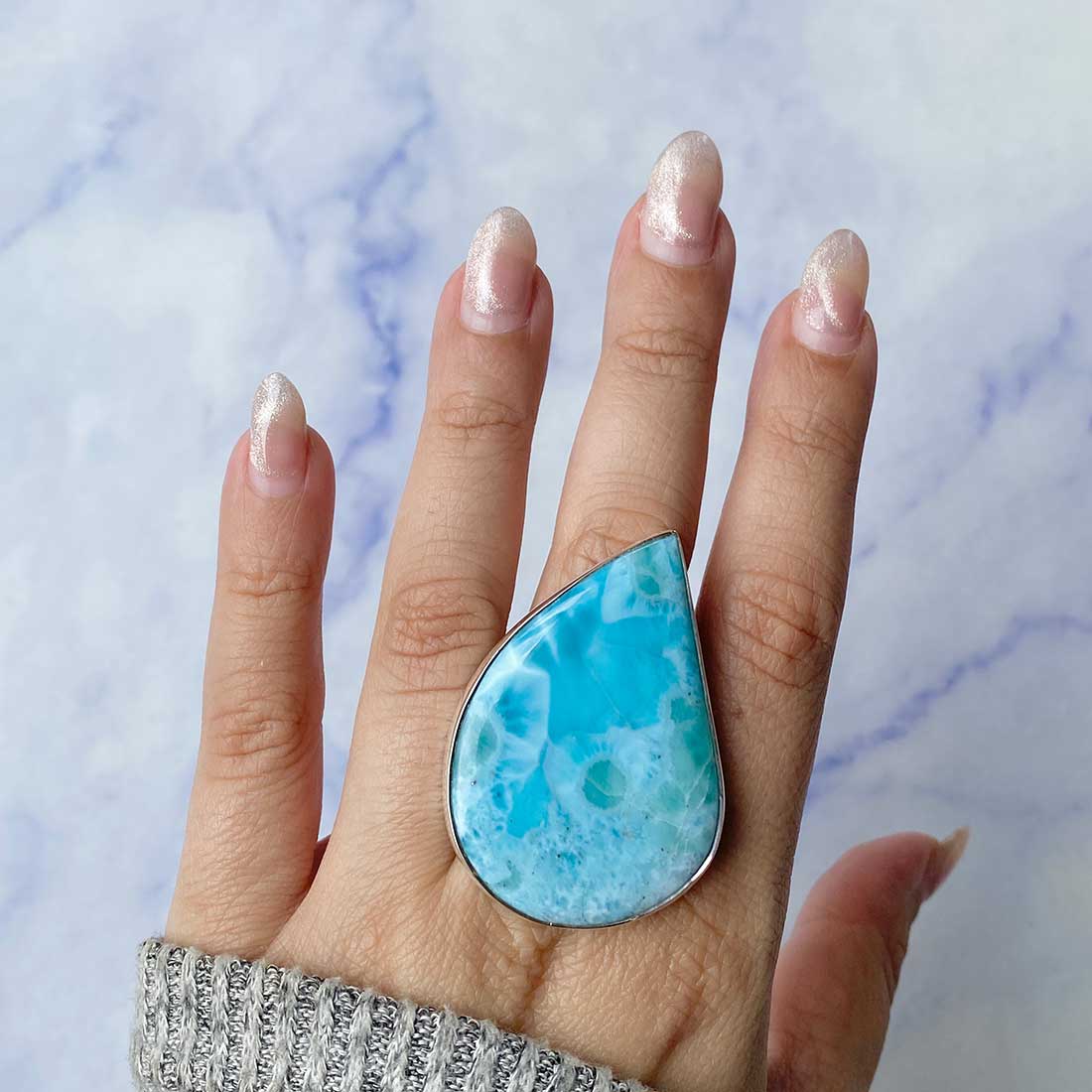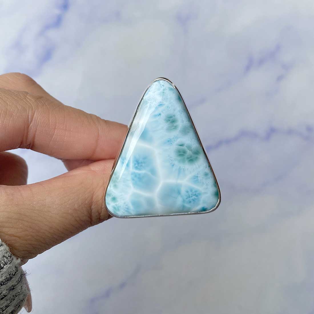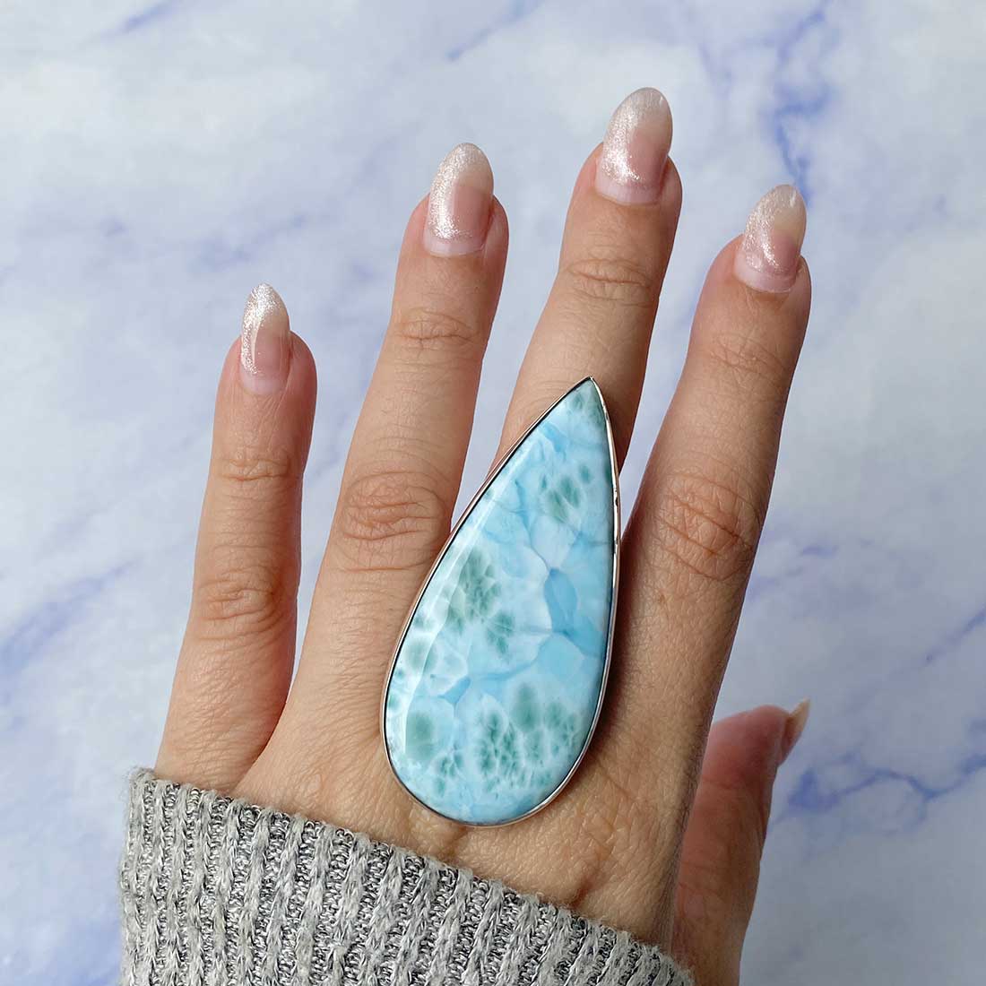 Larimar rings are thought to provide a number of therapeutic benefits. It is claimed to give relaxation and lessen tension and anxiety in the wearer by having a calming and soothing impact. Larimar's stunning blue hue is frequently connected to the sky and the ocean, fostering calm and peace. Some people think that wearing Larimar jewelry, such as Larimar bracelets, earrings, Larimar pendants, and necklaces, can aid in calming the mind and promoting inner peace.