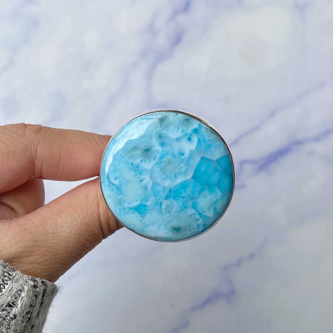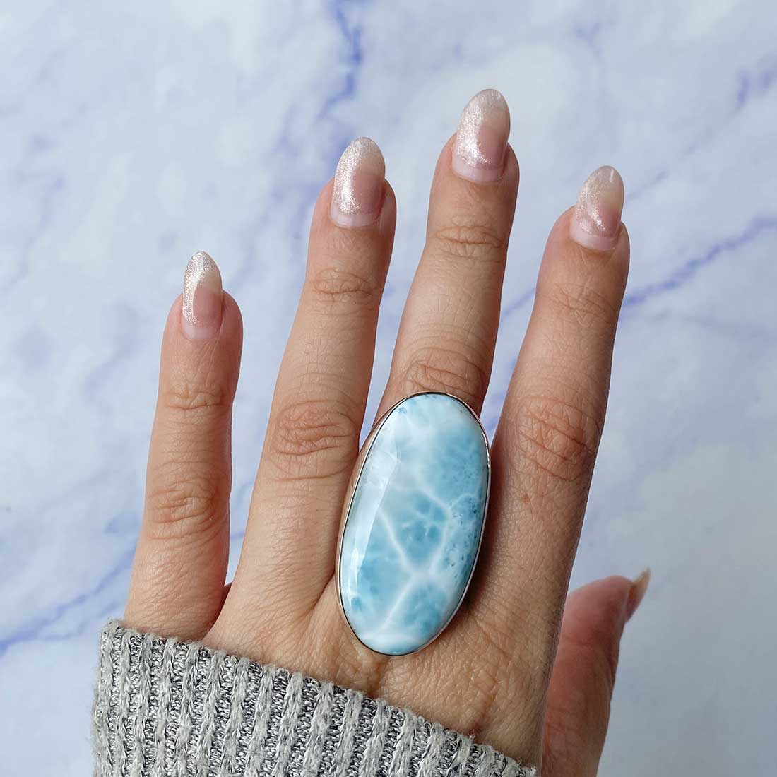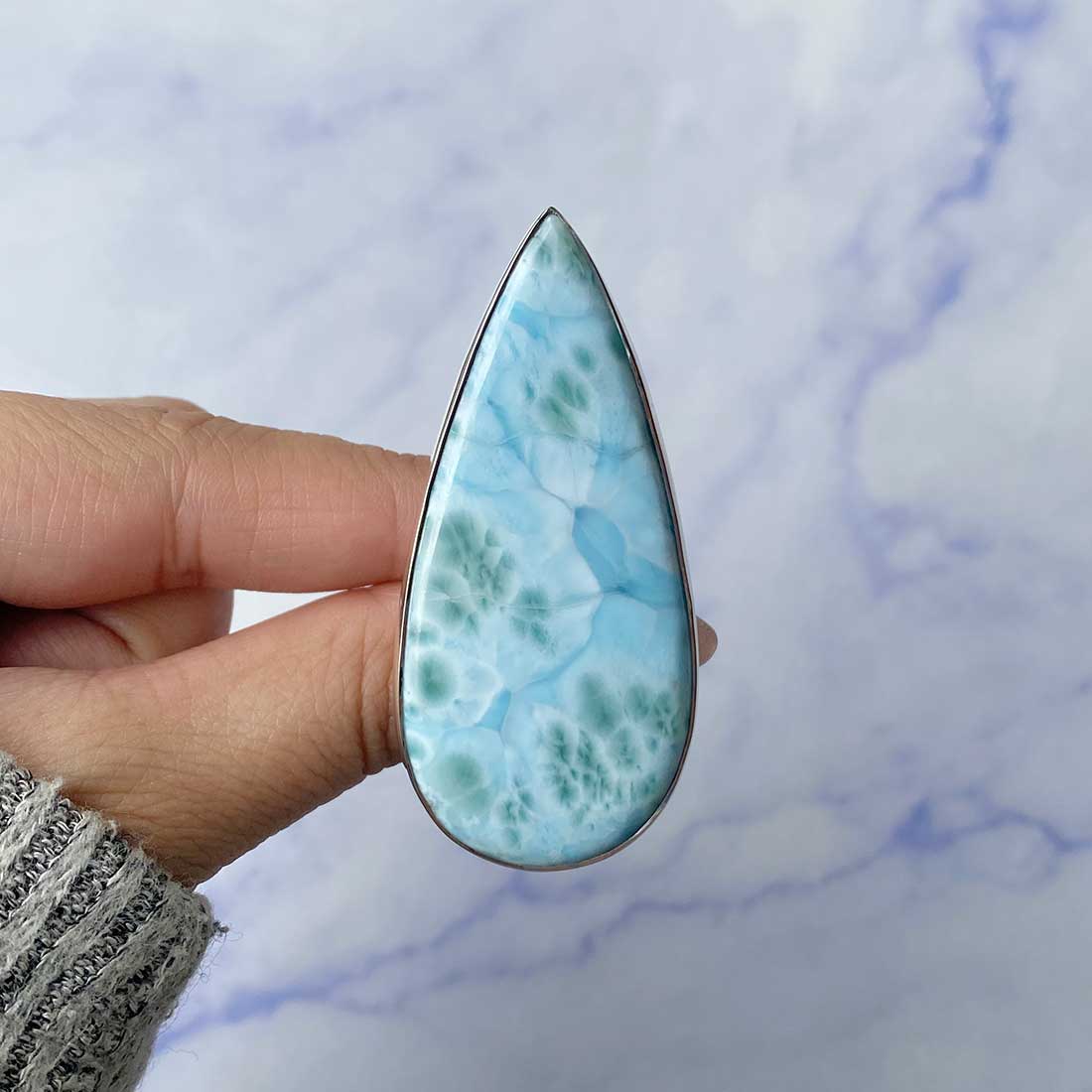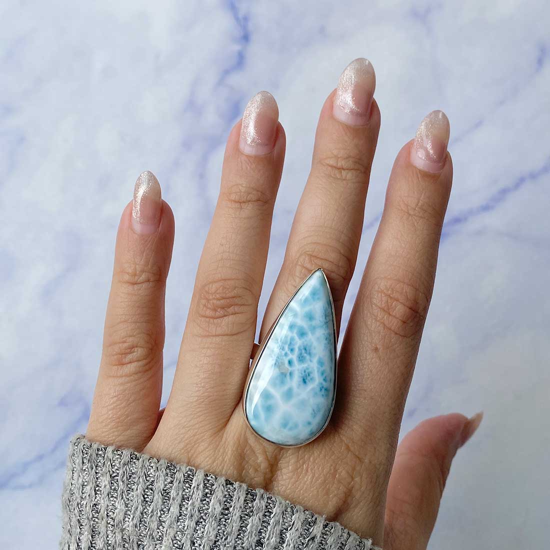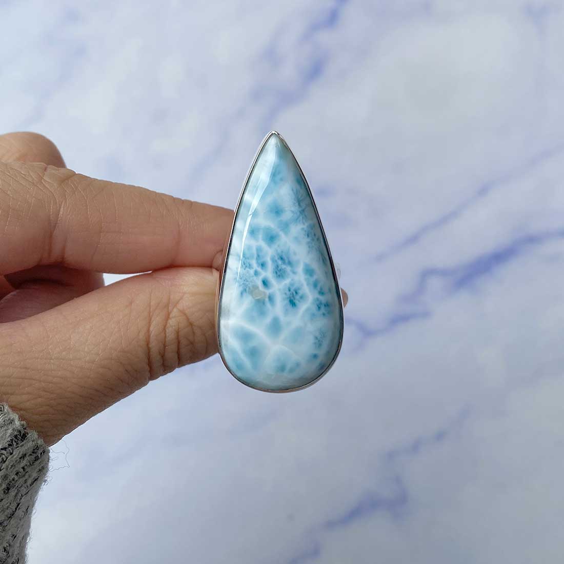 Larimar rings are thought to provide a number of therapeutic benefits. It is claimed to give relaxation and lessen tension and anxiety in the wearer by having a calming and soothing impact. Larimar's stunning blue hue is frequently connected to the sky and the ocean, fostering calm and peace. Some people think that wearing Larimar jewelry, such as Larimar bracelets, earrings, Larimar pendants, and necklaces, can aid in calming the mind and promoting inner peace.