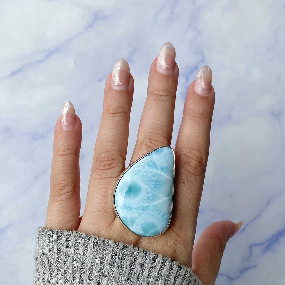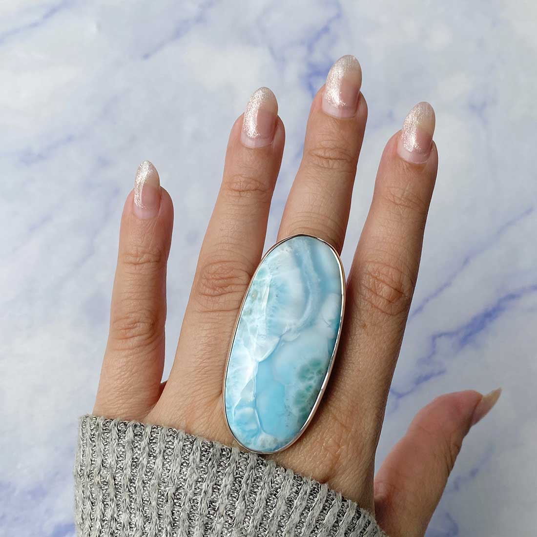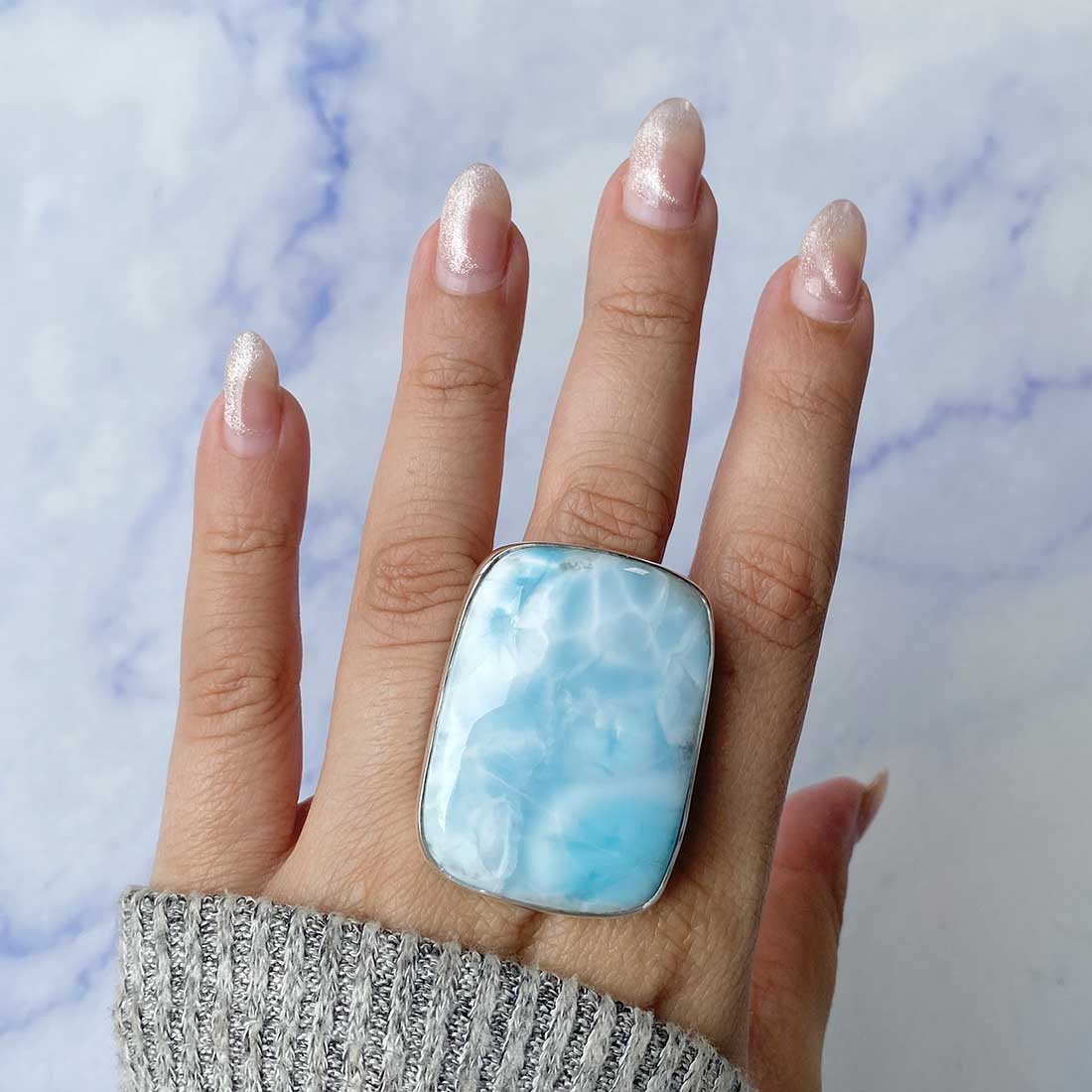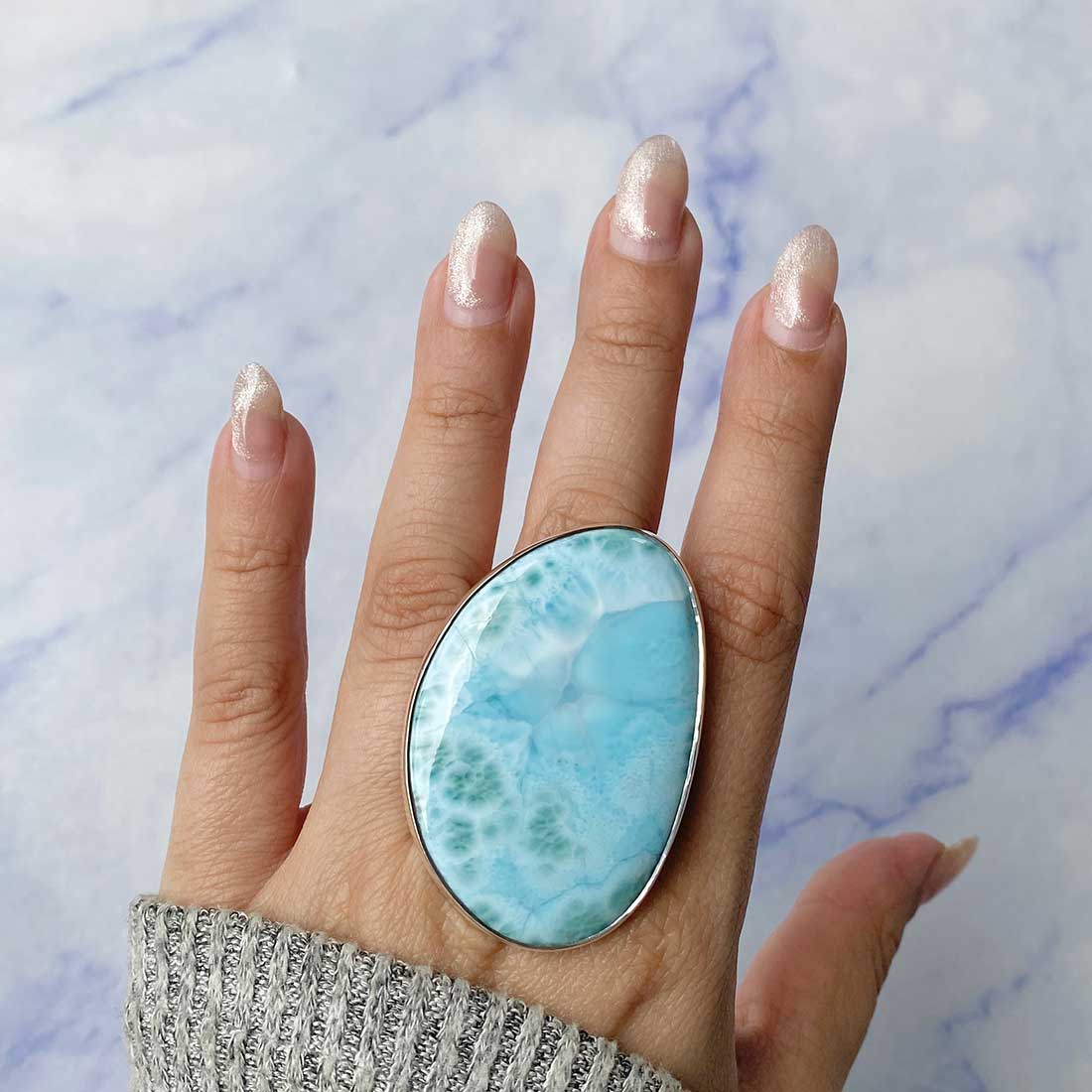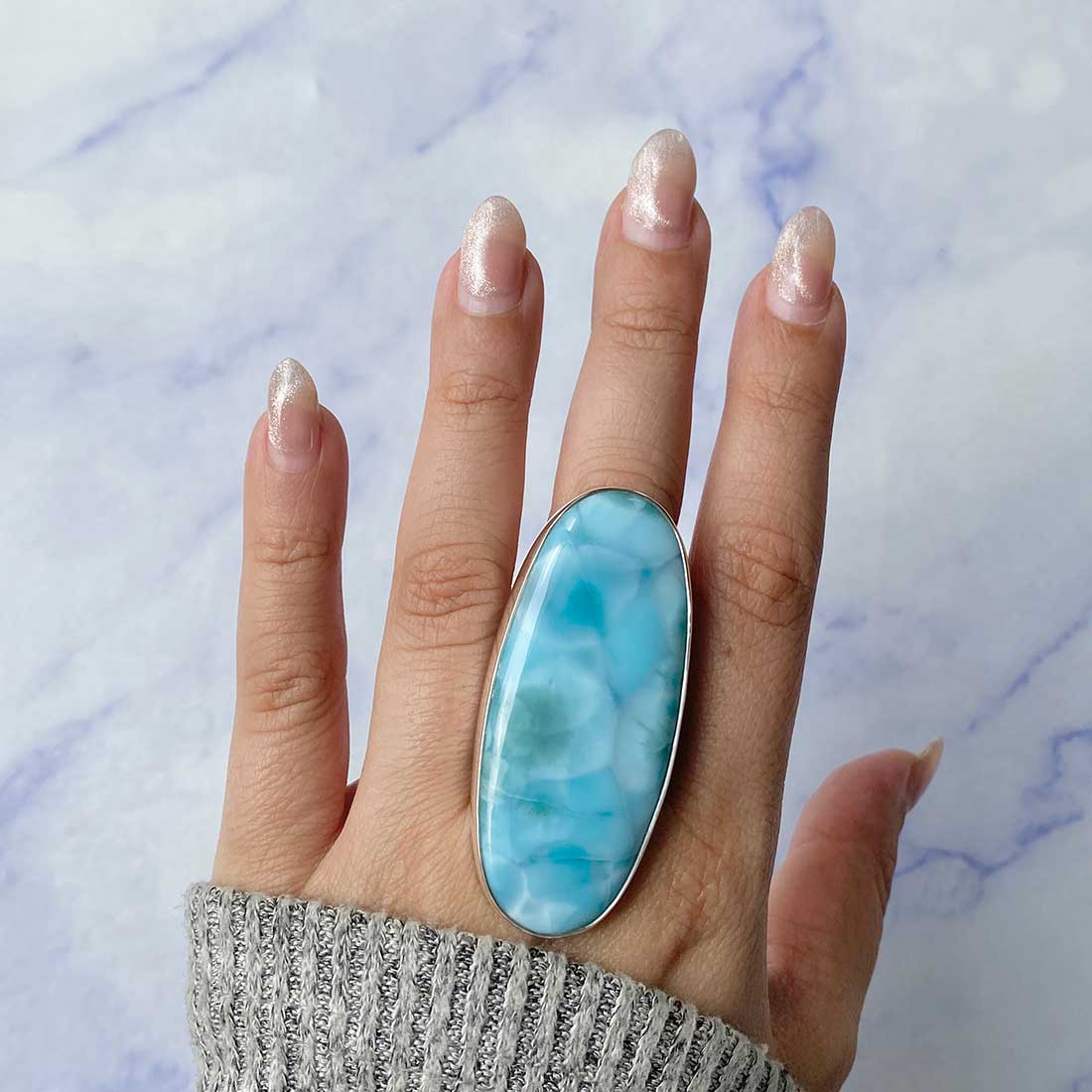 Larimar rings are thought to provide a number of therapeutic benefits. It is claimed to give relaxation and lessen tension and anxiety in the wearer by having a calming and soothing impact. Larimar's stunning blue hue is frequently connected to the sky and the ocean, fostering calm and peace. Some people think that wearing Larimar jewelry, such as Larimar bracelets, earrings, Larimar pendants, and necklaces, can aid in calming the mind and promoting inner peace.
