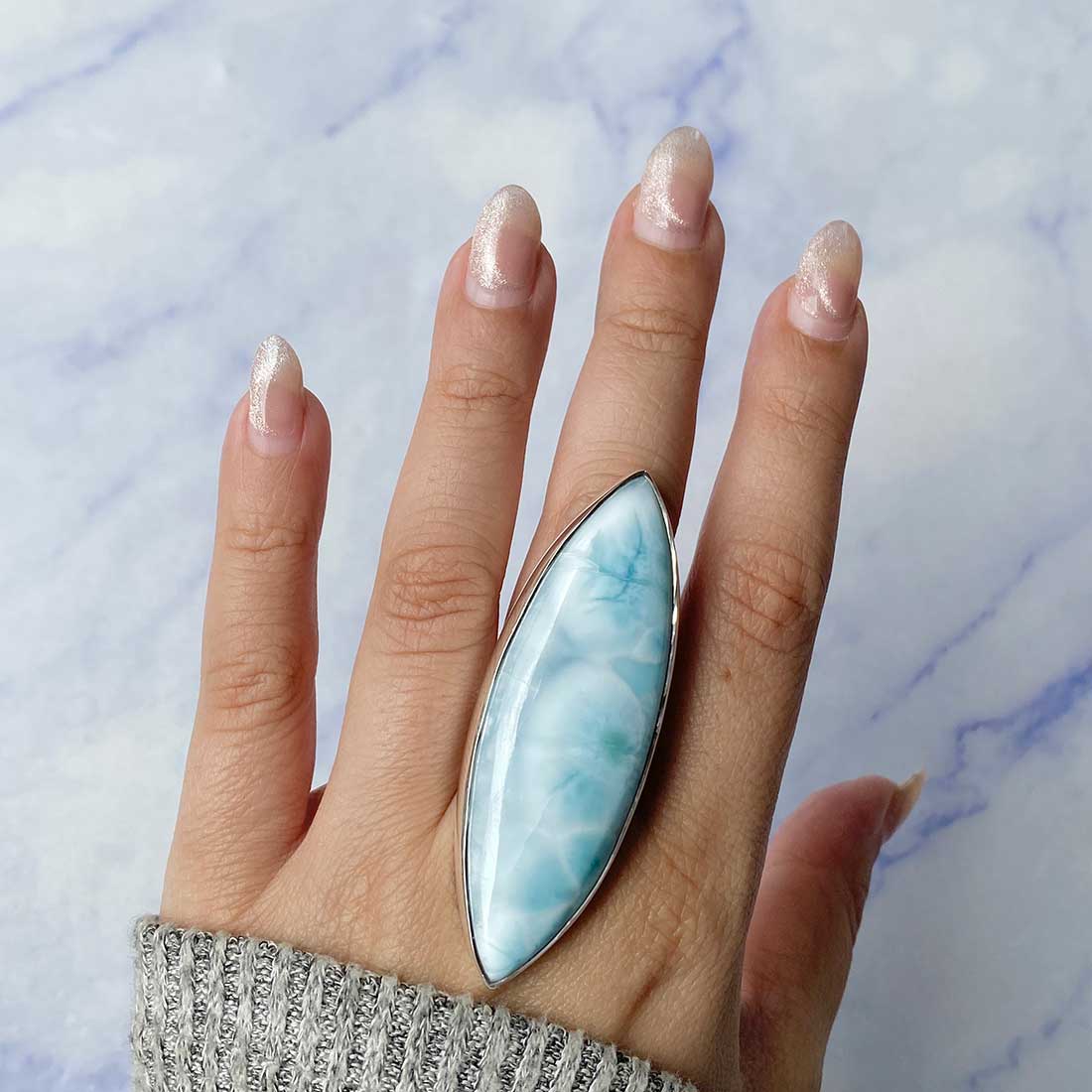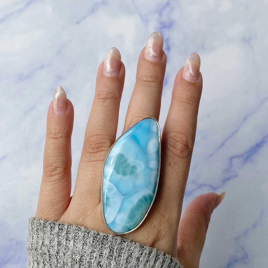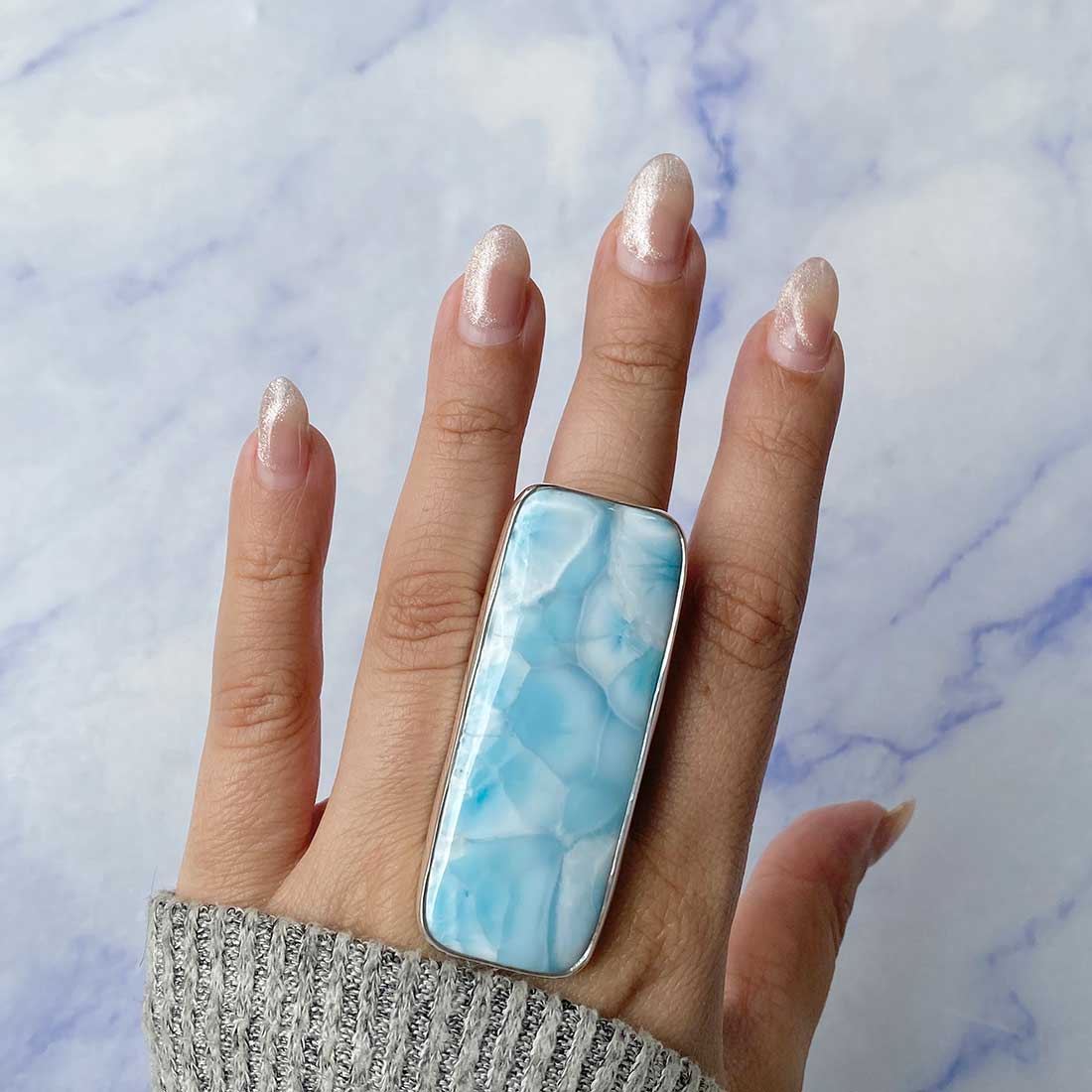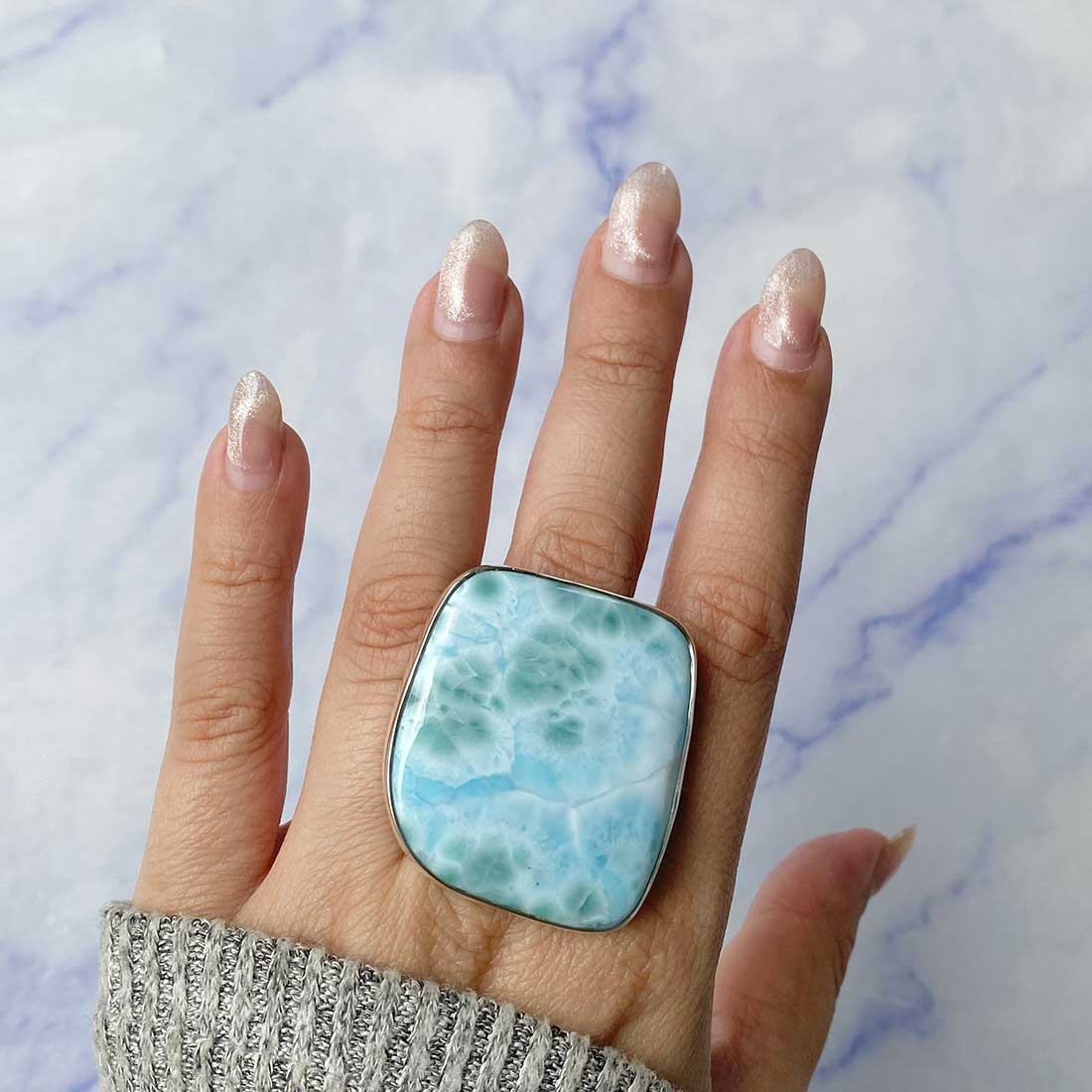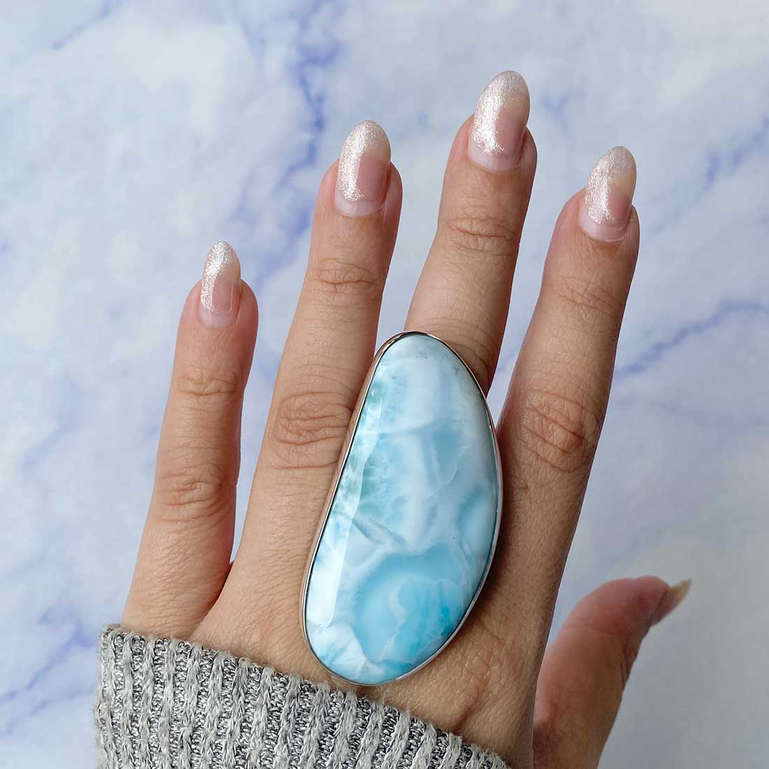 Larimar rings are thought to provide a number of therapeutic benefits. It is claimed to give relaxation and lessen tension and anxiety in the wearer by having a calming and soothing impact. Larimar's stunning blue hue is frequently connected to the sky and the ocean, fostering calm and peace. Some people think that wearing Larimar jewelry, such as Larimar bracelets, earrings, Larimar pendants, and necklaces, can aid in calming the mind and promoting inner peace.
