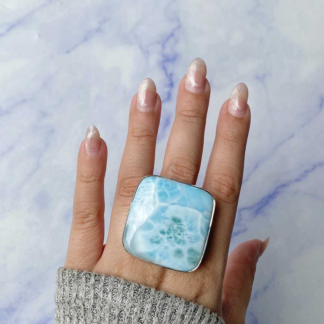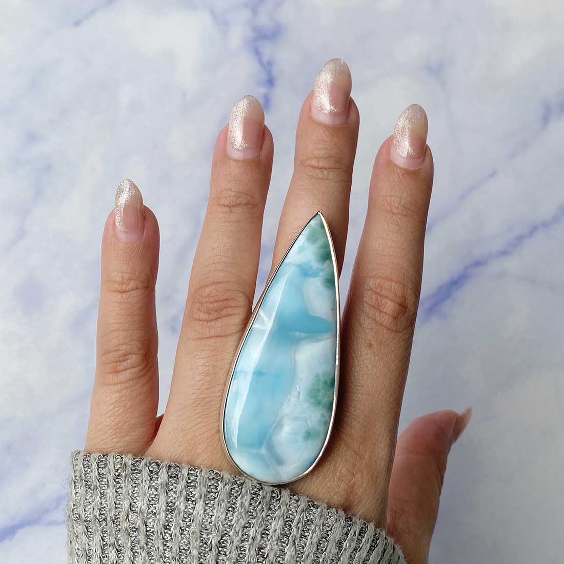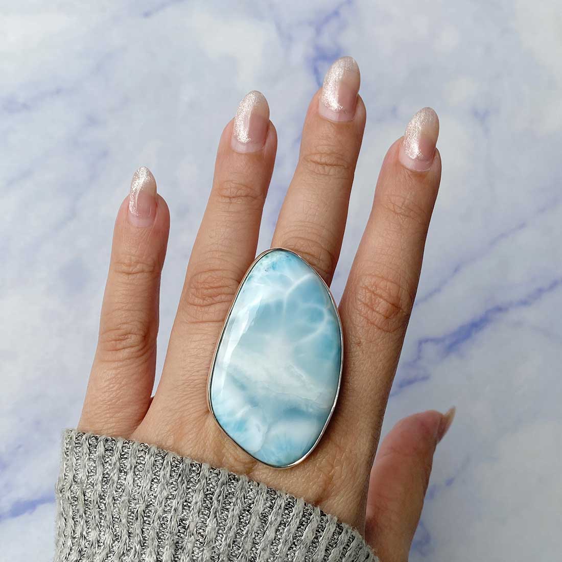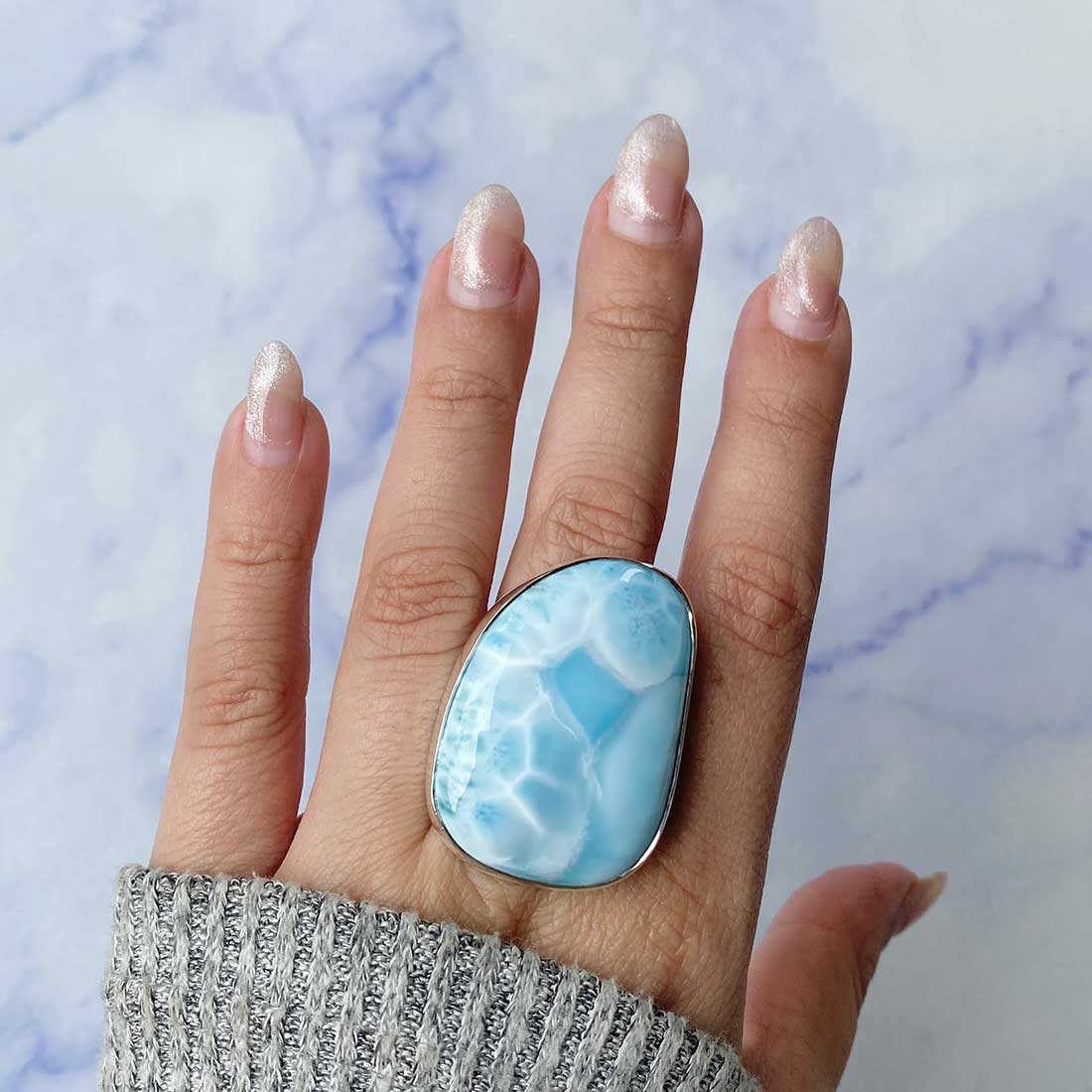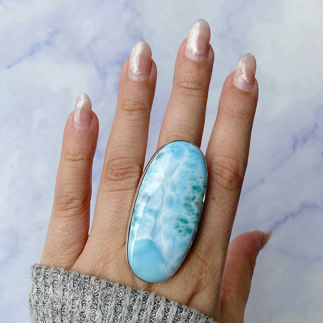 Larimar rings are thought to provide a number of therapeutic benefits. It is claimed to give relaxation and lessen tension and anxiety in the wearer by having a calming and soothing impact. Larimar's stunning blue hue is frequently connected to the sky and the ocean, fostering calm and peace. Some people think that wearing Larimar jewelry, such as Larimar bracelets, earrings, Larimar pendants, and necklaces, can aid in calming the mind and promoting inner peace.