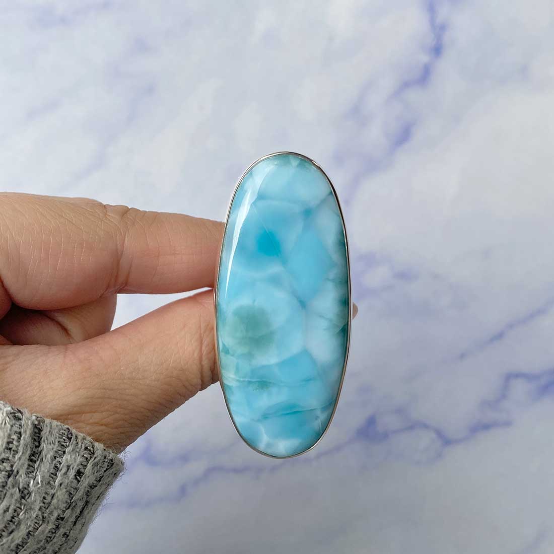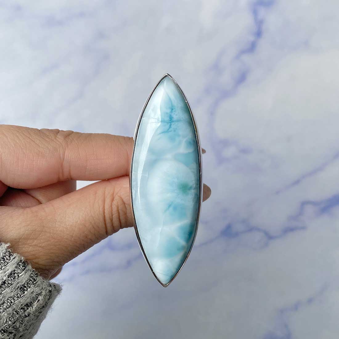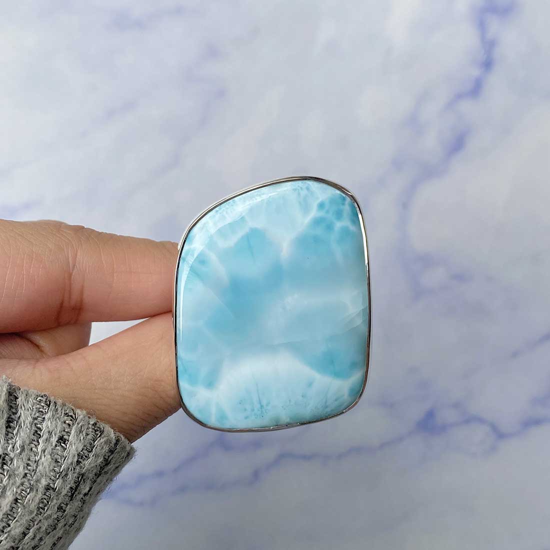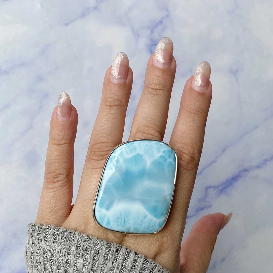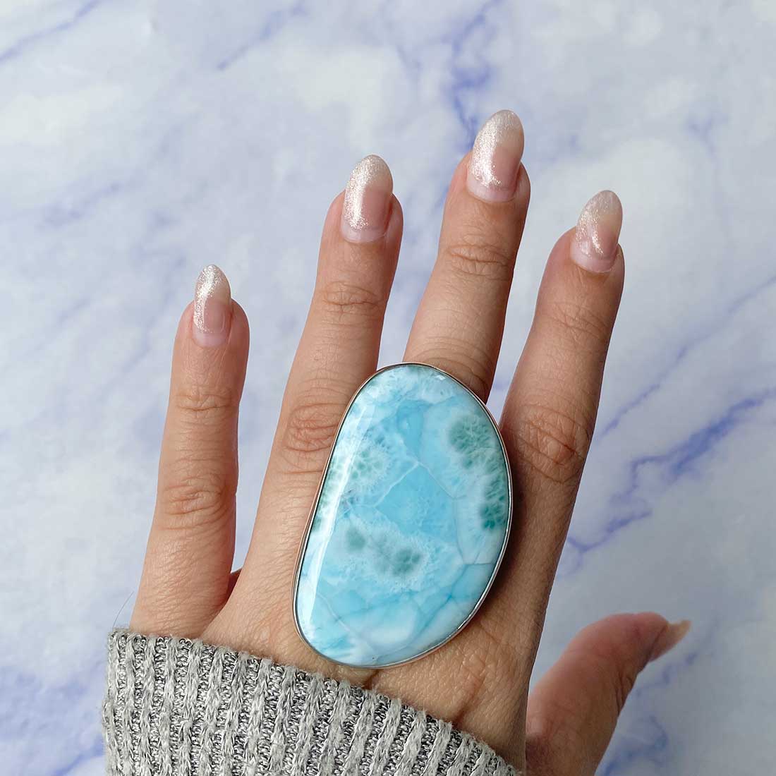 Larimar rings are thought to provide a number of therapeutic benefits. It is claimed to give relaxation and lessen tension and anxiety in the wearer by having a calming and soothing impact. Larimar's stunning blue hue is frequently connected to the sky and the ocean, fostering calm and peace. Some people think that wearing Larimar jewelry, such as Larimar bracelets, earrings, Larimar pendants, and necklaces, can aid in calming the mind and promoting inner peace.