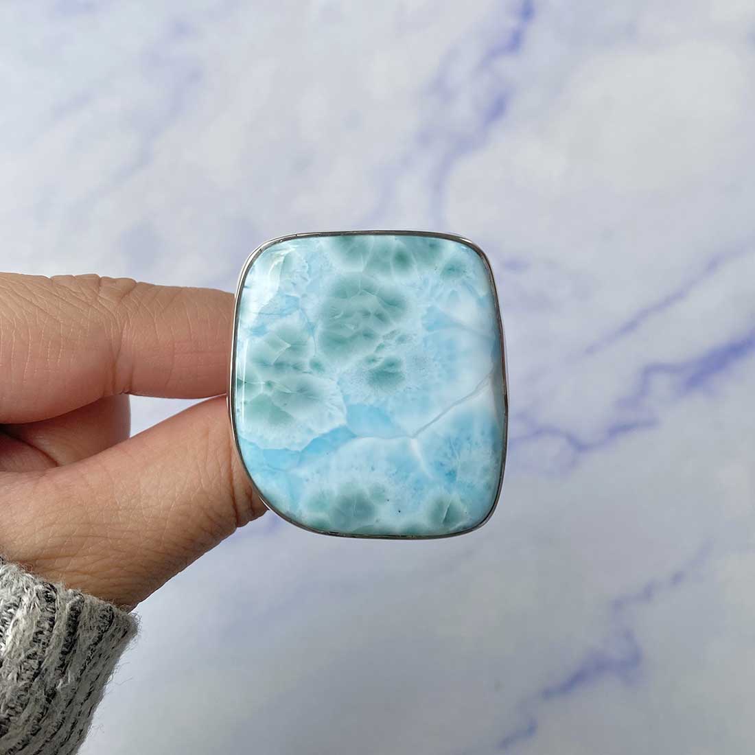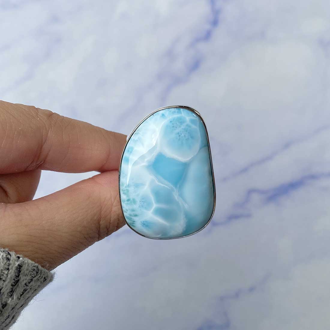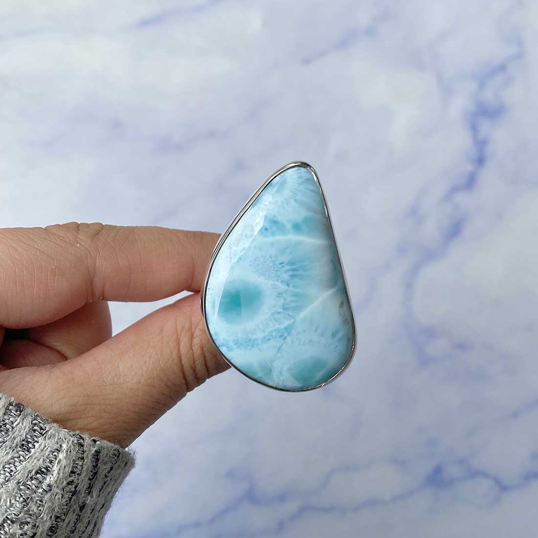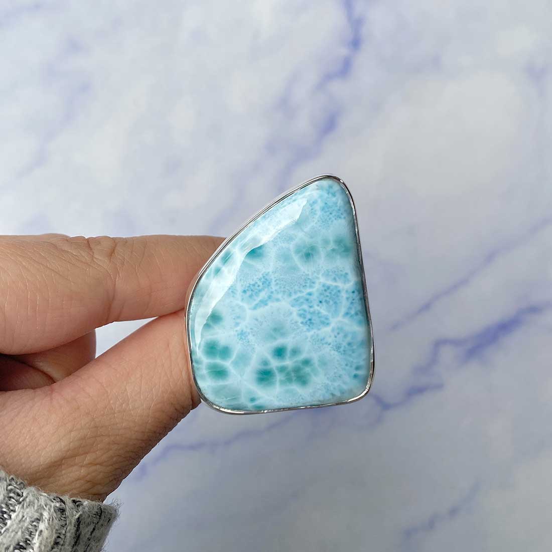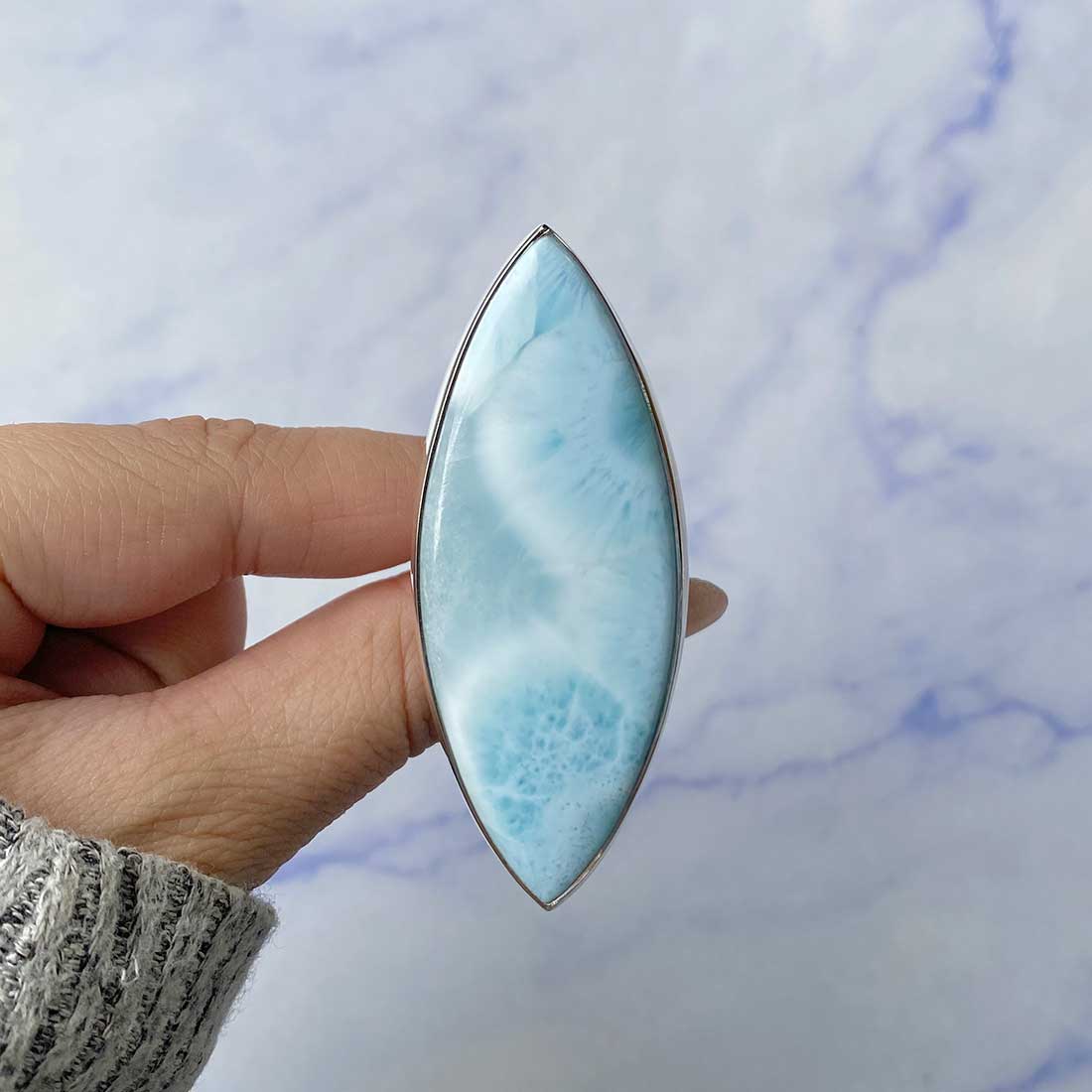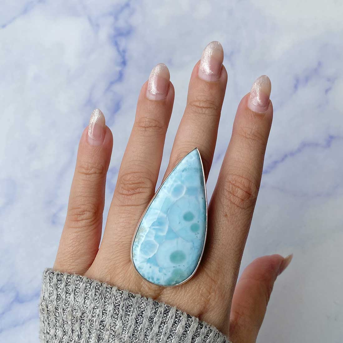 Larimar rings are thought to provide a number of therapeutic benefits. It is claimed to give relaxation and lessen tension and anxiety in the wearer by having a calming and soothing impact. Larimar's stunning blue hue is frequently connected to the sky and the ocean, fostering calm and peace. Some people think that wearing Larimar jewelry, such as Larimar bracelets, earrings, Larimar pendants, and necklaces, can aid in calming the mind and promoting inner peace.