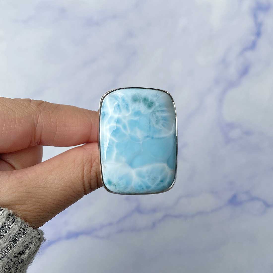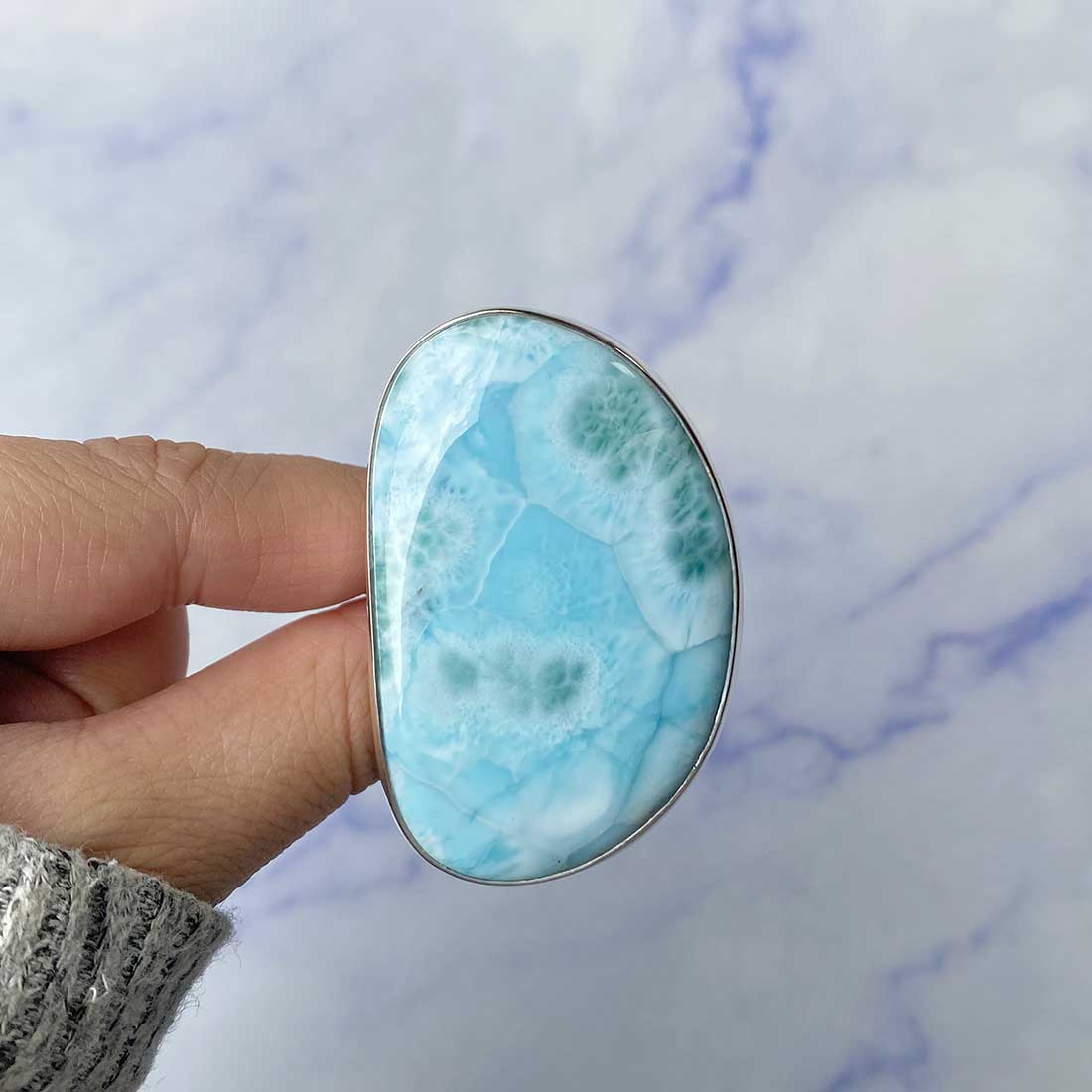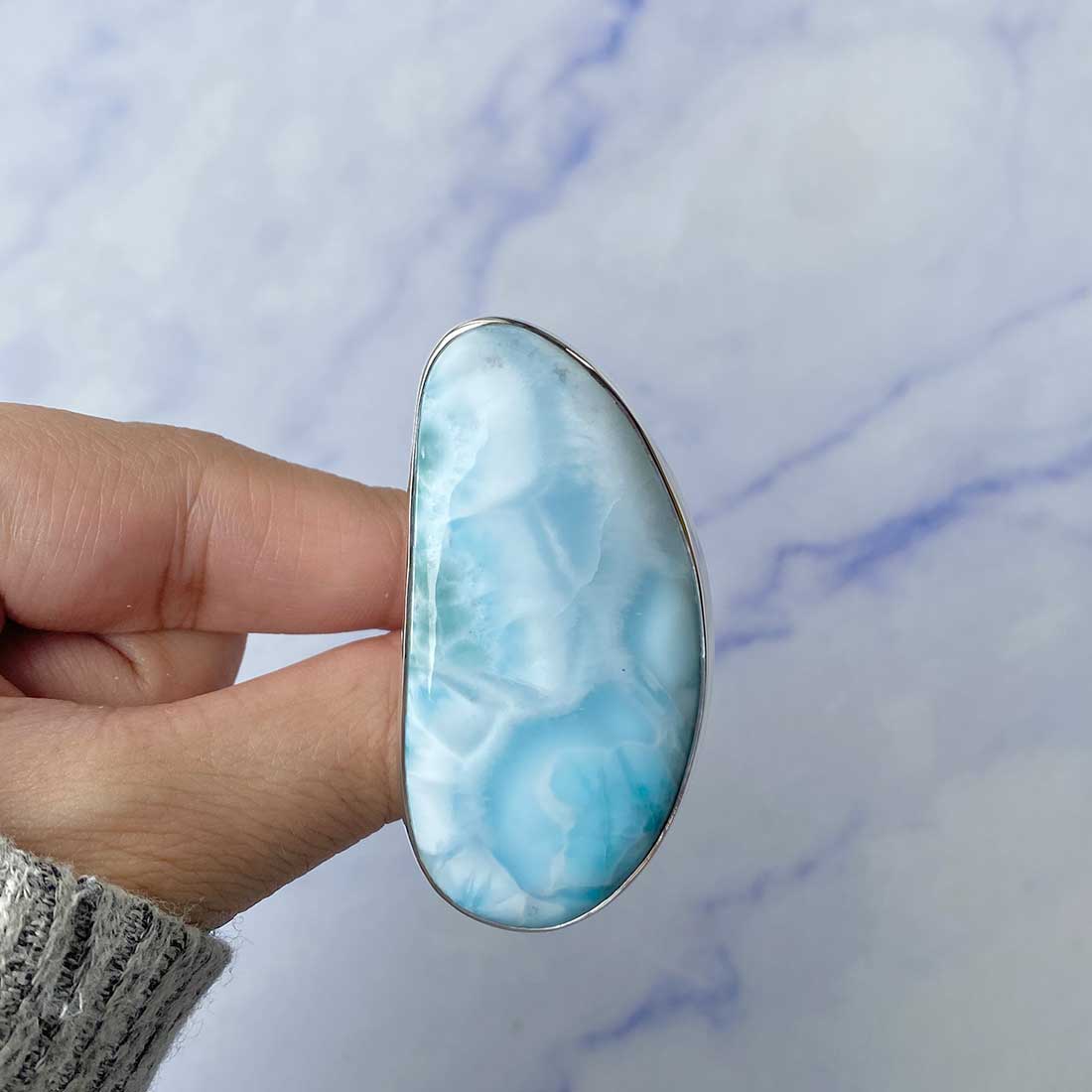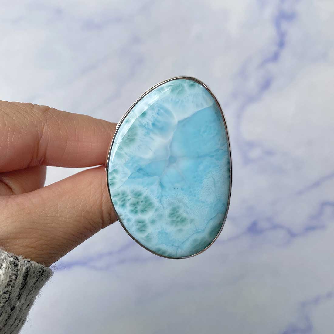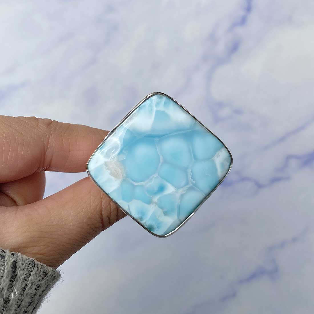 Larimar rings are thought to provide a number of therapeutic benefits. It is claimed to give relaxation and lessen tension and anxiety in the wearer by having a calming and soothing impact. Larimar's stunning blue hue is frequently connected to the sky and the ocean, fostering calm and peace. Some people think that wearing Larimar jewelry, such as Larimar bracelets, earrings, Larimar pendants, and necklaces, can aid in calming the mind and promoting inner peace.