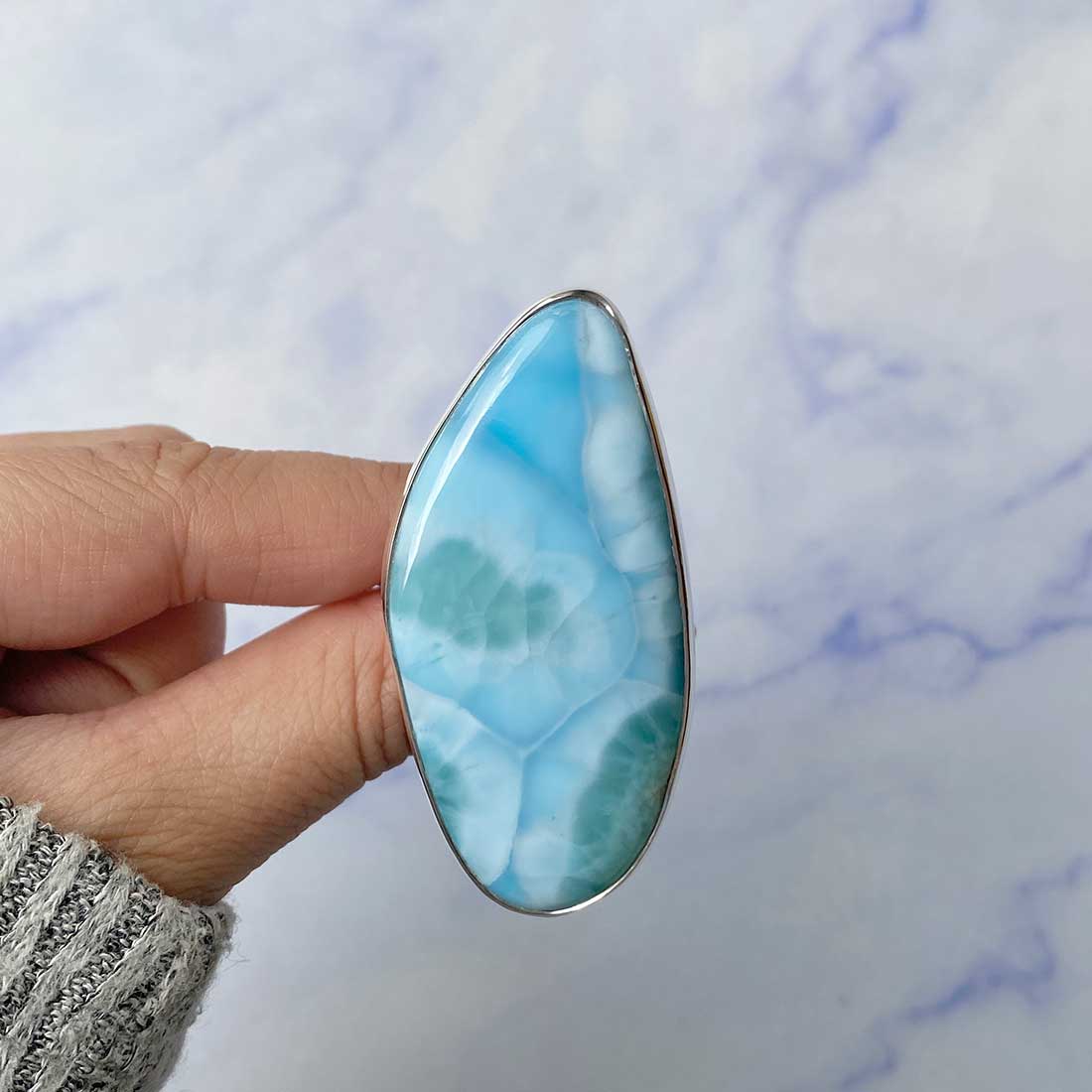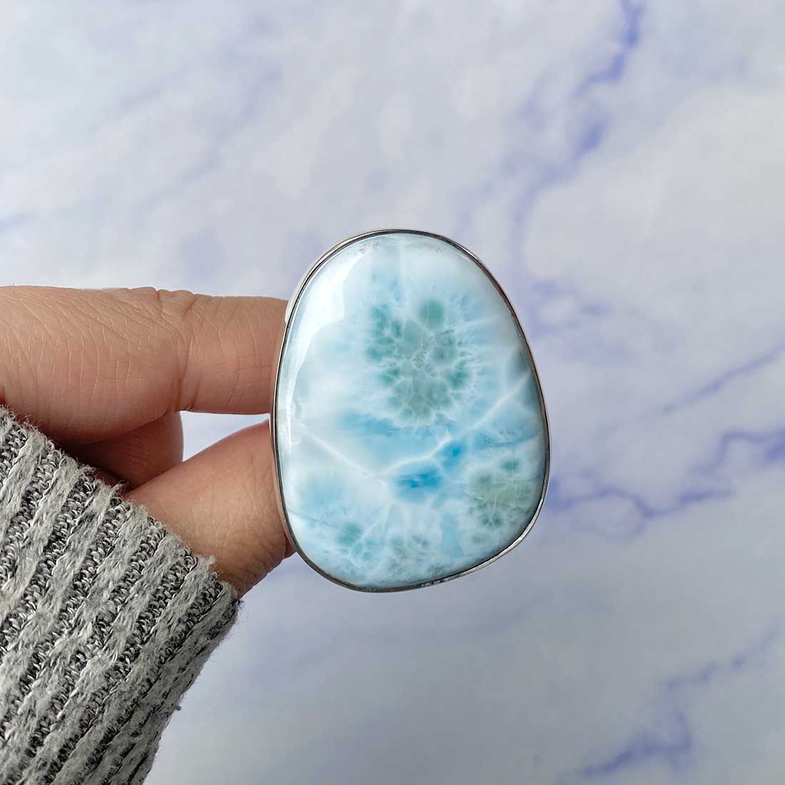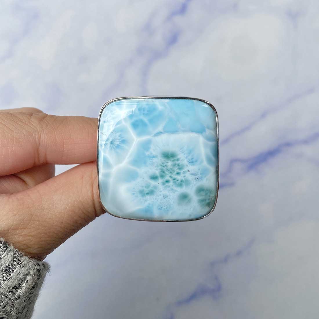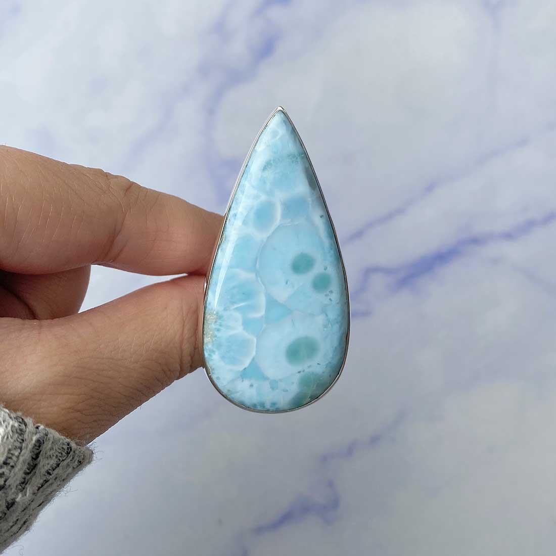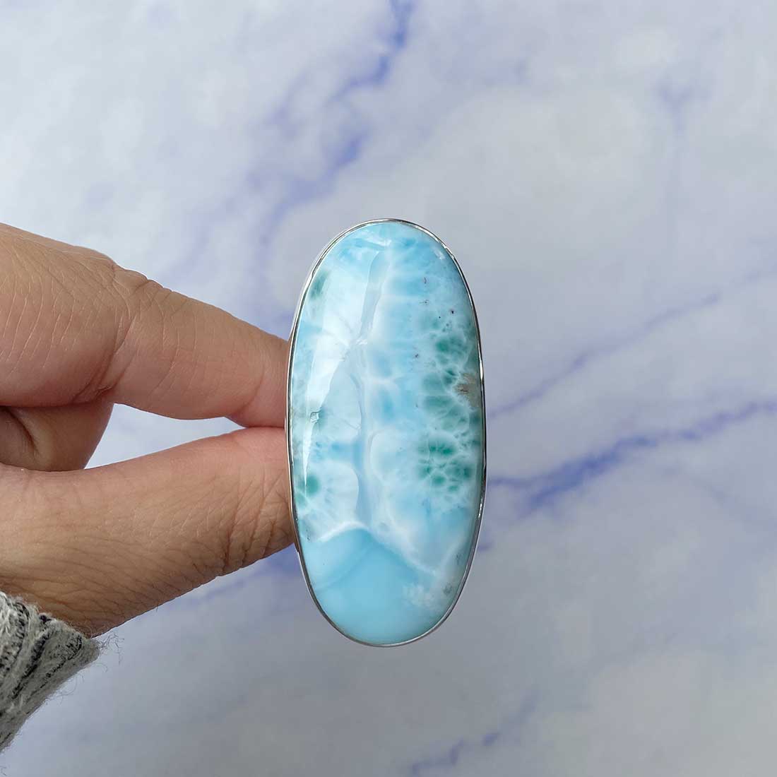 Larimar rings are thought to provide a number of therapeutic benefits. It is claimed to give relaxation and lessen tension and anxiety in the wearer by having a calming and soothing impact. Larimar's stunning blue hue is frequently connected to the sky and the ocean, fostering calm and peace. Some people think that wearing Larimar jewelry, such as Larimar bracelets, earrings, Larimar pendants, and necklaces, can aid in calming the mind and promoting inner peace.
