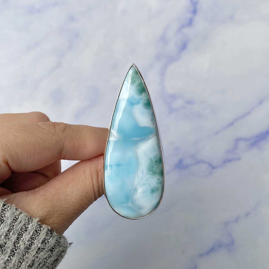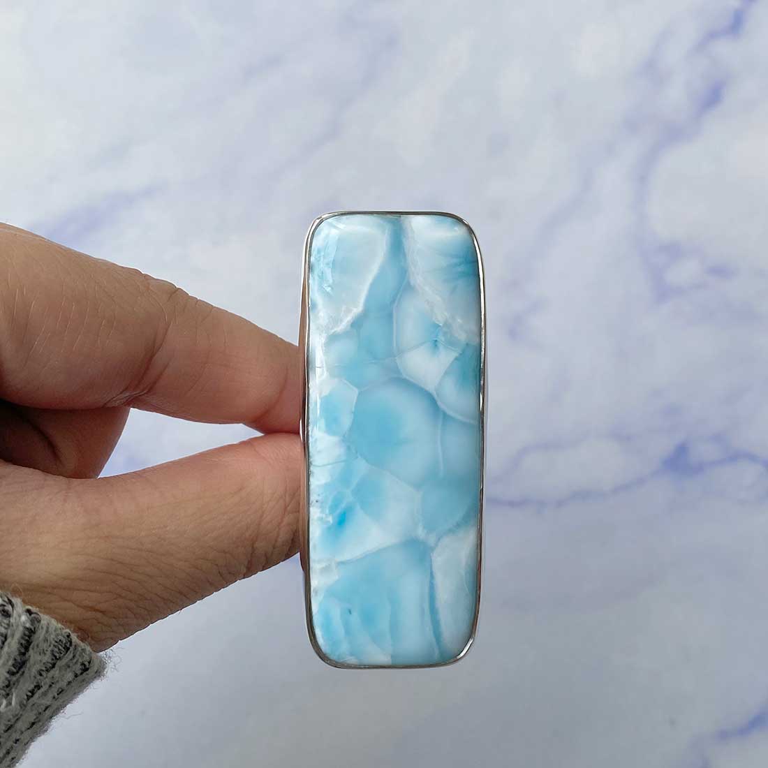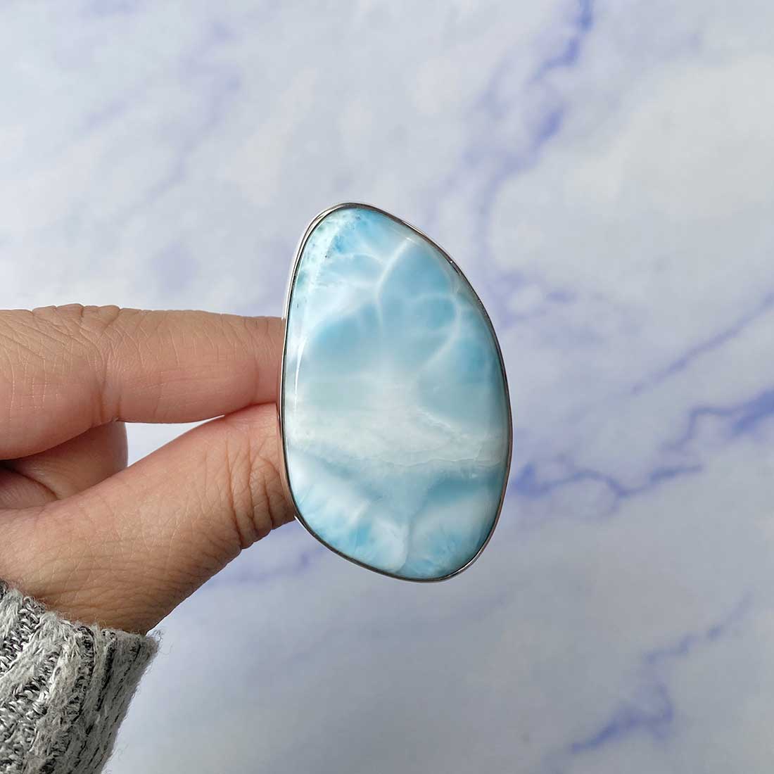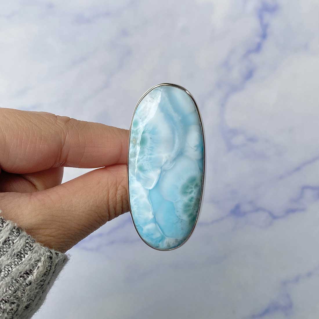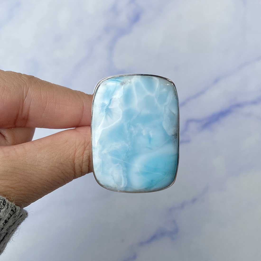 Larimar rings are thought to provide a number of therapeutic benefits. It is claimed to give relaxation and lessen tension and anxiety in the wearer by having a calming and soothing impact. Larimar's stunning blue hue is frequently connected to the sky and the ocean, fostering calm and peace. Some people think that wearing Larimar jewelry, such as Larimar bracelets, earrings, Larimar pendants, and necklaces, can aid in calming the mind and promoting inner peace.