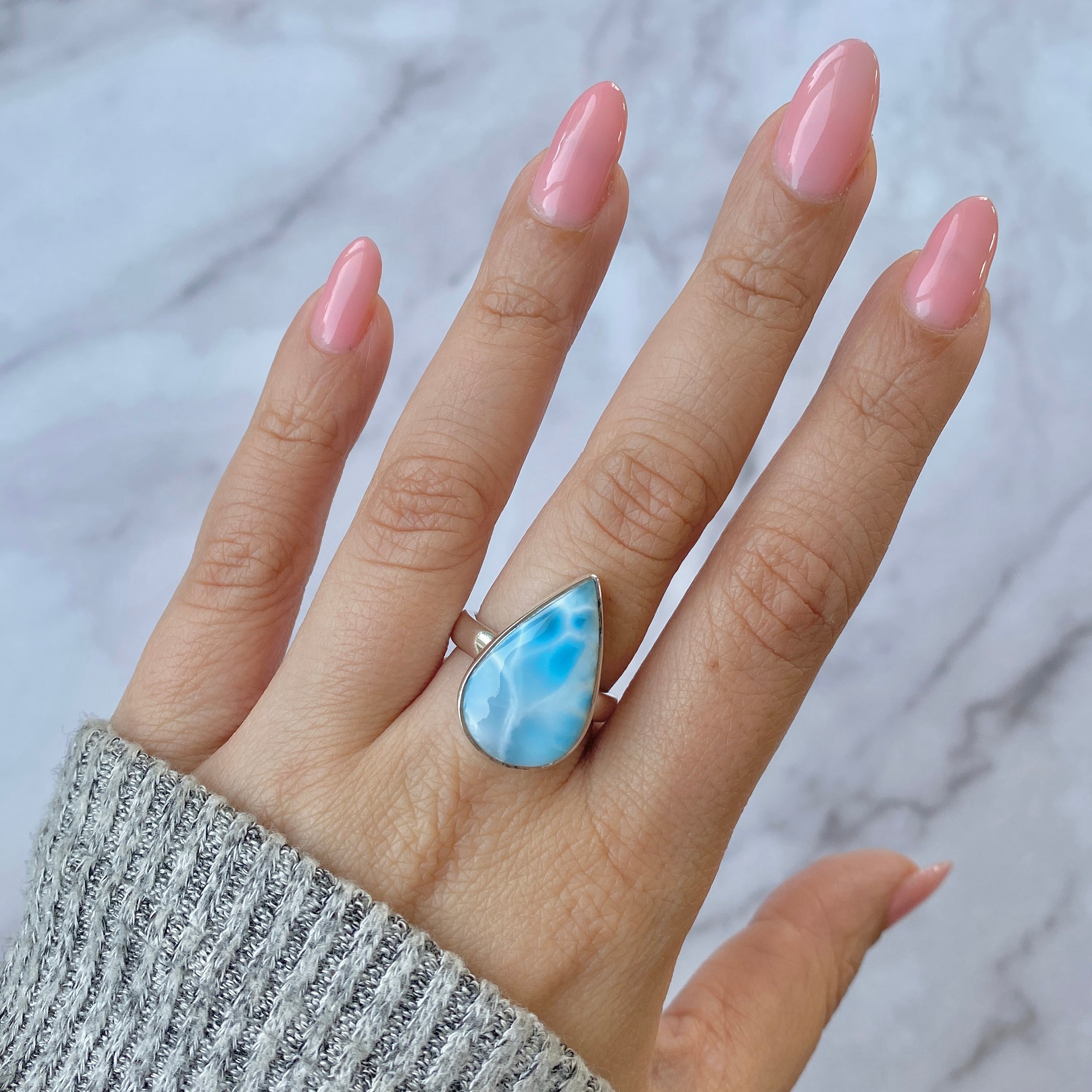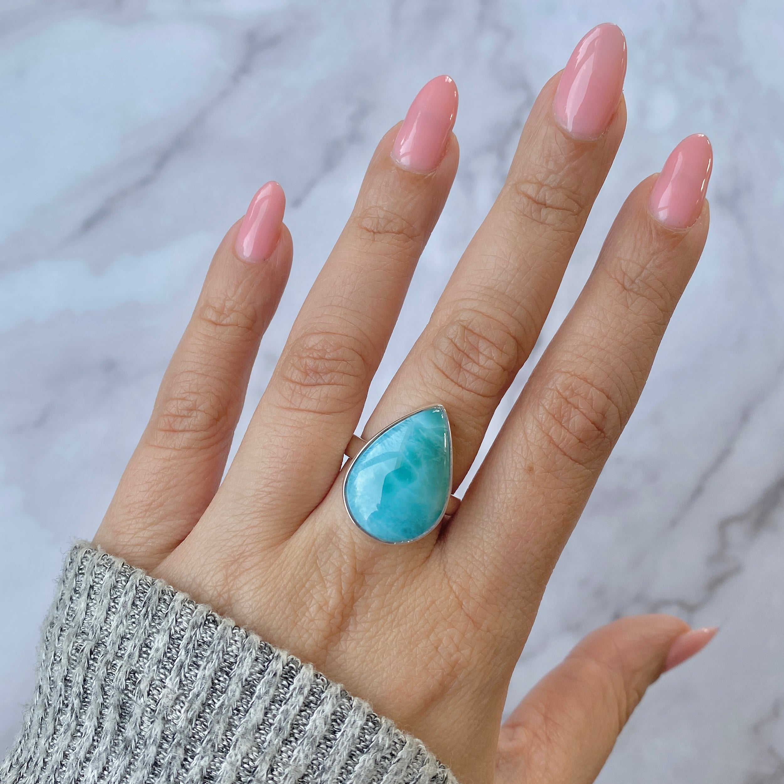 Larimar rings are thought to provide a number of therapeutic benefits. It is claimed to give relaxation and lessen tension and anxiety in the wearer by having a calming and soothing impact. Larimar's stunning blue hue is frequently connected to the sky and the ocean, fostering calm and peace. Some people think that wearing Larimar jewelry, such as Larimar bracelets, earrings, Larimar pendants, and necklaces, can aid in calming the mind and promoting inner peace.