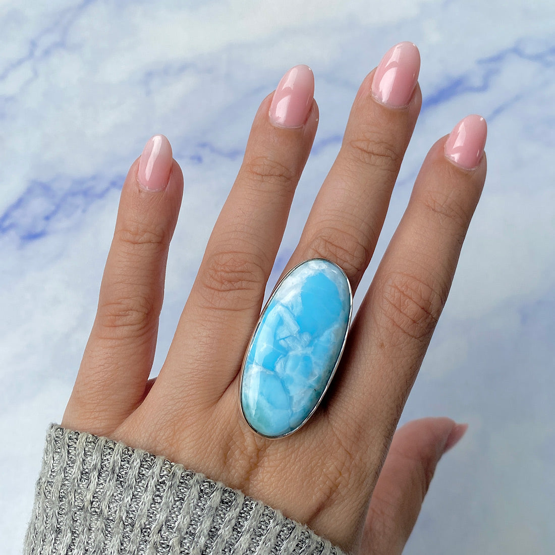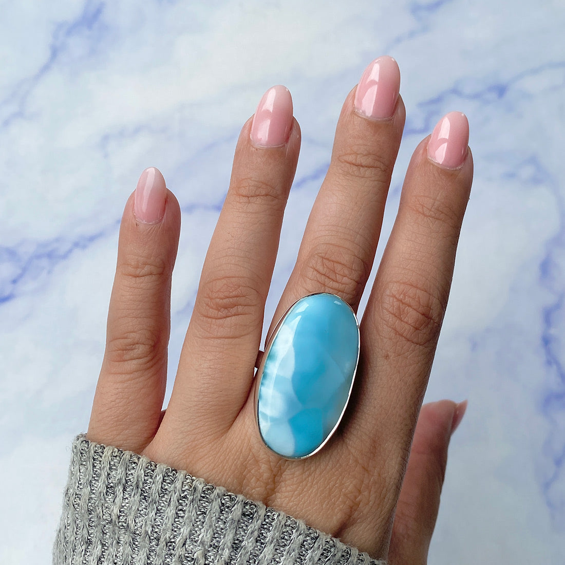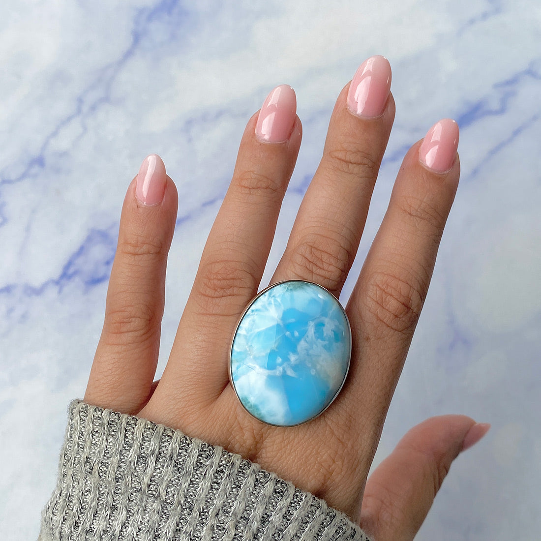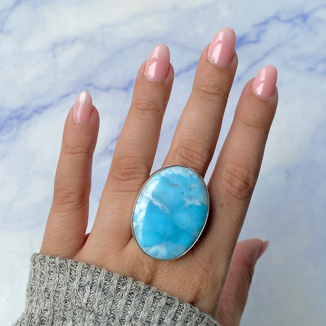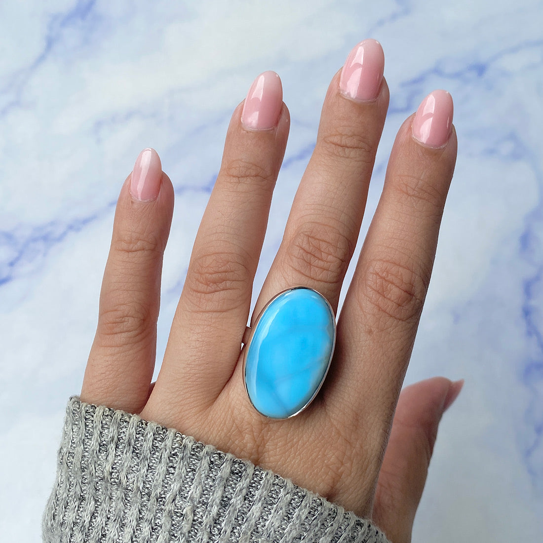 Larimar rings are thought to provide a number of therapeutic benefits. It is claimed to give relaxation and lessen tension and anxiety in the wearer by having a calming and soothing impact. Larimar's stunning blue hue is frequently connected to the sky and the ocean, fostering calm and peace. Some people think that wearing Larimar jewelry, such as Larimar bracelets, earrings, Larimar pendants, and necklaces, can aid in calming the mind and promoting inner peace.