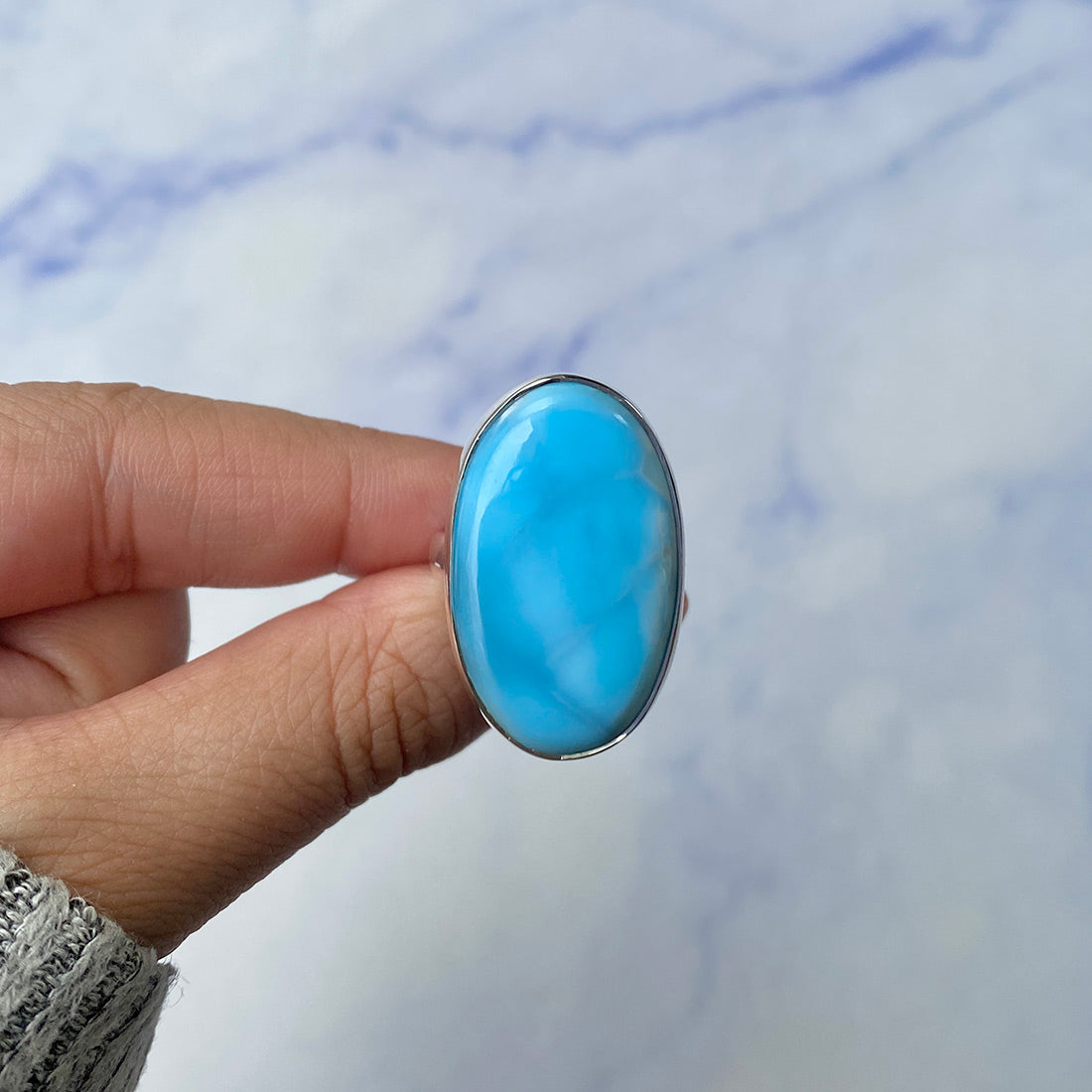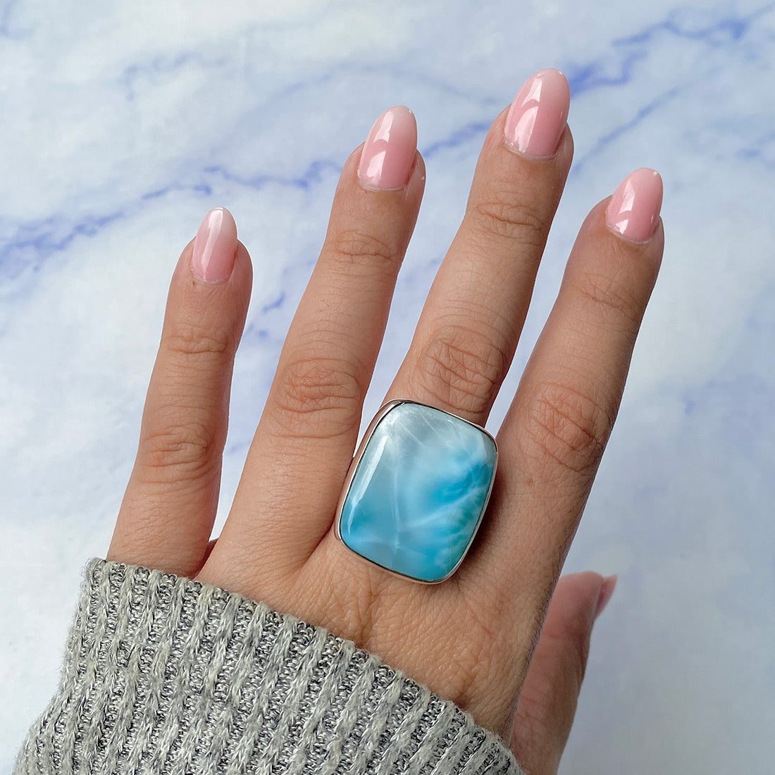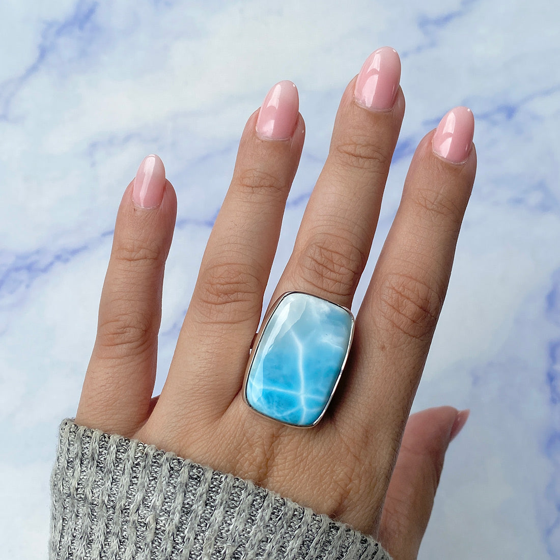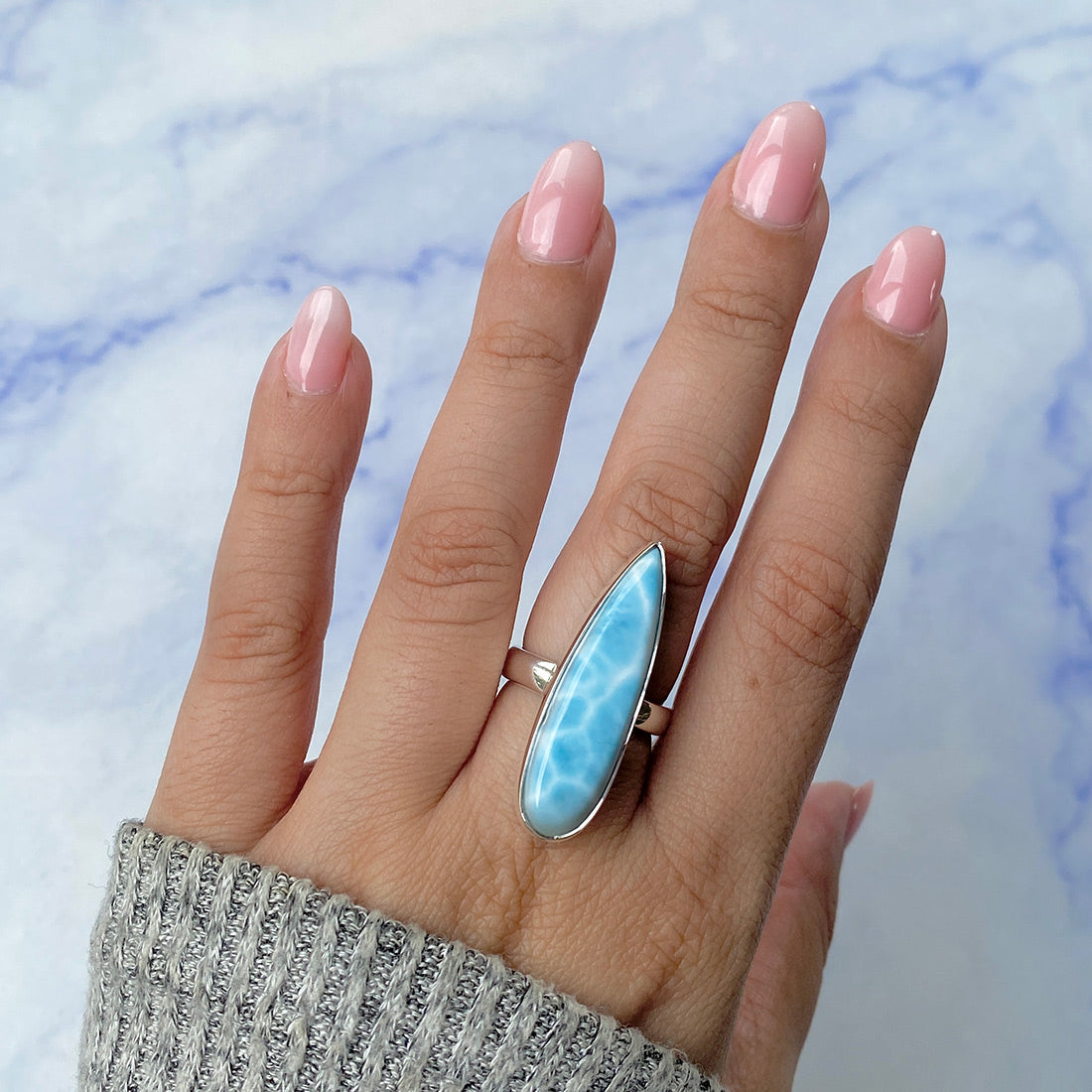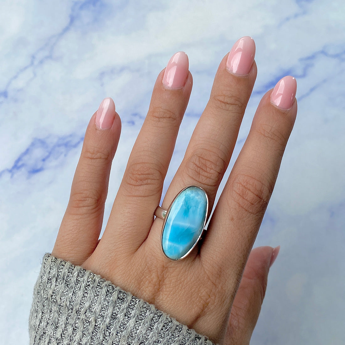 Larimar rings are thought to provide a number of therapeutic benefits. It is claimed to give relaxation and lessen tension and anxiety in the wearer by having a calming and soothing impact. Larimar's stunning blue hue is frequently connected to the sky and the ocean, fostering calm and peace. Some people think that wearing Larimar jewelry, such as Larimar bracelets, earrings, Larimar pendants, and necklaces, can aid in calming the mind and promoting inner peace.