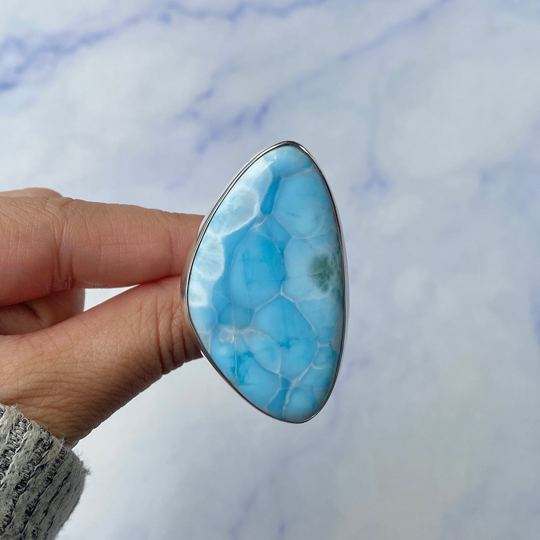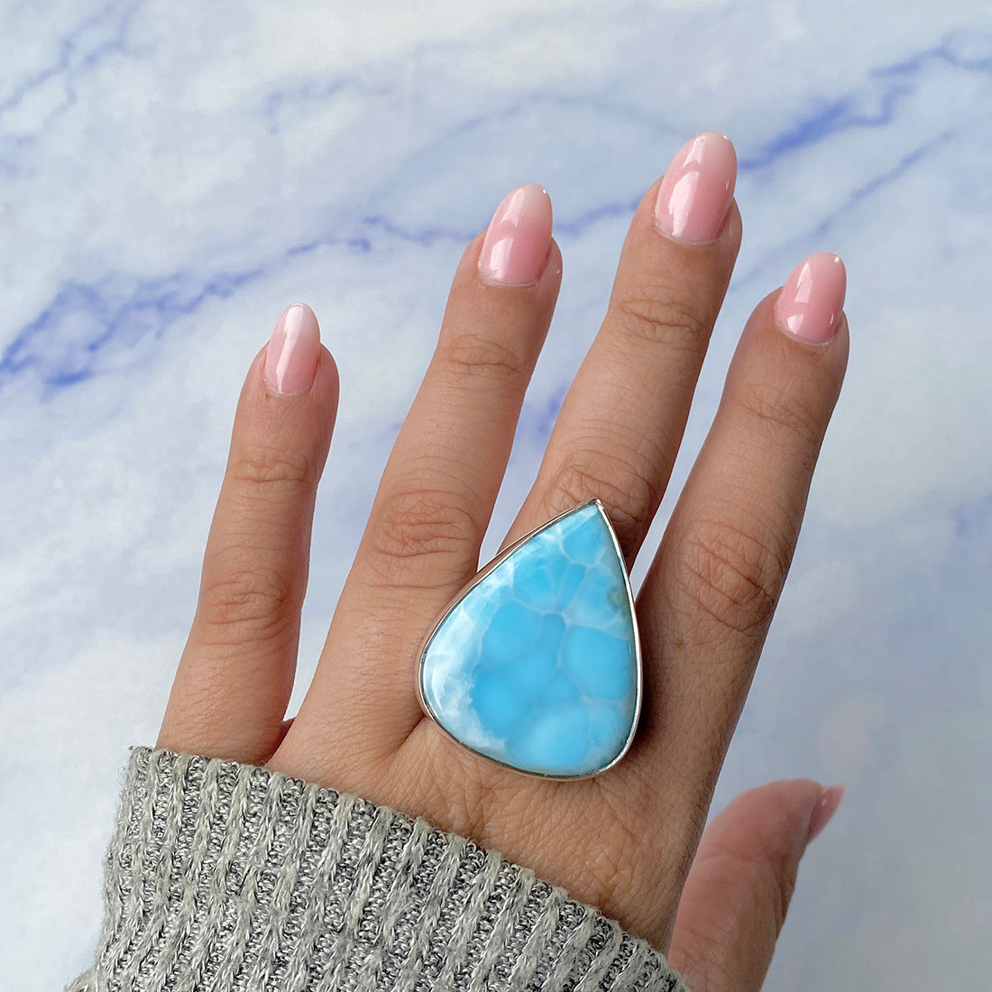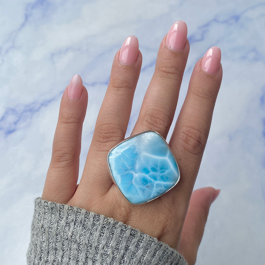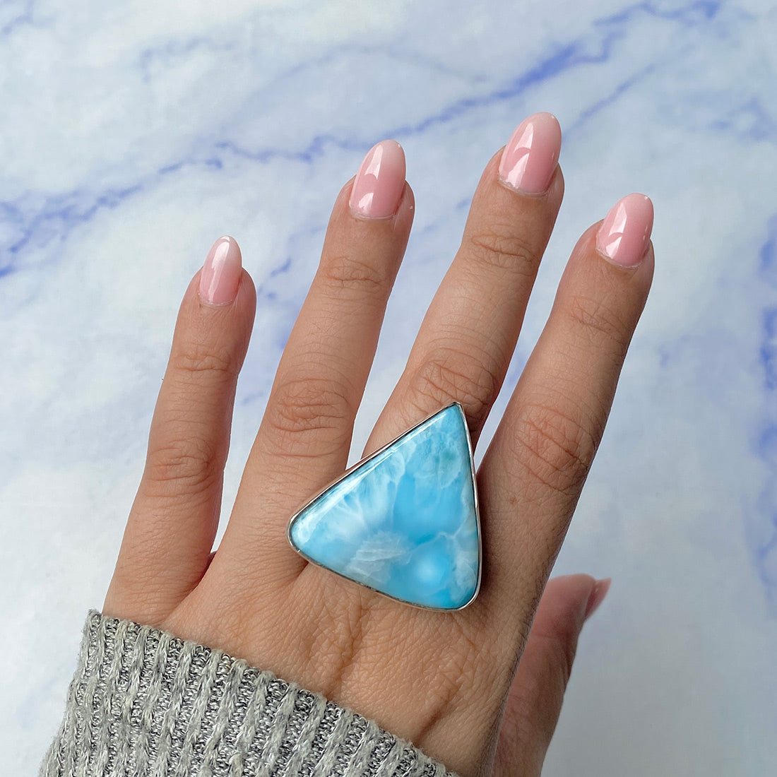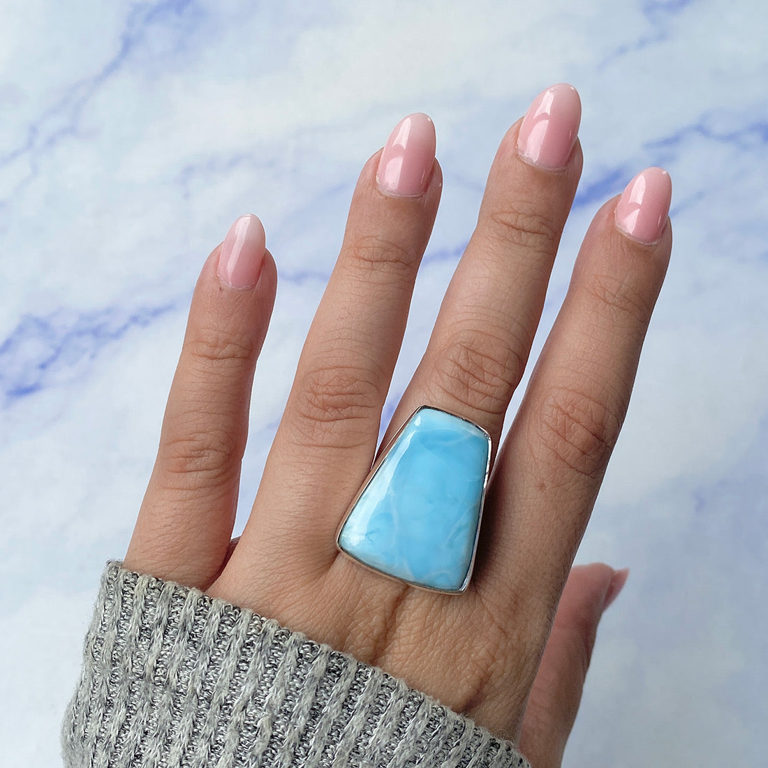 Larimar rings are thought to provide a number of therapeutic benefits. It is claimed to give relaxation and lessen tension and anxiety in the wearer by having a calming and soothing impact. Larimar's stunning blue hue is frequently connected to the sky and the ocean, fostering calm and peace. Some people think that wearing Larimar jewelry, such as Larimar bracelets, earrings, Larimar pendants, and necklaces, can aid in calming the mind and promoting inner peace.