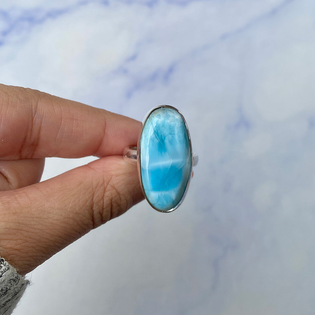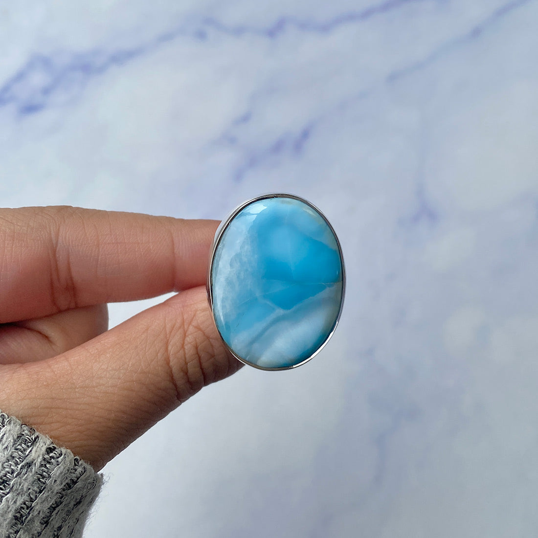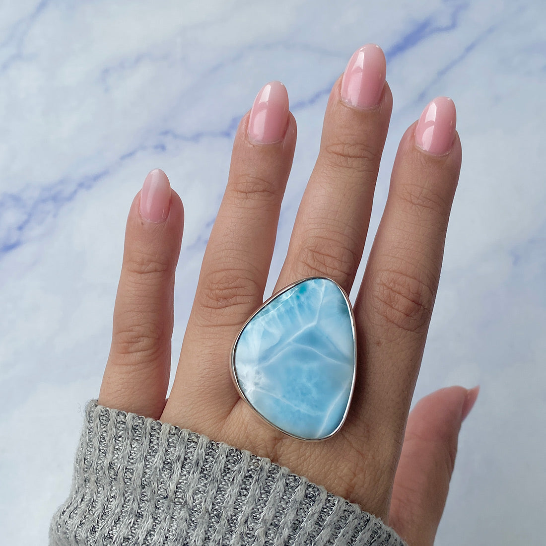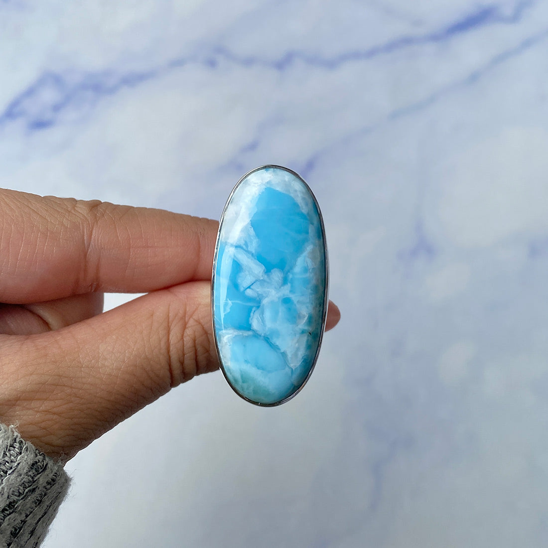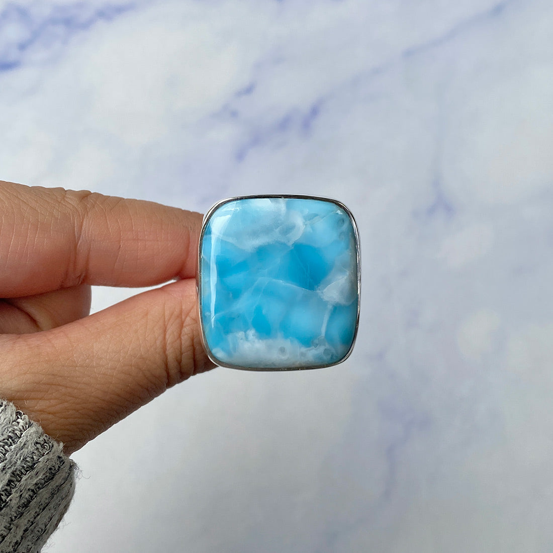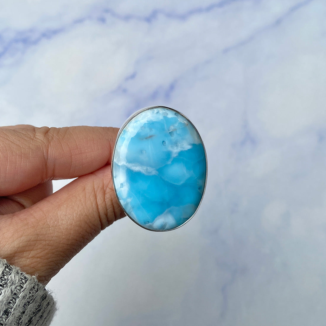 Larimar rings are thought to provide a number of therapeutic benefits. It is claimed to give relaxation and lessen tension and anxiety in the wearer by having a calming and soothing impact. Larimar's stunning blue hue is frequently connected to the sky and the ocean, fostering calm and peace. Some people think that wearing Larimar jewelry, such as Larimar bracelets, earrings, Larimar pendants, and necklaces, can aid in calming the mind and promoting inner peace.