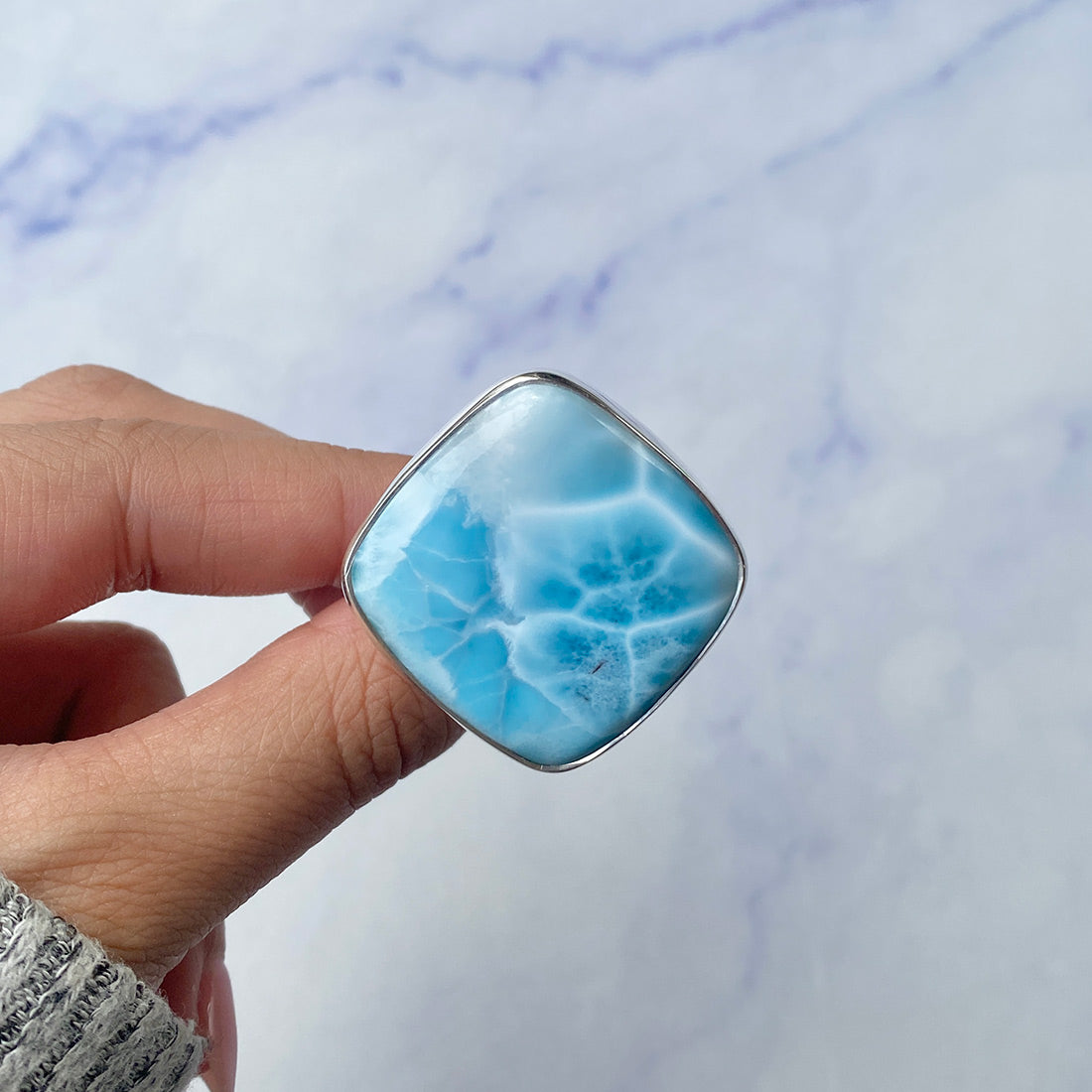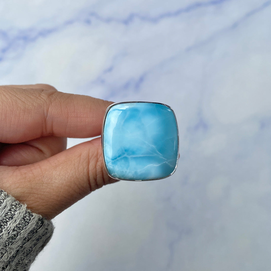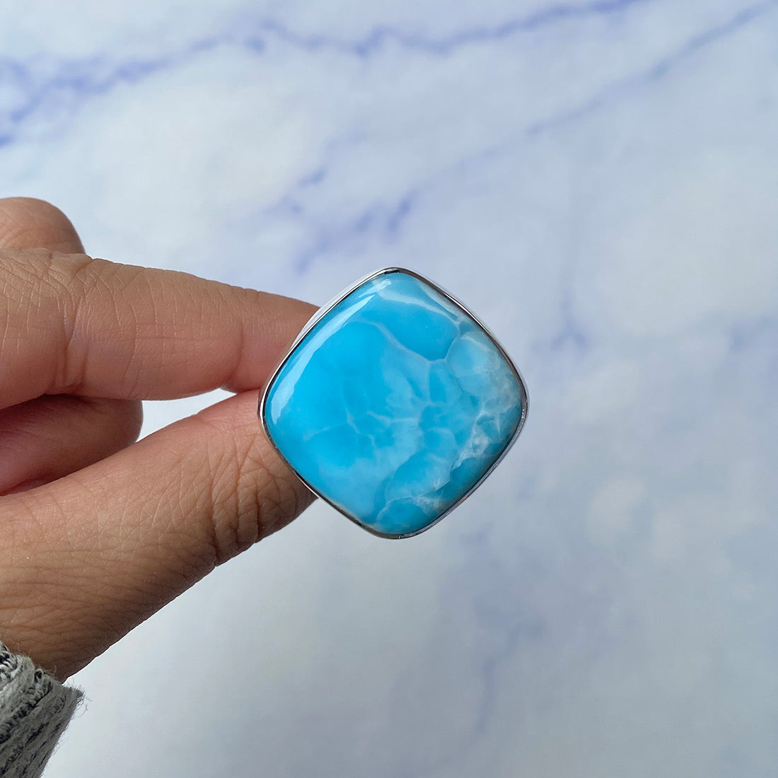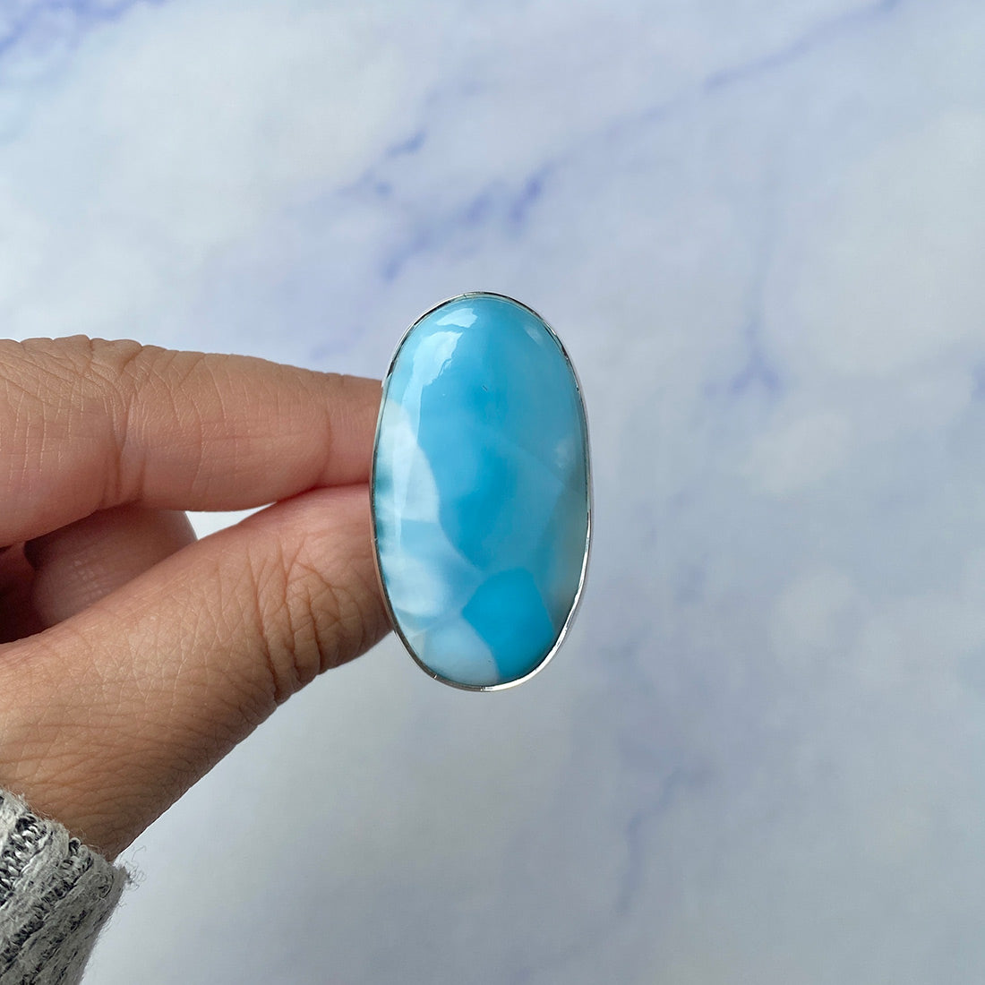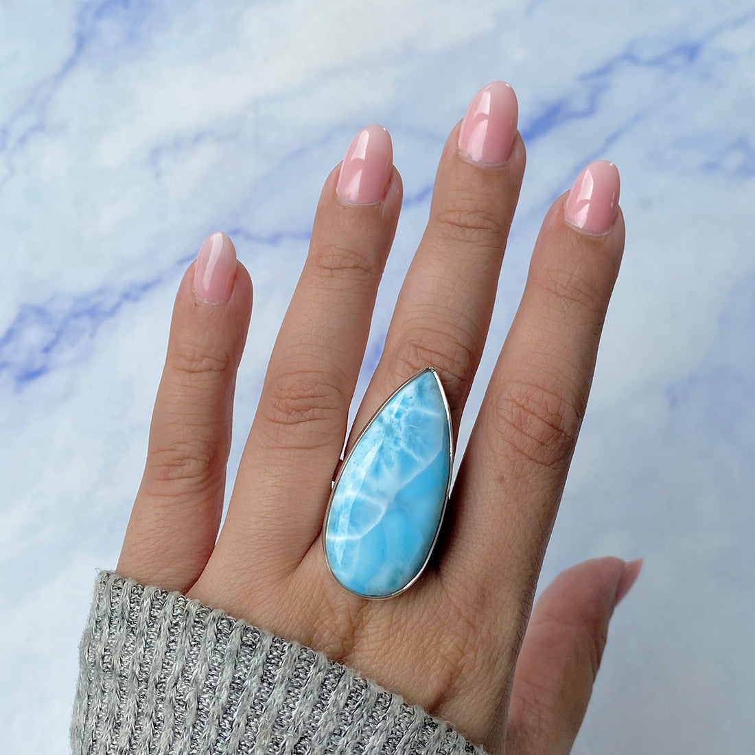 Larimar rings are thought to provide a number of therapeutic benefits. It is claimed to give relaxation and lessen tension and anxiety in the wearer by having a calming and soothing impact. Larimar's stunning blue hue is frequently connected to the sky and the ocean, fostering calm and peace. Some people think that wearing Larimar jewelry, such as Larimar bracelets, earrings, Larimar pendants, and necklaces, can aid in calming the mind and promoting inner peace.