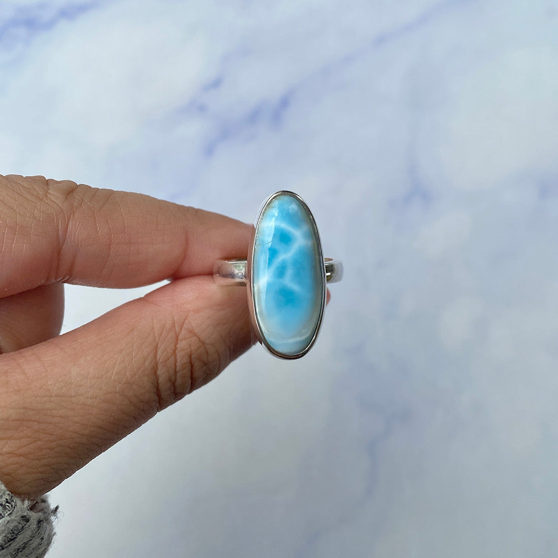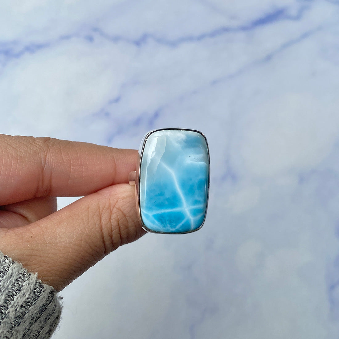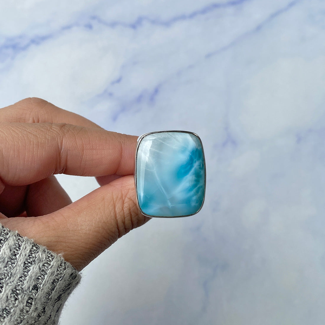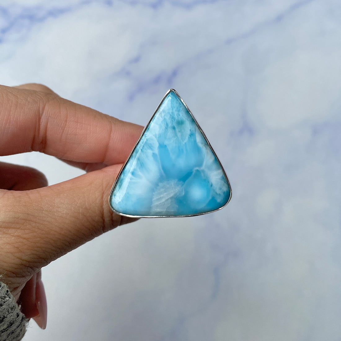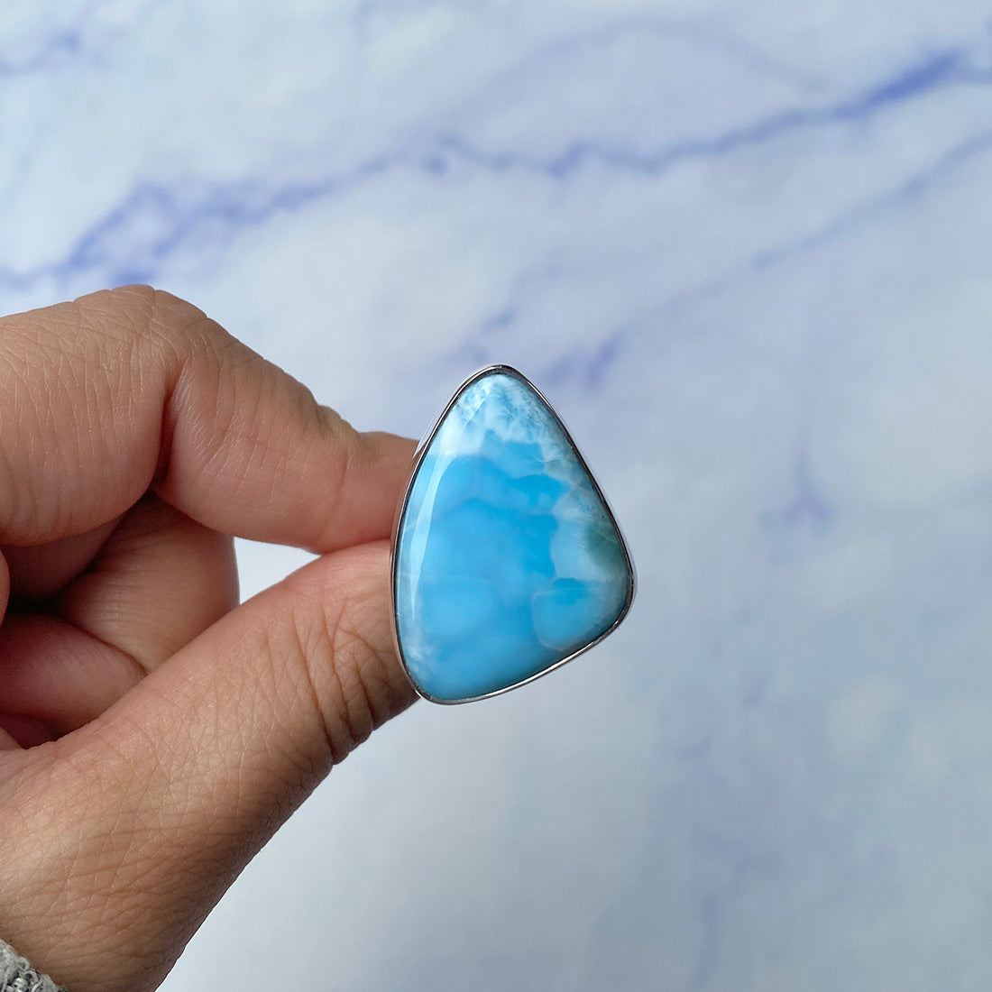 Larimar rings are thought to provide a number of therapeutic benefits. It is claimed to give relaxation and lessen tension and anxiety in the wearer by having a calming and soothing impact. Larimar's stunning blue hue is frequently connected to the sky and the ocean, fostering calm and peace. Some people think that wearing Larimar jewelry, such as Larimar bracelets, earrings, Larimar pendants, and necklaces, can aid in calming the mind and promoting inner peace.