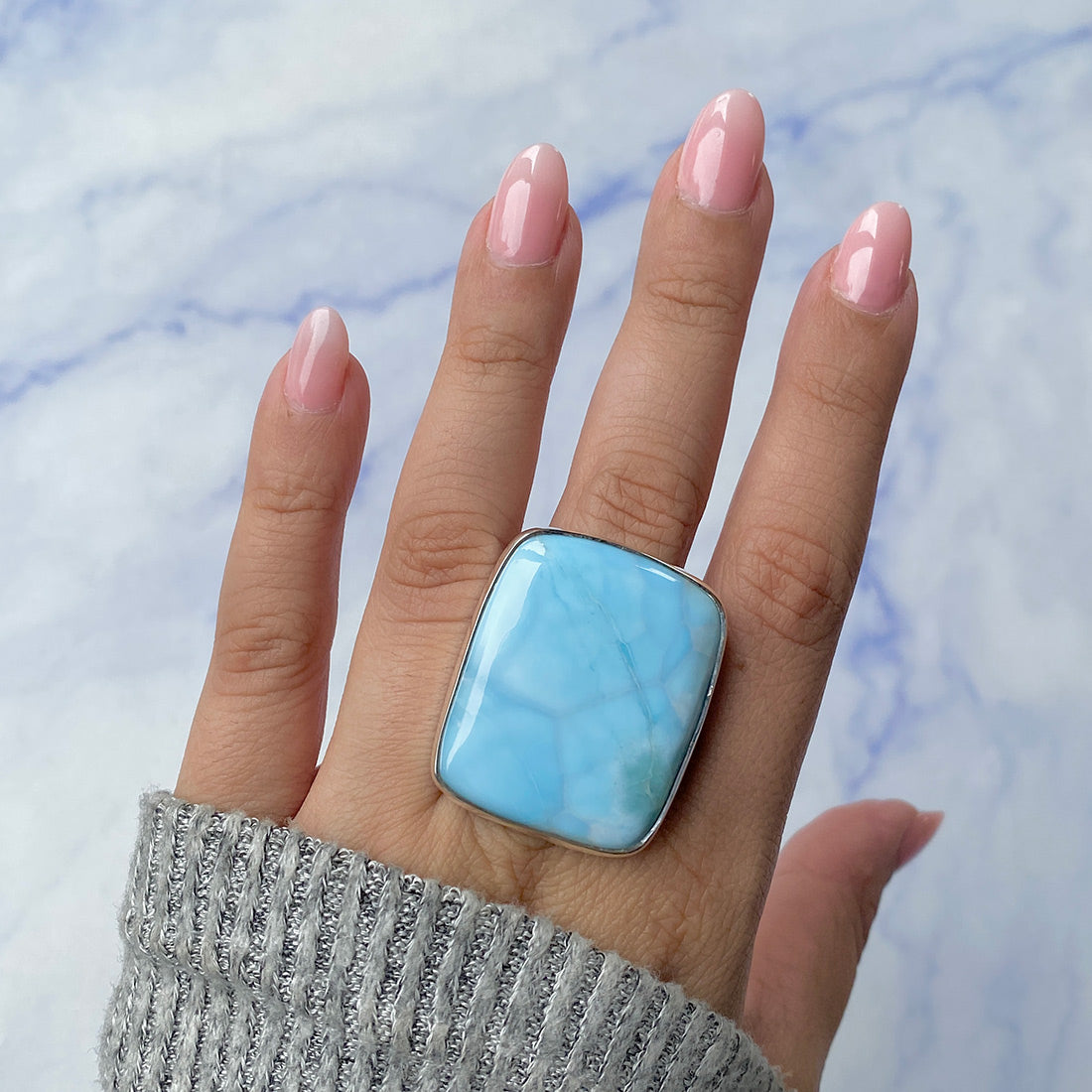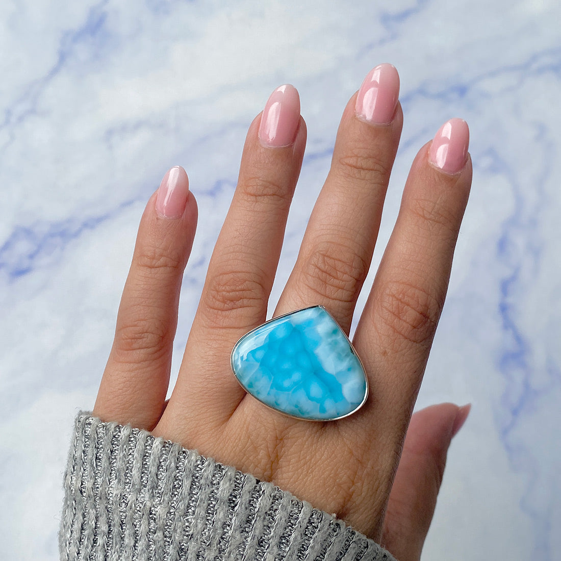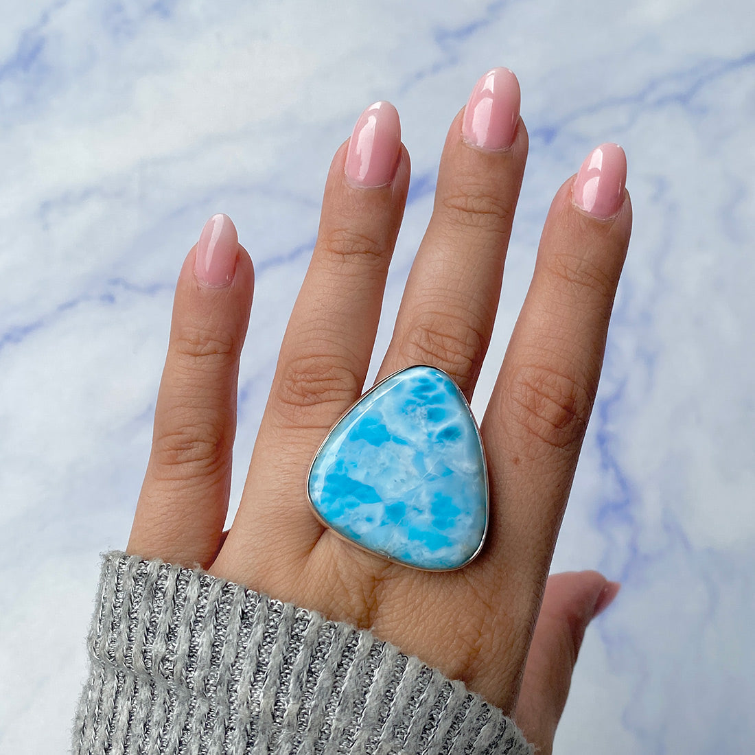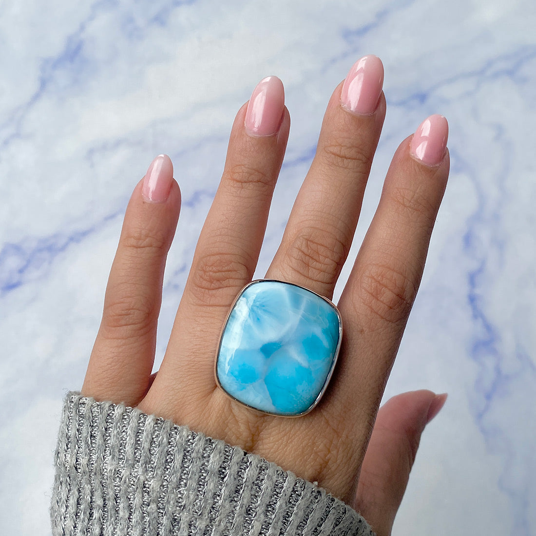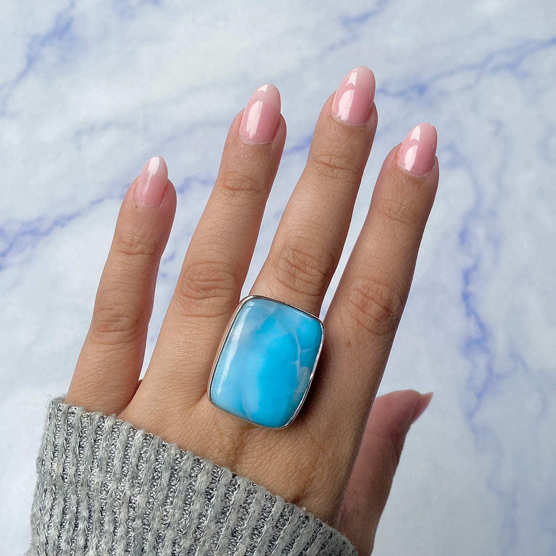 Larimar rings are thought to provide a number of therapeutic benefits. It is claimed to give relaxation and lessen tension and anxiety in the wearer by having a calming and soothing impact. Larimar's stunning blue hue is frequently connected to the sky and the ocean, fostering calm and peace. Some people think that wearing Larimar jewelry, such as Larimar bracelets, earrings, Larimar pendants, and necklaces, can aid in calming the mind and promoting inner peace.