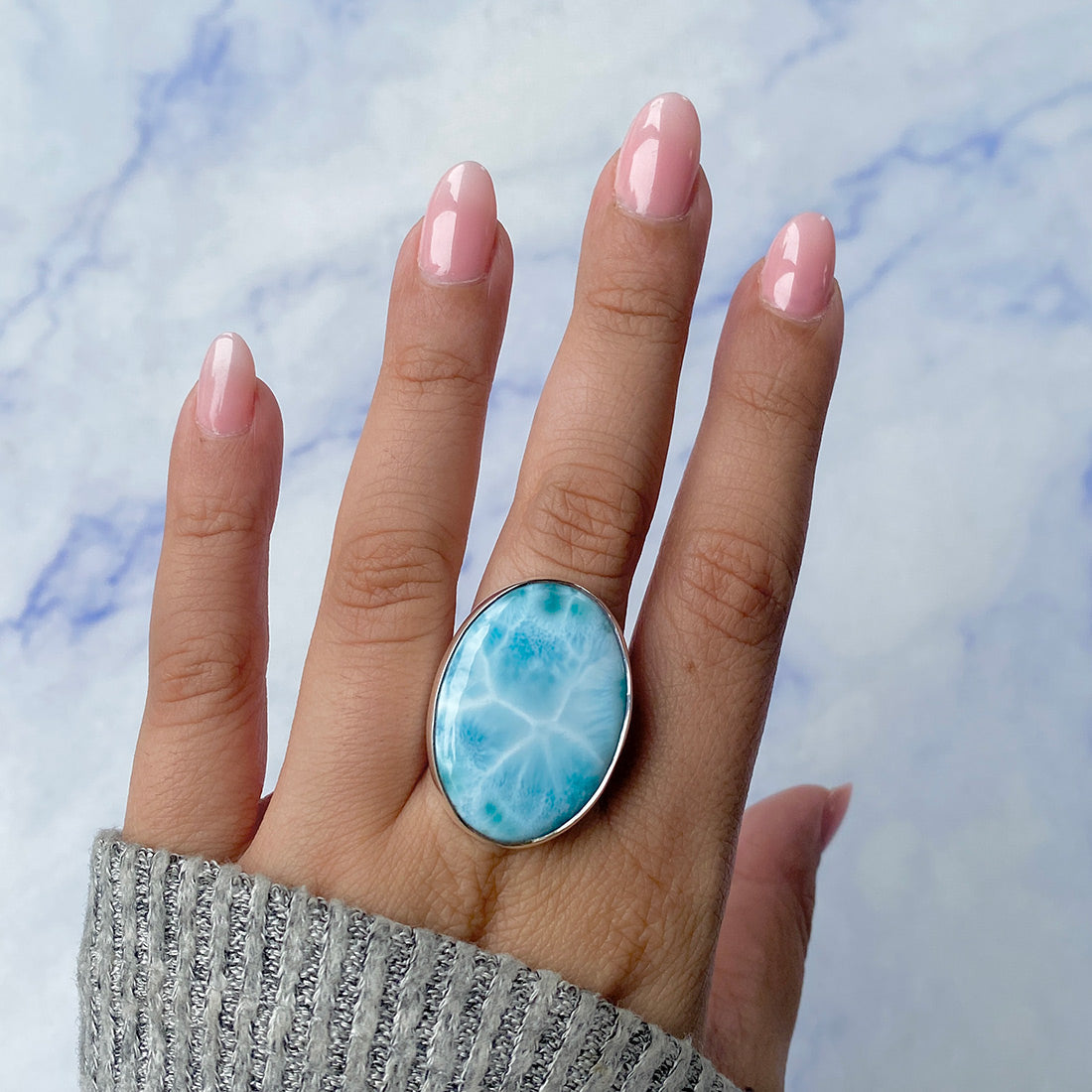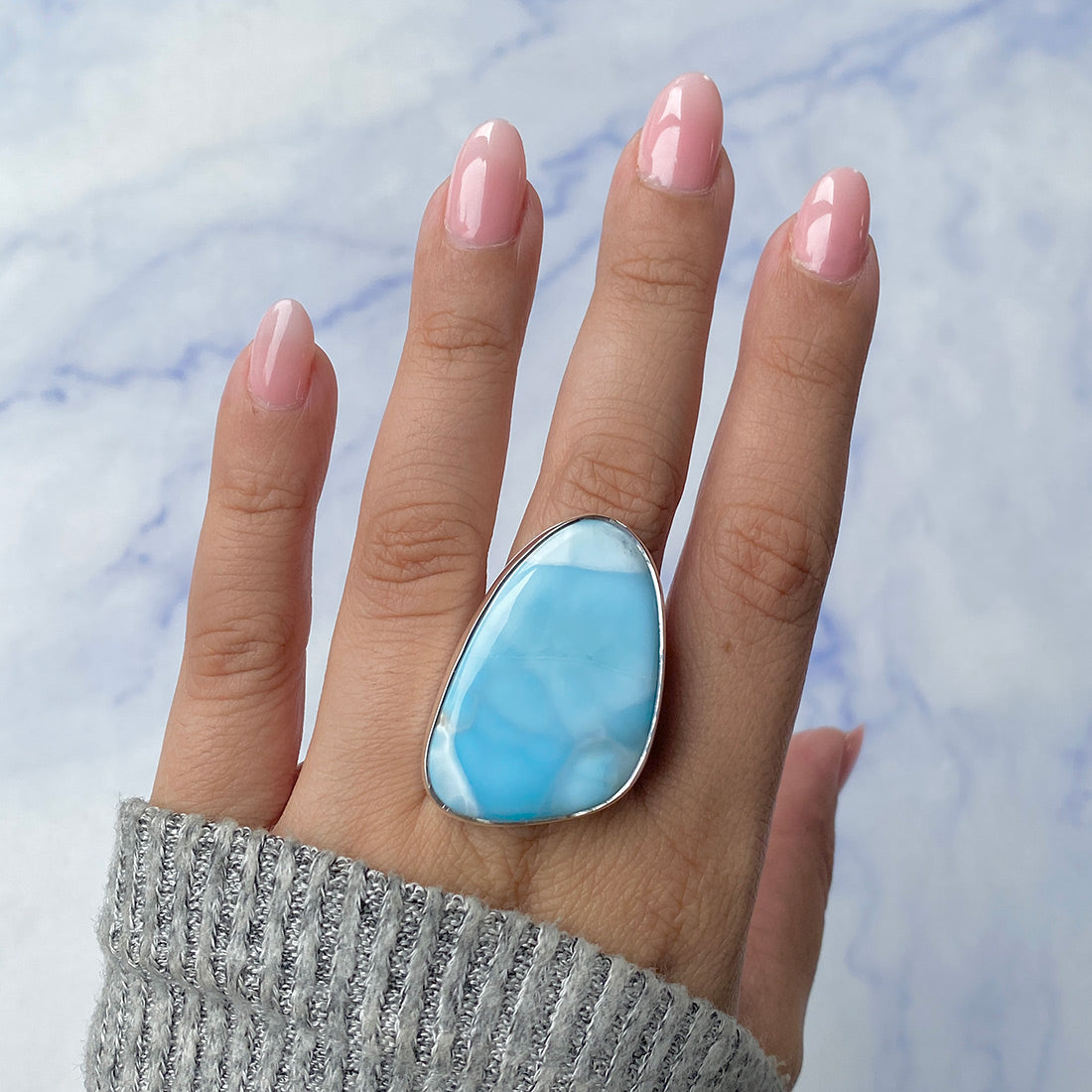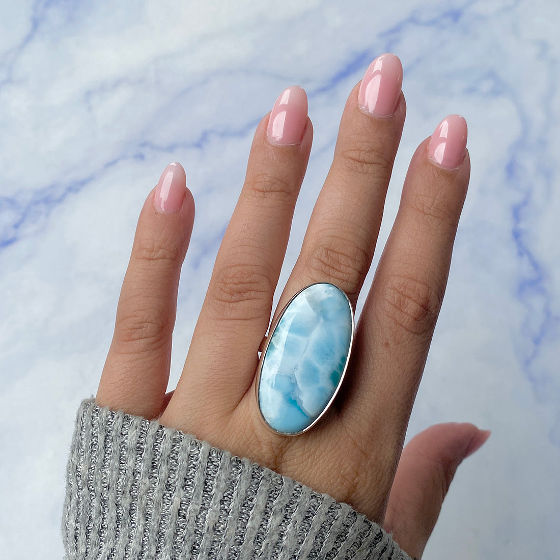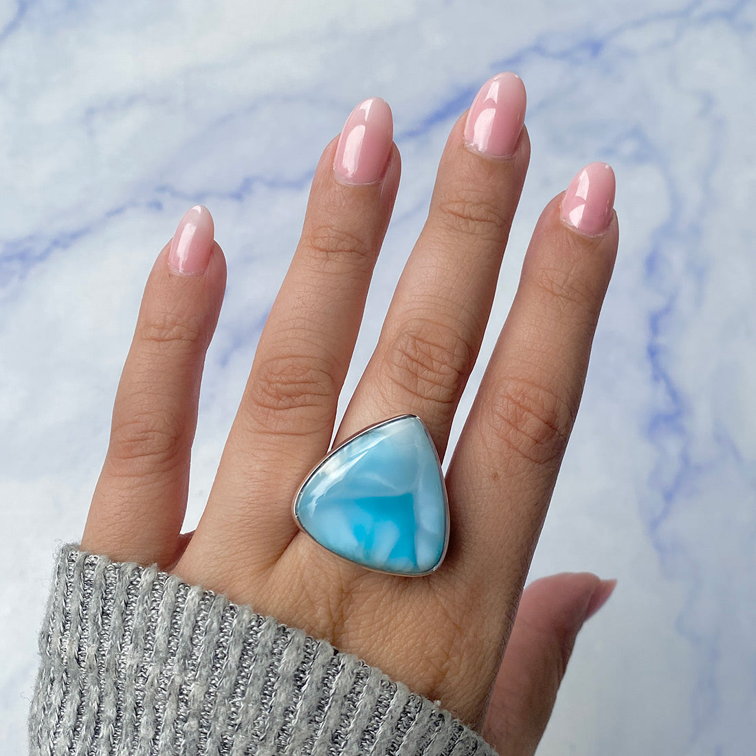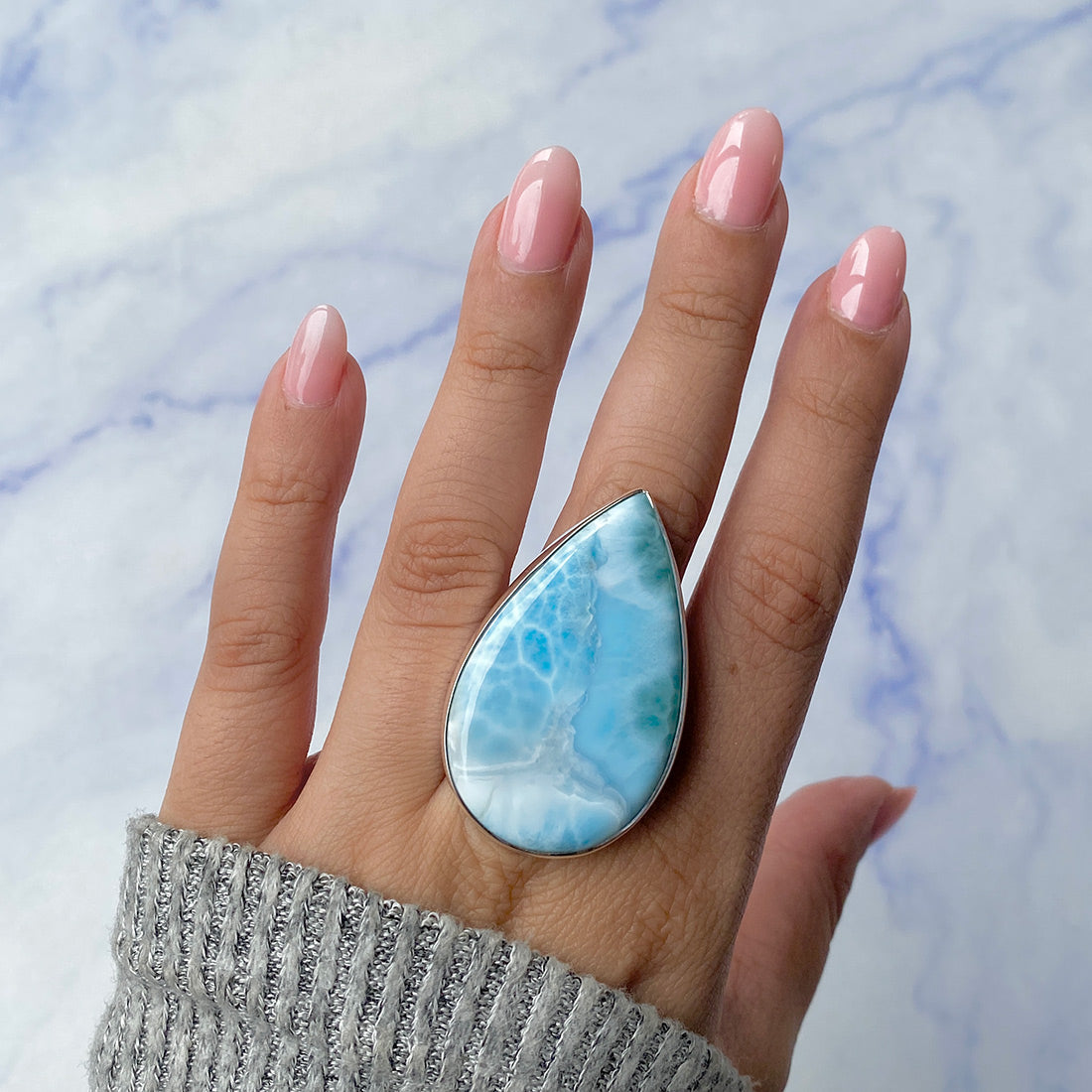 Larimar rings are thought to provide a number of therapeutic benefits. It is claimed to give relaxation and lessen tension and anxiety in the wearer by having a calming and soothing impact. Larimar's stunning blue hue is frequently connected to the sky and the ocean, fostering calm and peace. Some people think that wearing Larimar jewelry, such as Larimar bracelets, earrings, Larimar pendants, and necklaces, can aid in calming the mind and promoting inner peace.
