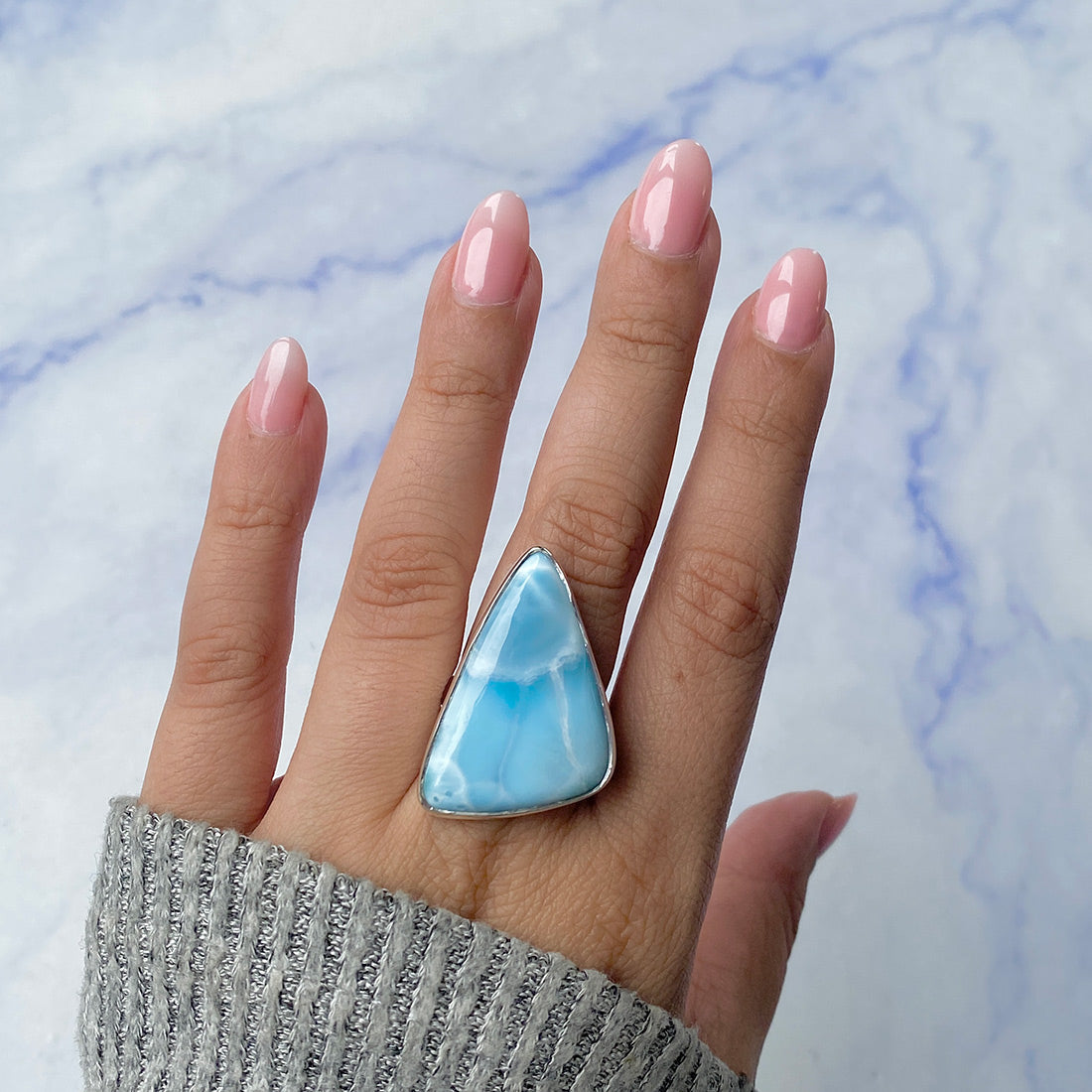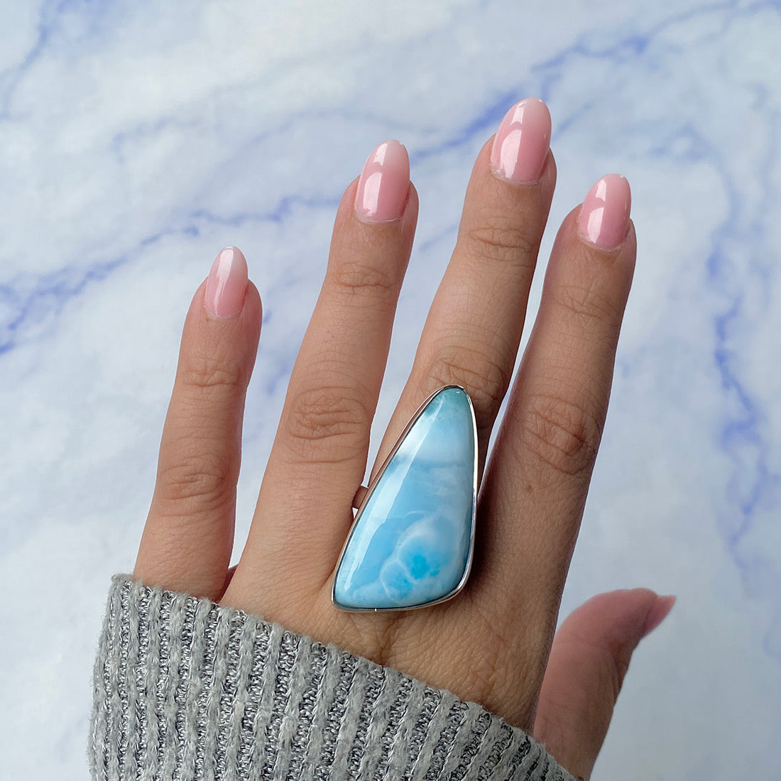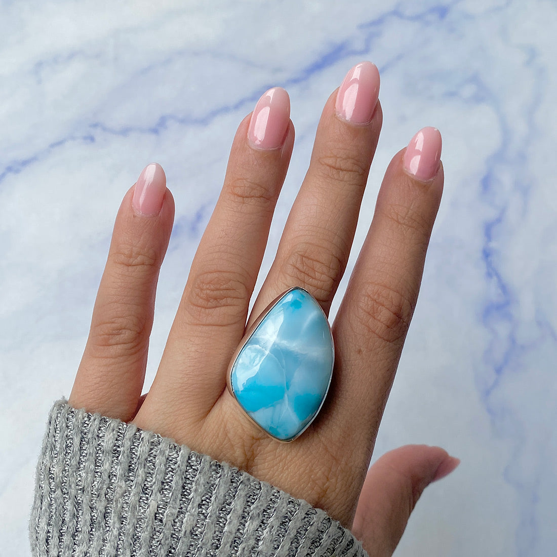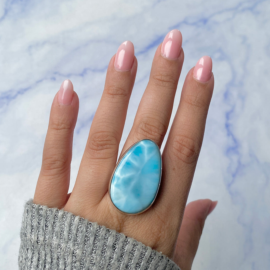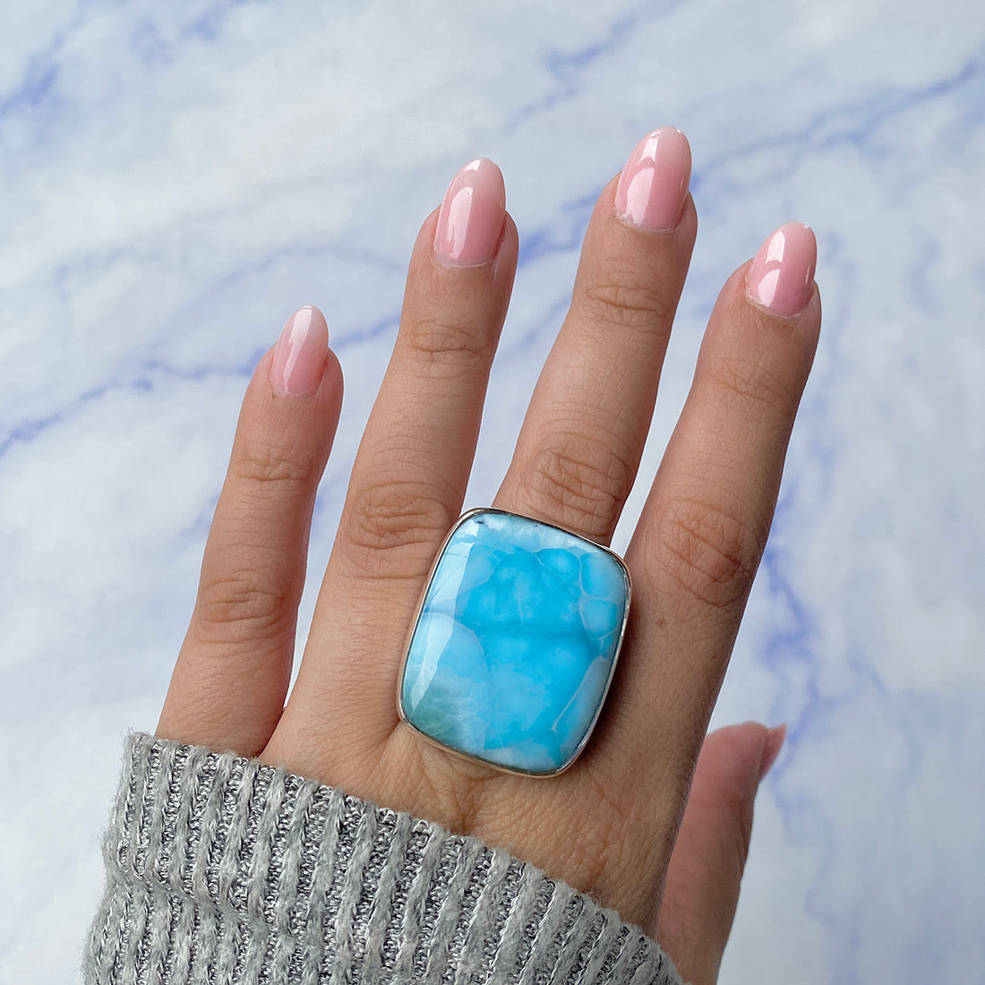 Larimar rings are thought to provide a number of therapeutic benefits. It is claimed to give relaxation and lessen tension and anxiety in the wearer by having a calming and soothing impact. Larimar's stunning blue hue is frequently connected to the sky and the ocean, fostering calm and peace. Some people think that wearing Larimar jewelry, such as Larimar bracelets, earrings, Larimar pendants, and necklaces, can aid in calming the mind and promoting inner peace.