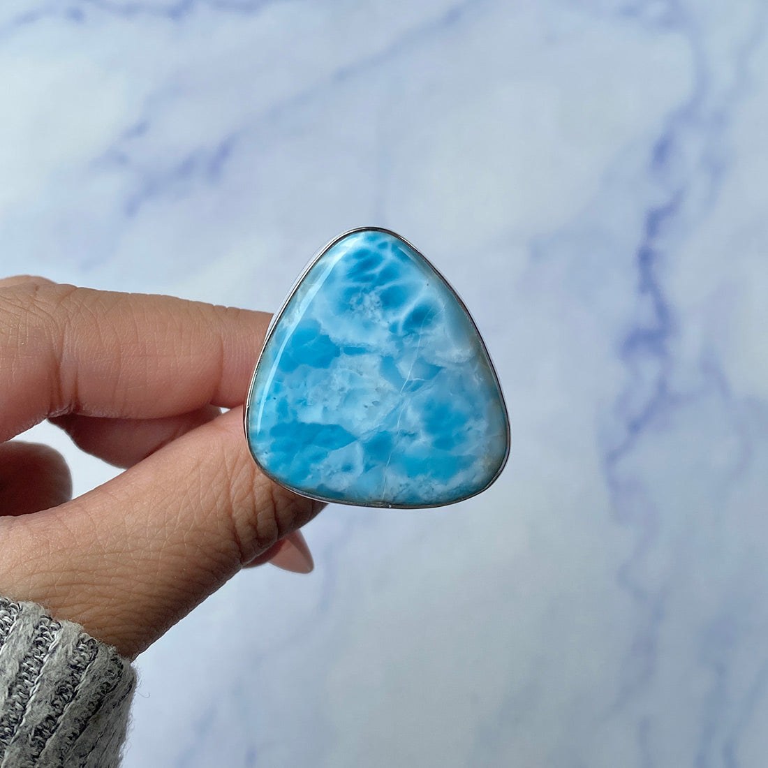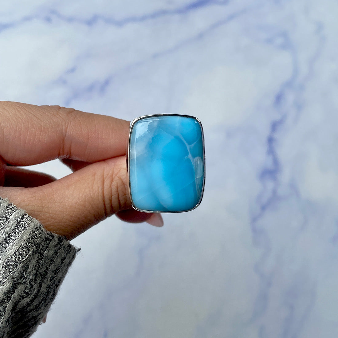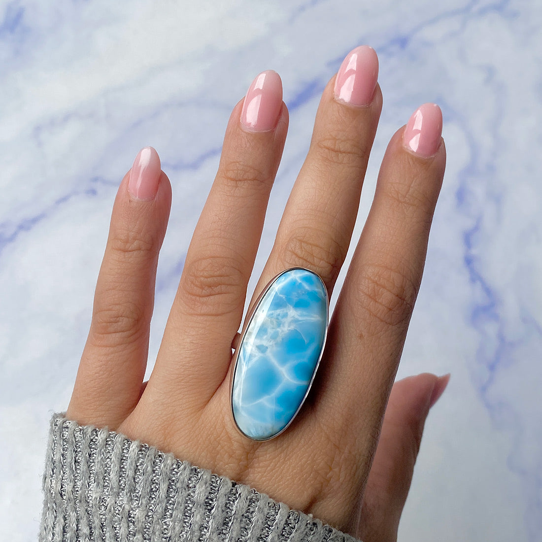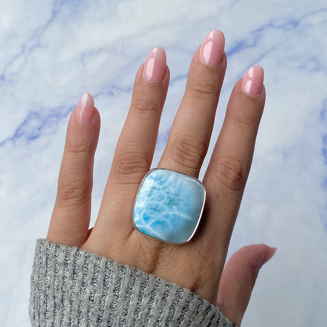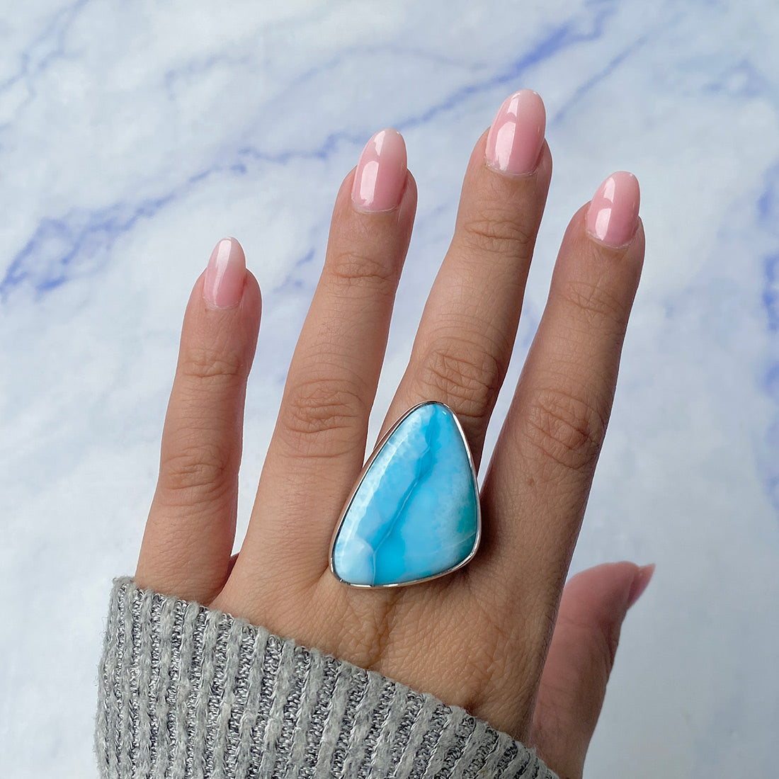 Larimar rings are thought to provide a number of therapeutic benefits. It is claimed to give relaxation and lessen tension and anxiety in the wearer by having a calming and soothing impact. Larimar's stunning blue hue is frequently connected to the sky and the ocean, fostering calm and peace. Some people think that wearing Larimar jewelry, such as Larimar bracelets, earrings, Larimar pendants, and necklaces, can aid in calming the mind and promoting inner peace.