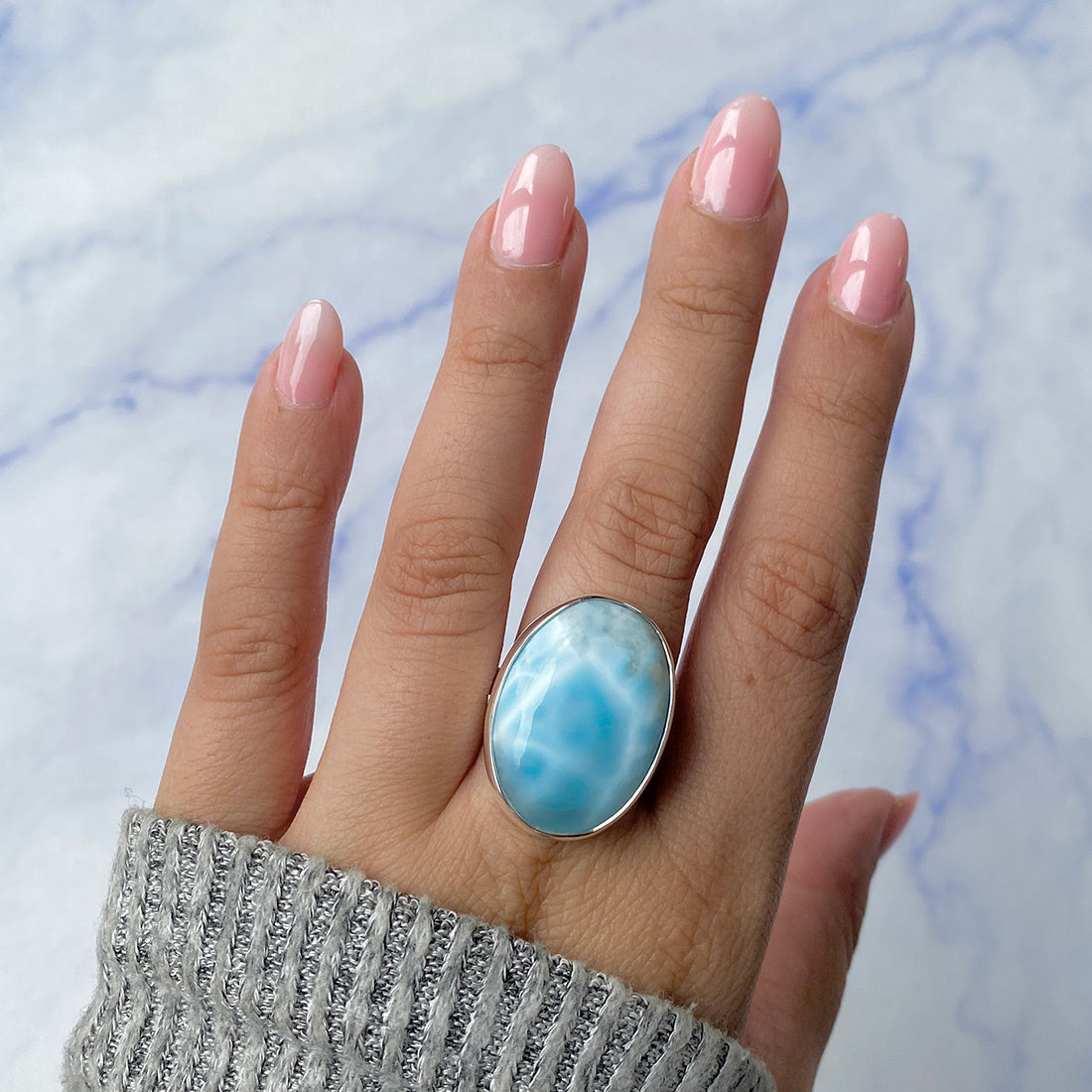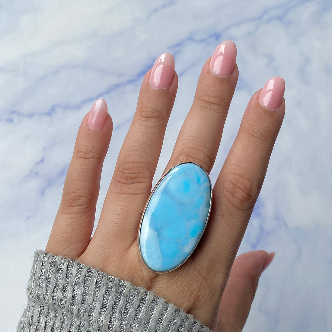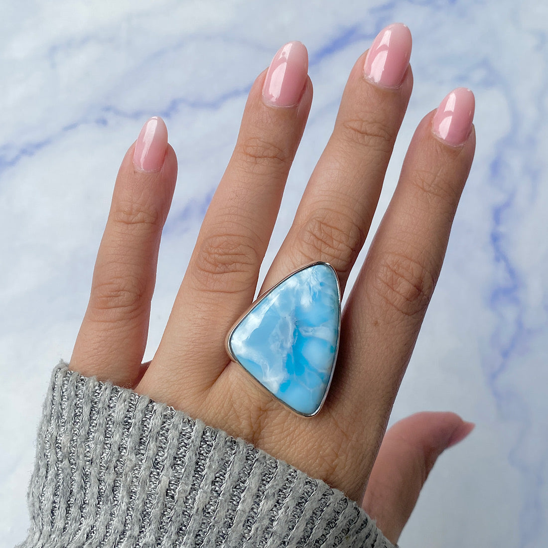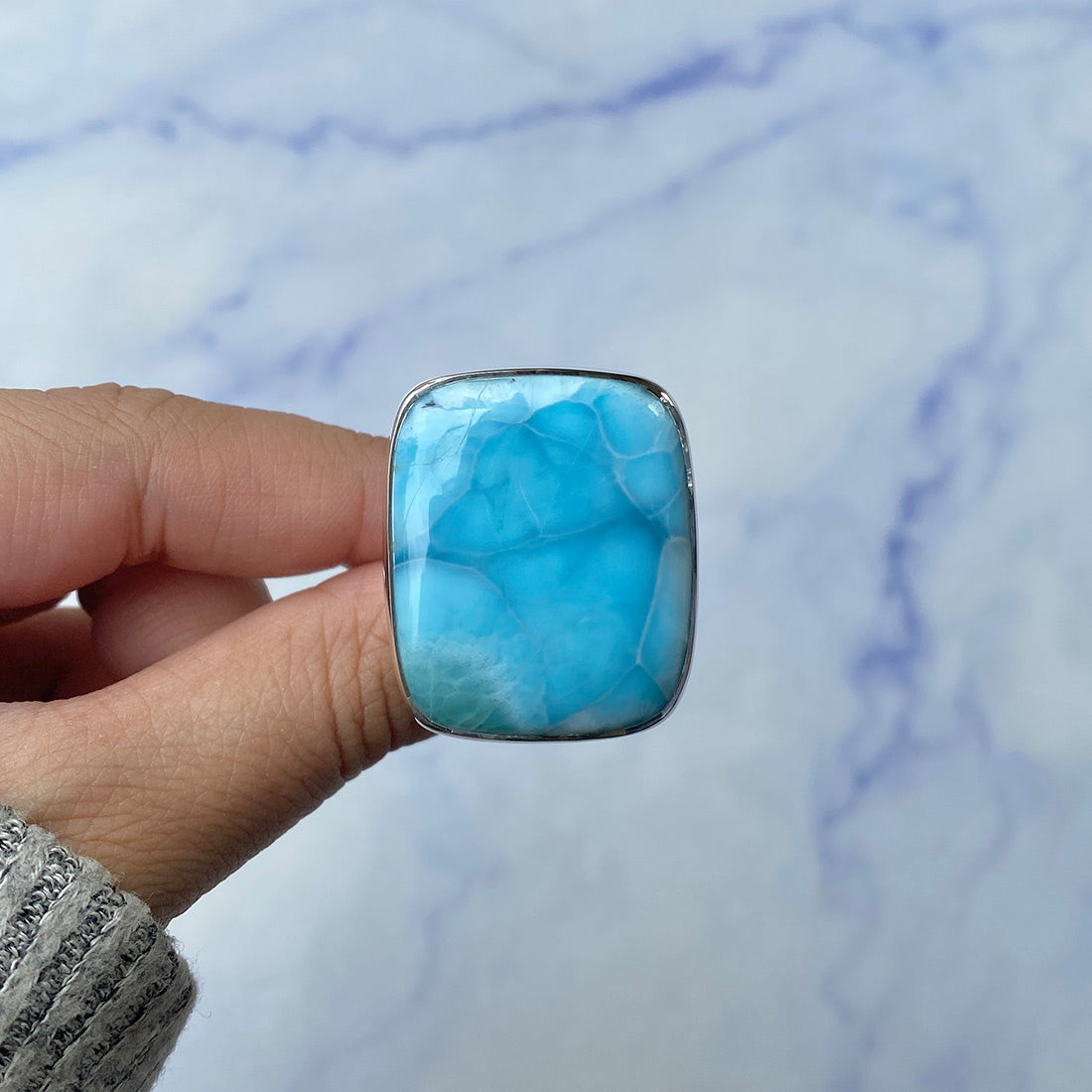 Larimar rings are thought to provide a number of therapeutic benefits. It is claimed to give relaxation and lessen tension and anxiety in the wearer by having a calming and soothing impact. Larimar's stunning blue hue is frequently connected to the sky and the ocean, fostering calm and peace. Some people think that wearing Larimar jewelry, such as Larimar bracelets, earrings, Larimar pendants, and necklaces, can aid in calming the mind and promoting inner peace.