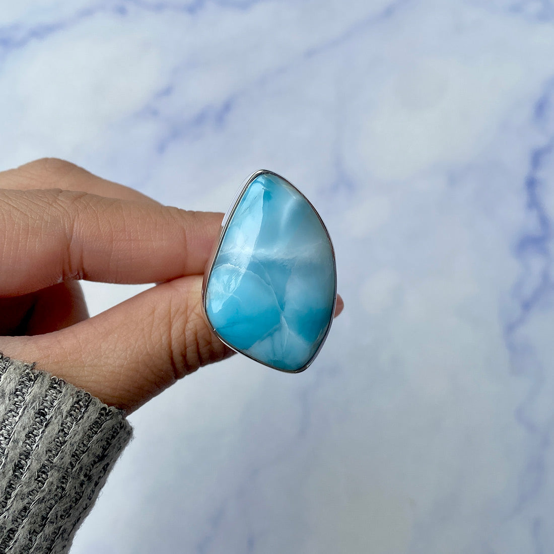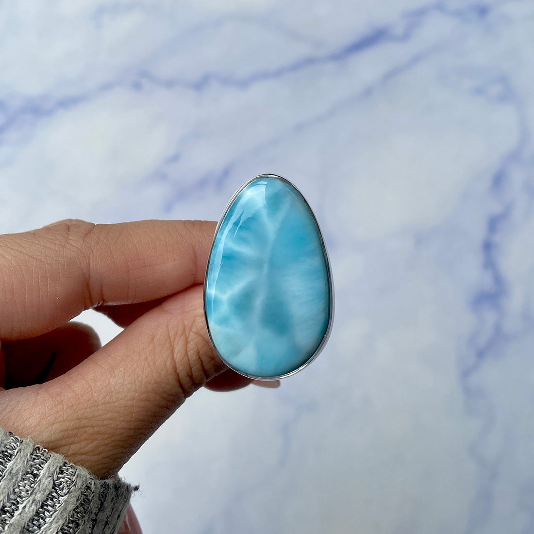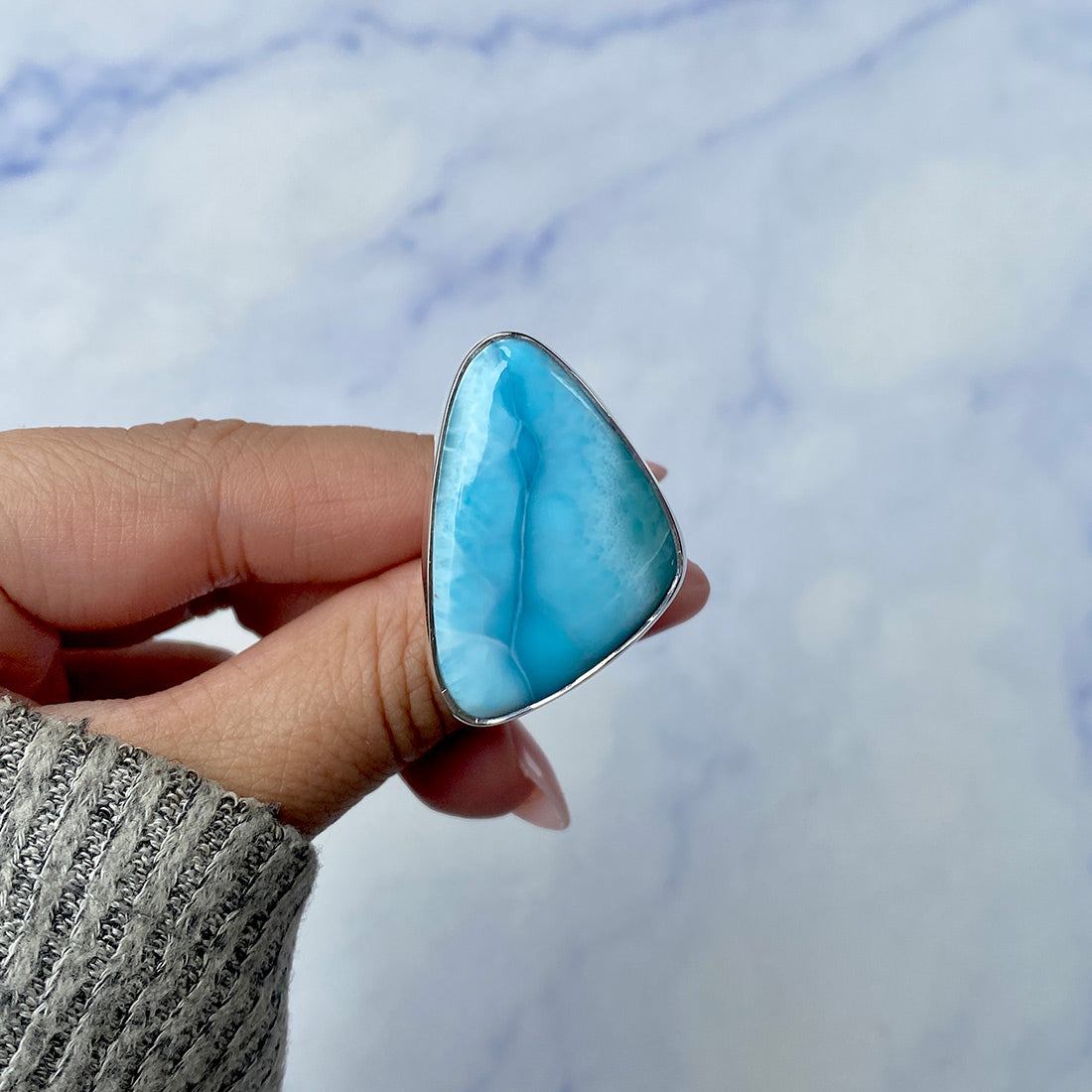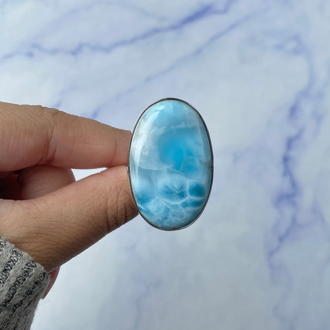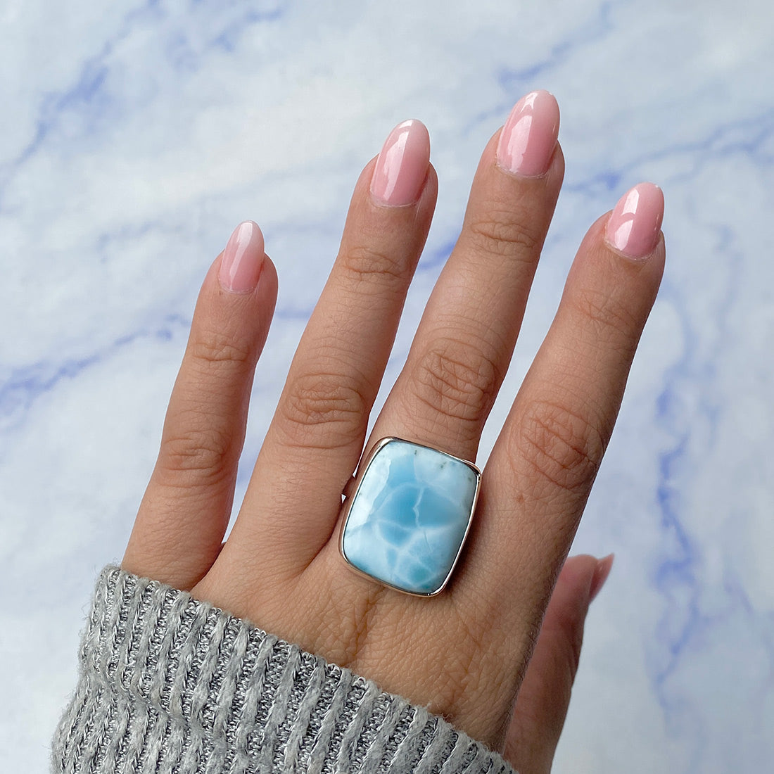 Larimar rings are thought to provide a number of therapeutic benefits. It is claimed to give relaxation and lessen tension and anxiety in the wearer by having a calming and soothing impact. Larimar's stunning blue hue is frequently connected to the sky and the ocean, fostering calm and peace. Some people think that wearing Larimar jewelry, such as Larimar bracelets, earrings, Larimar pendants, and necklaces, can aid in calming the mind and promoting inner peace.