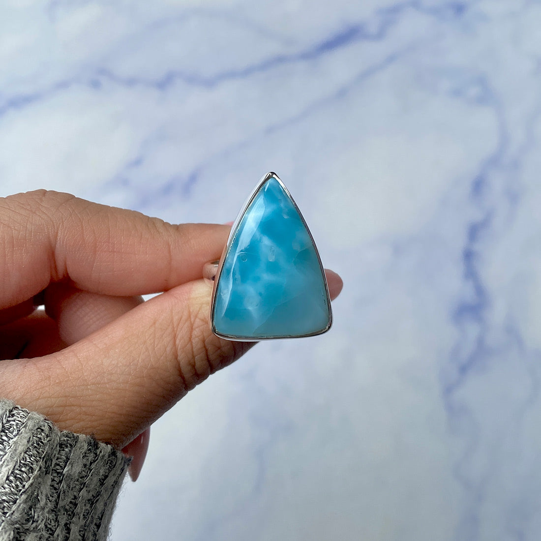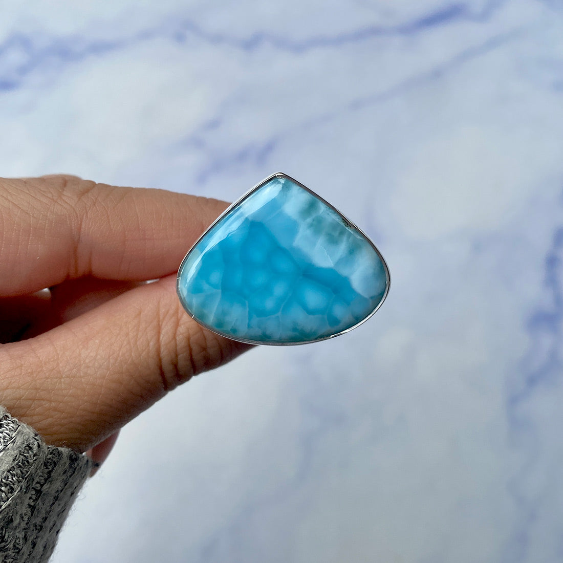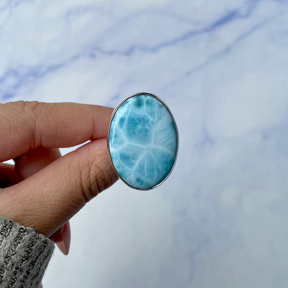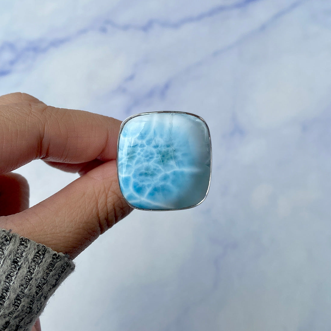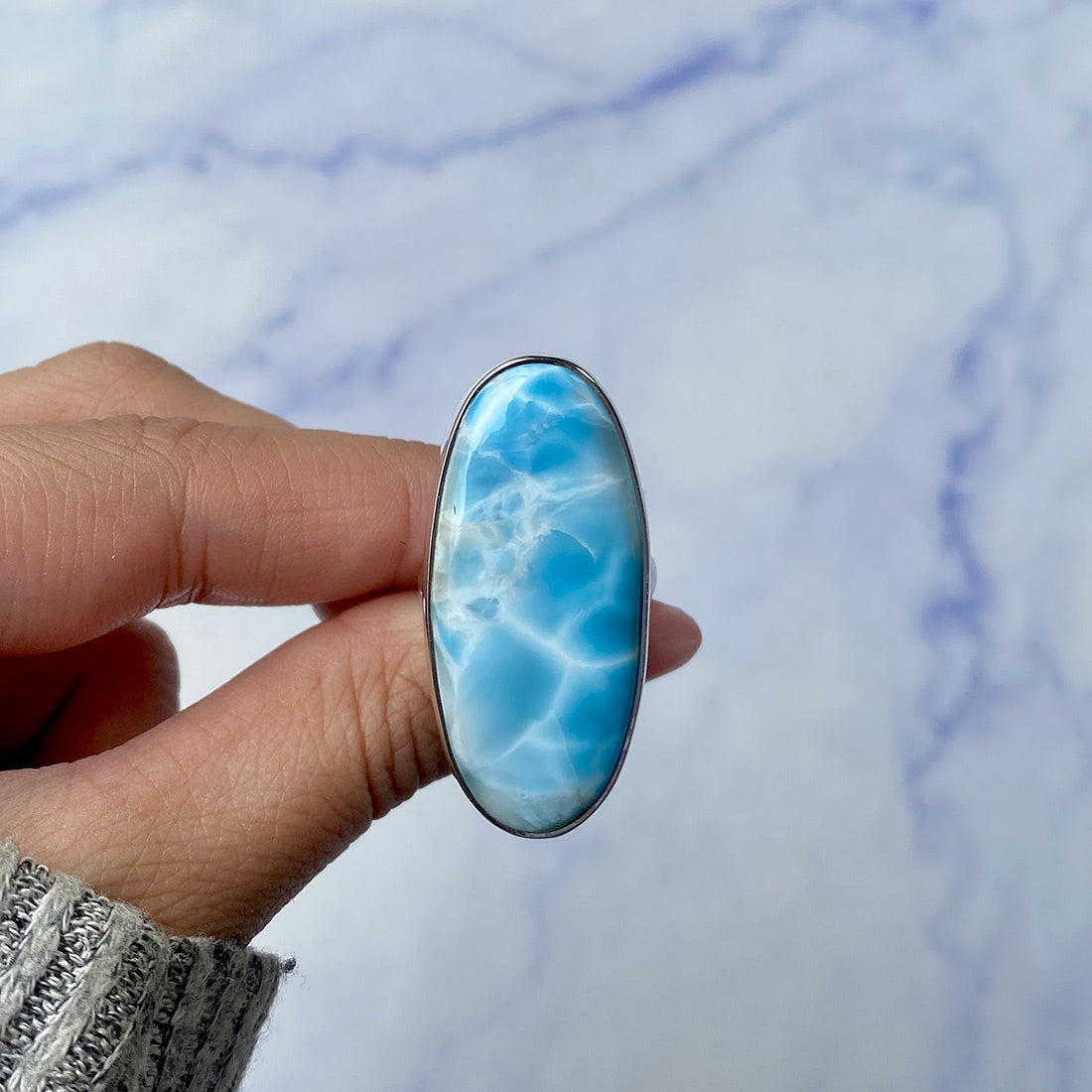 Larimar rings are thought to provide a number of therapeutic benefits. It is claimed to give relaxation and lessen tension and anxiety in the wearer by having a calming and soothing impact. Larimar's stunning blue hue is frequently connected to the sky and the ocean, fostering calm and peace. Some people think that wearing Larimar jewelry, such as Larimar bracelets, earrings, Larimar pendants, and necklaces, can aid in calming the mind and promoting inner peace.