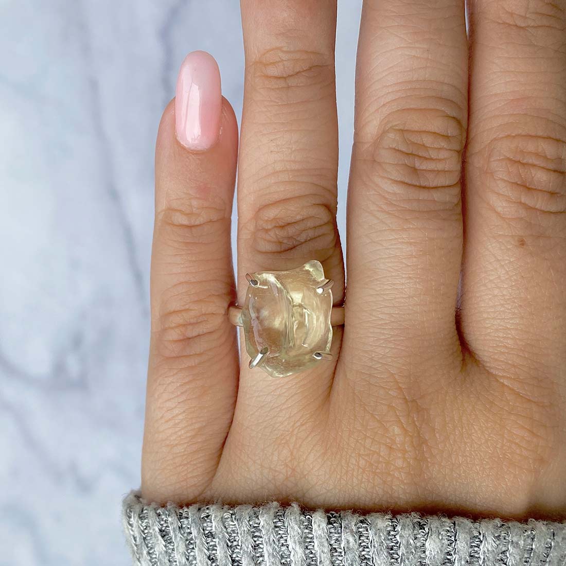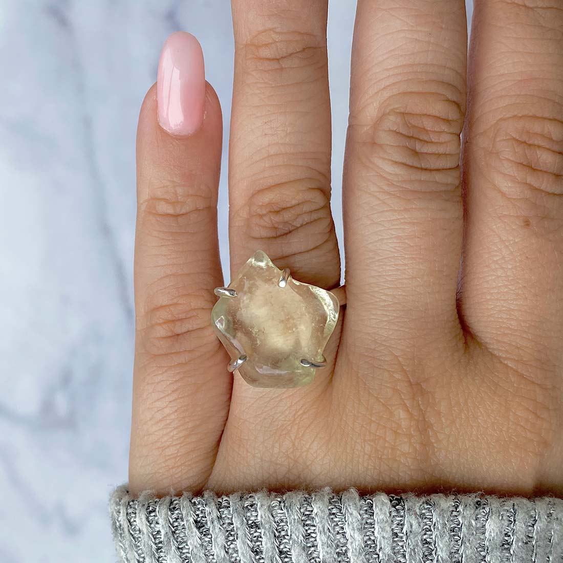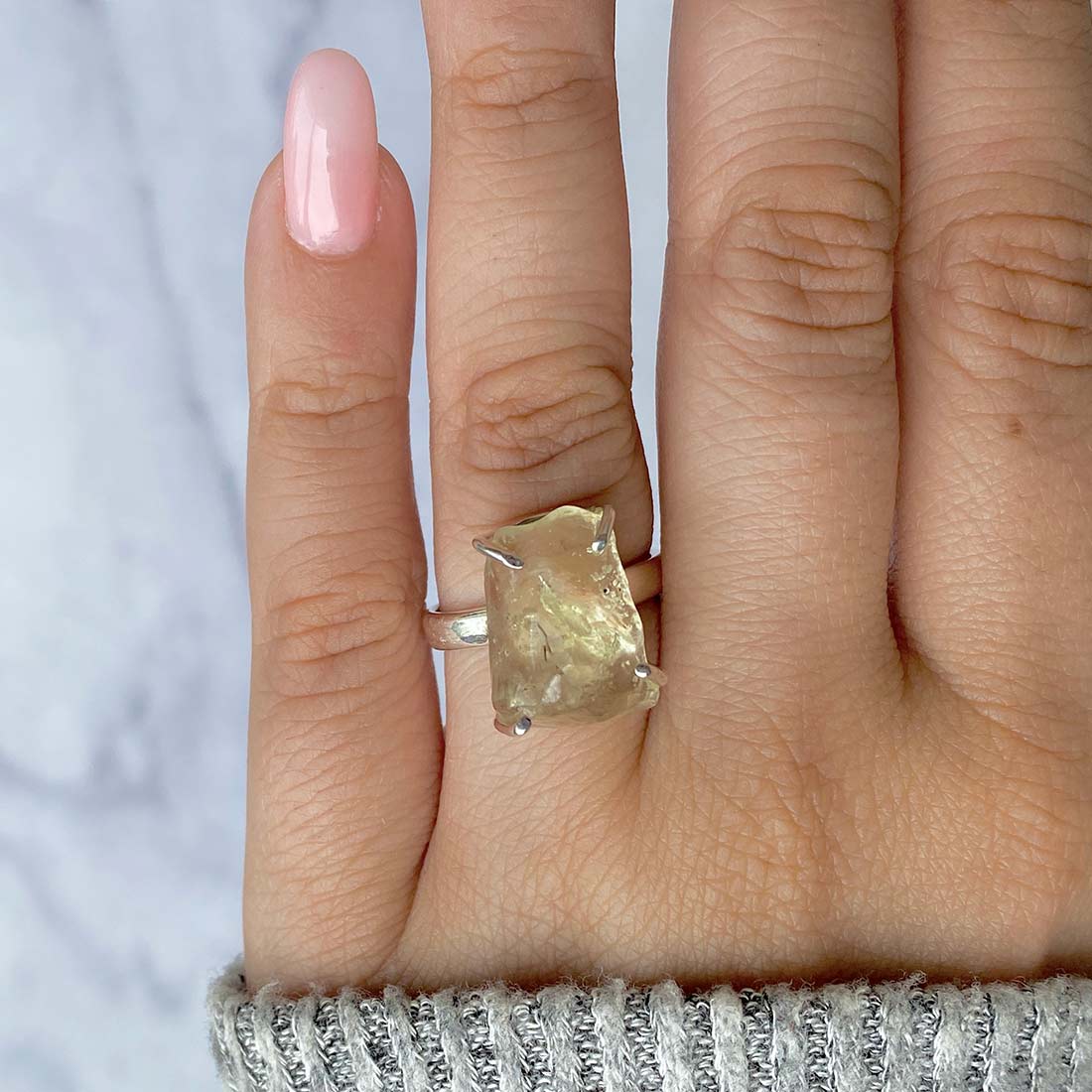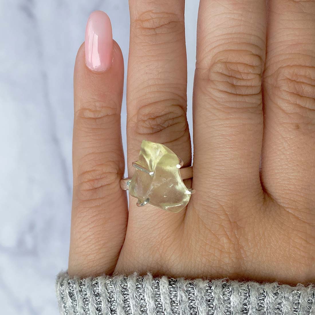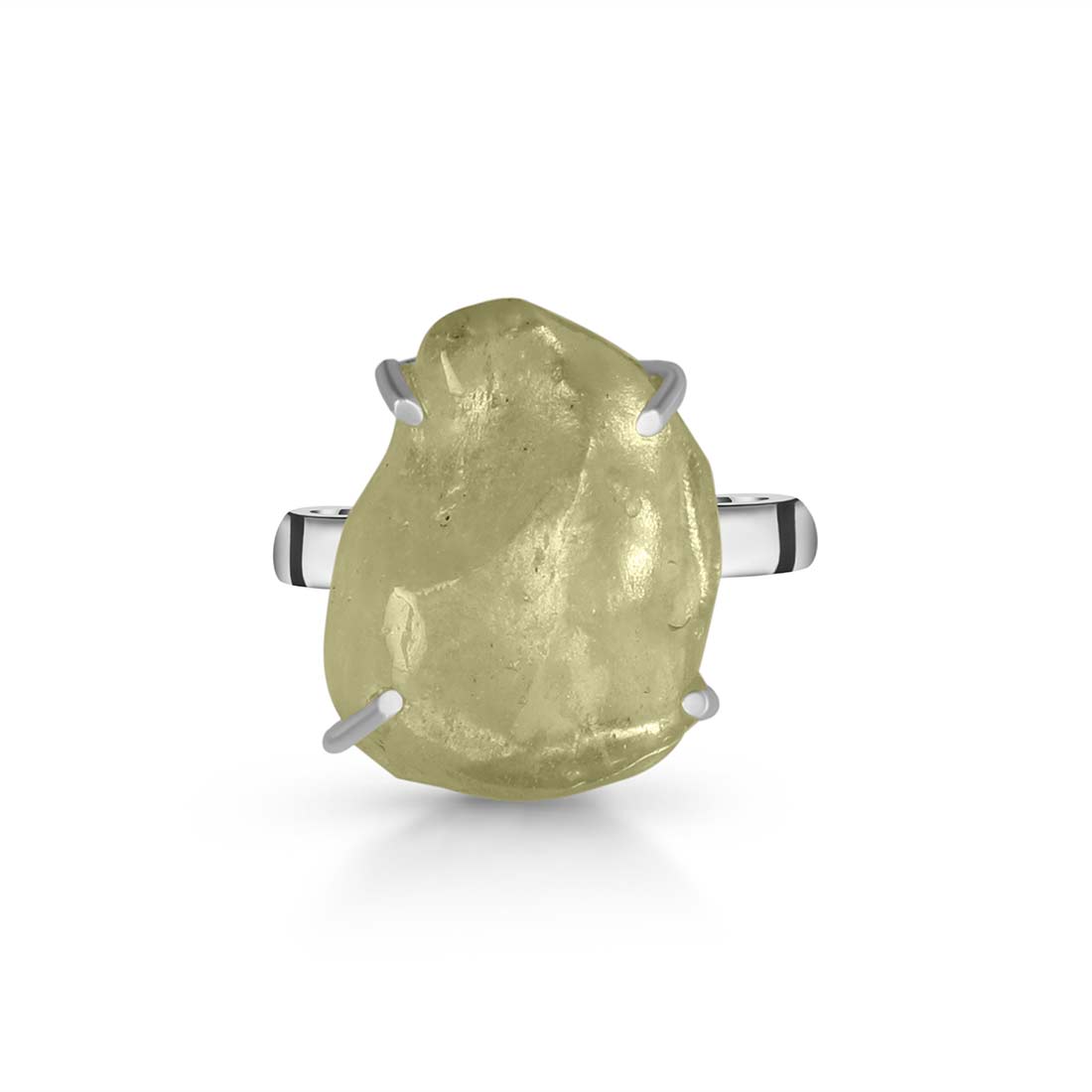 This rare gold, yellow-tinged Tektite contains higher levels of silica, aluminum, and iron oxides, along with trace amounts of elements like titanium, nickel, and cobalt. This symphony of chemical properties gives the glass its transparency, strength, and durability with a 6.5–7 Mohs hardness. So, you can accessorize your Libyan Desert Glass rings on a daily basis to embrace its healing vibrations.
