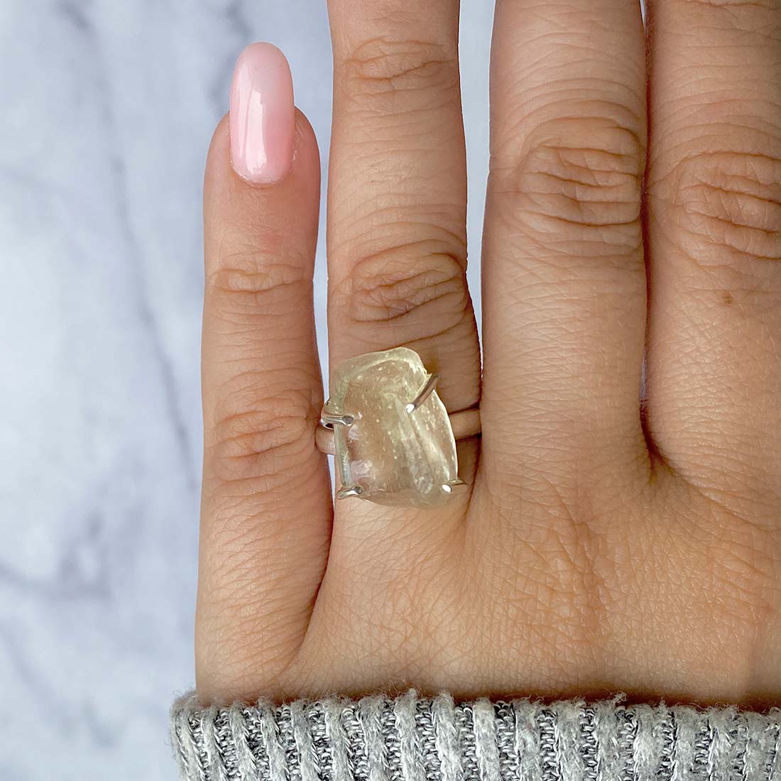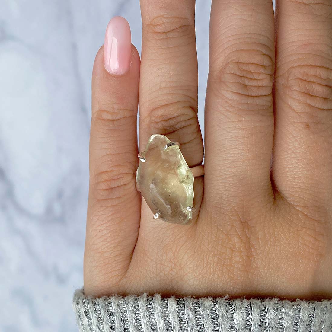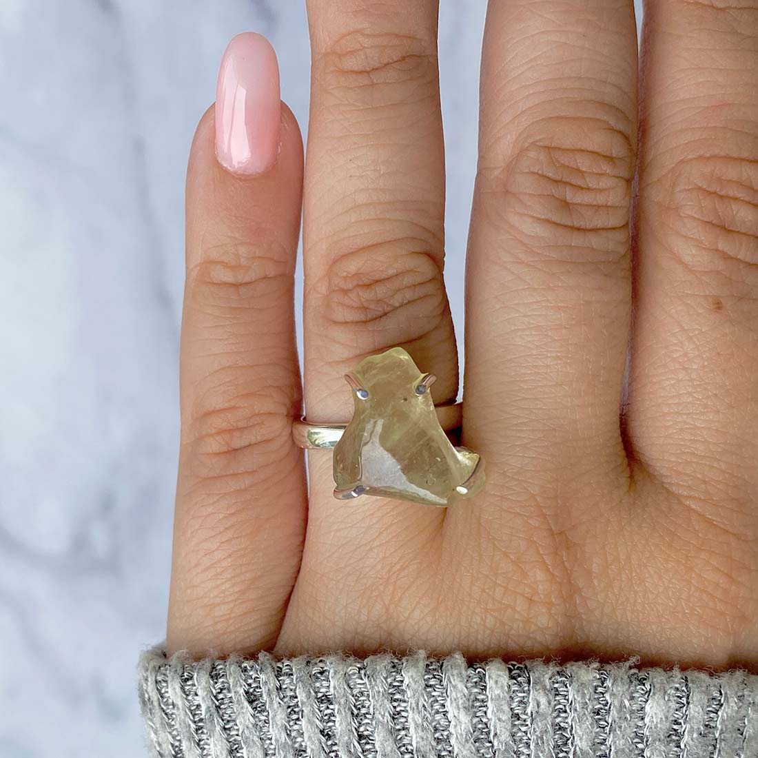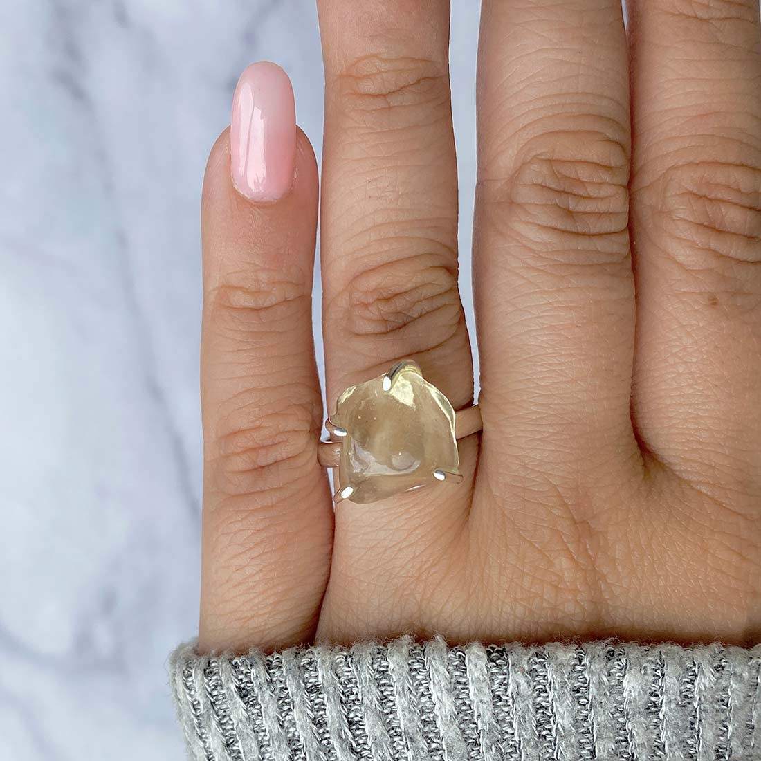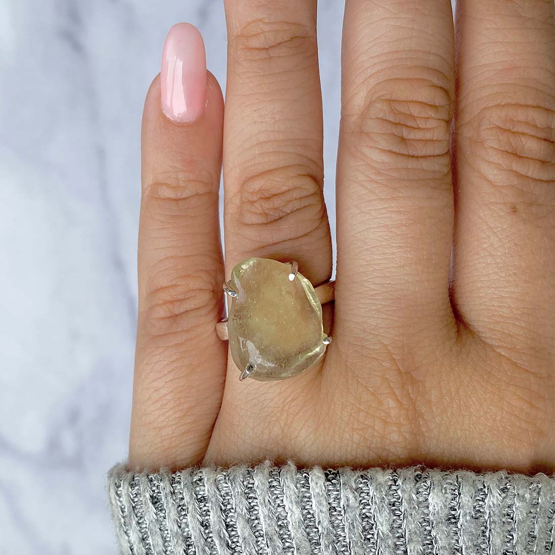 This rare gold, yellow-tinged Tektite contains higher levels of silica, aluminum, and iron oxides, along with trace amounts of elements like titanium, nickel, and cobalt. This symphony of chemical properties gives the glass its transparency, strength, and durability with a 6.5–7 Mohs hardness. So, you can accessorize your Libyan Desert Glass rings on a daily basis to embrace its healing vibrations.