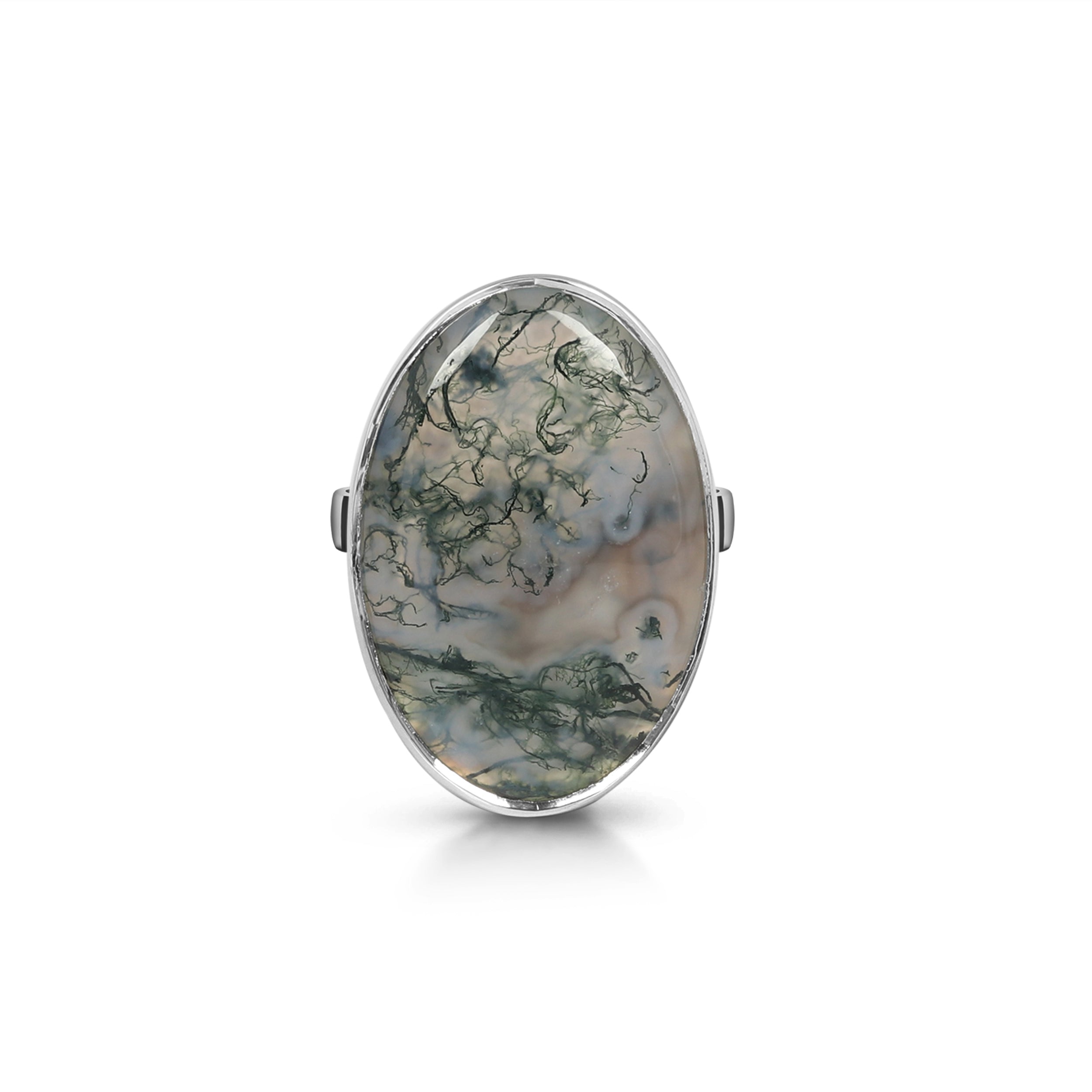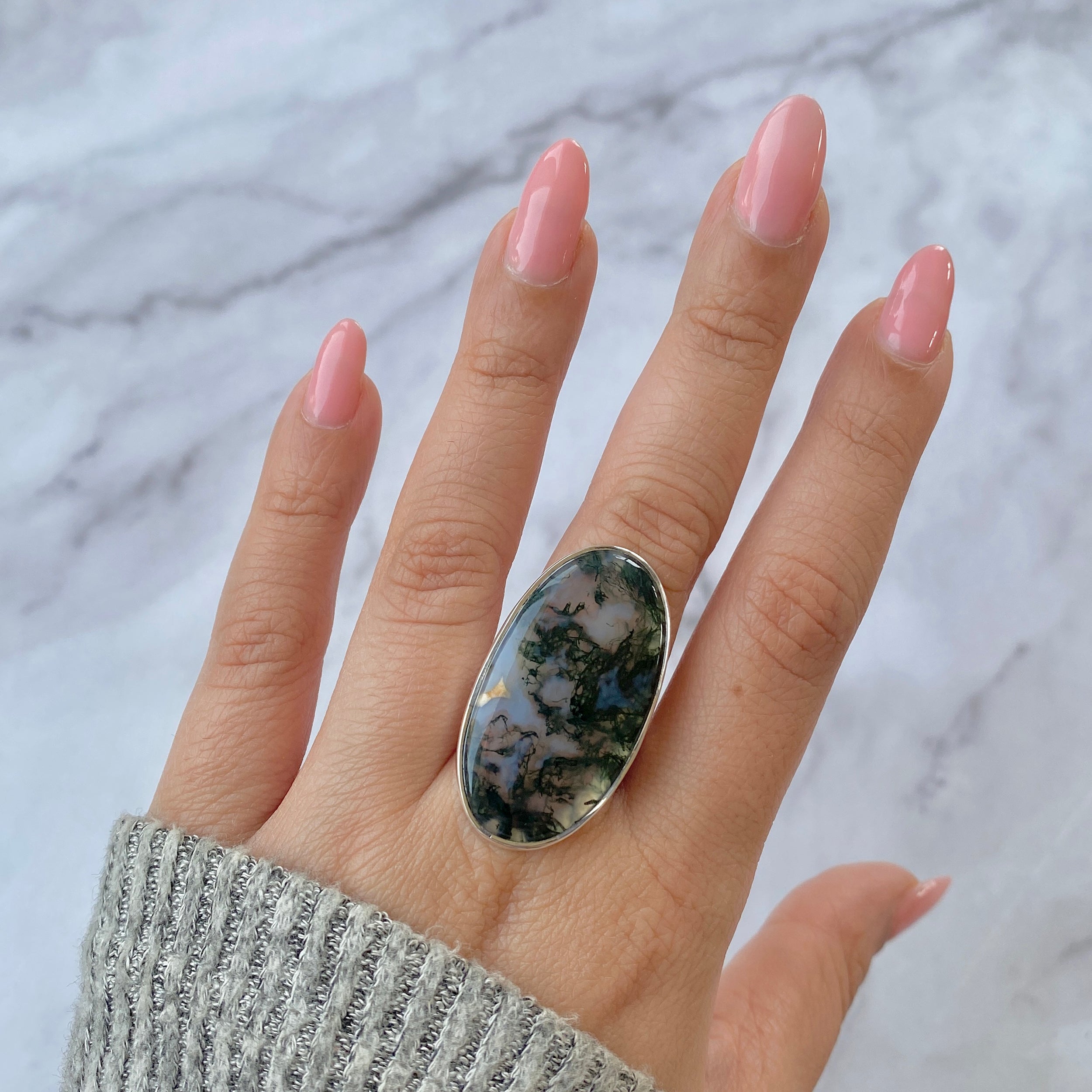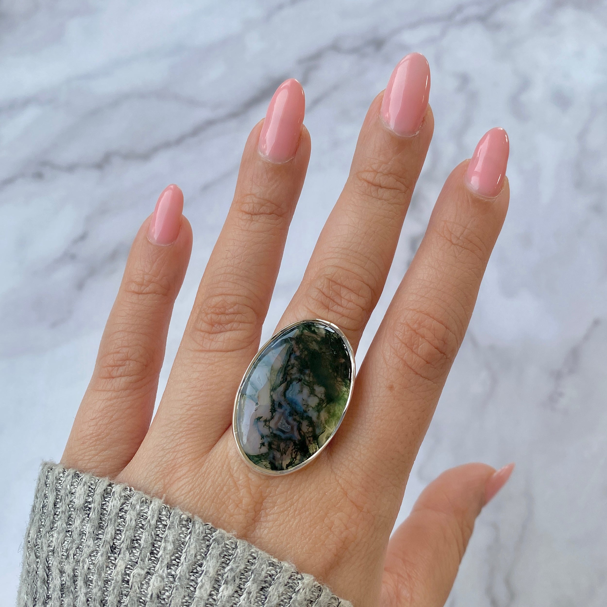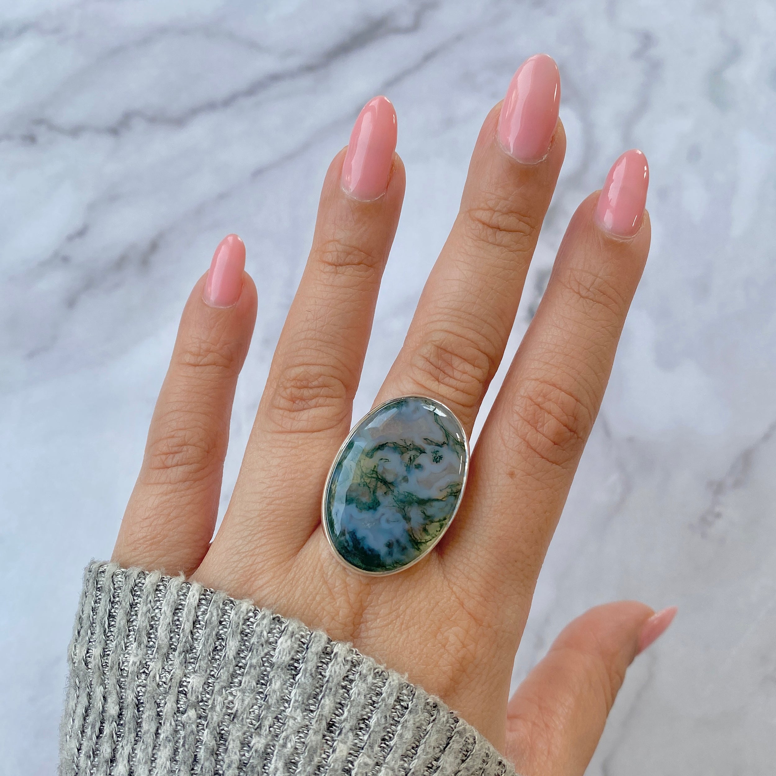 A moss agate ring is considered a perfect jewelry piece because of its beauty and appearance. A statement ring can be an excellent option for those who love to accessorize themselves. Moss agate is an eye-catching stone that will look amazing when worn as jewelry, such as pendants, necklaces, bracelets, rings, and earrings. Wearing a Moss agate ring is believed to bring good luck and fortune. Moss agate rings can be styled with other gemstone jewelry, such as stunning amethyst rings, enhancing the wearer's appearance and personality. Other gemstone jewelry that can be paired with moss agate are tiger eye rings and Rhodochrosite rings. If moss agate rings are crafted with 925 sterling silver, it will bring satisfaction to your life and may boost your self-esteem.
