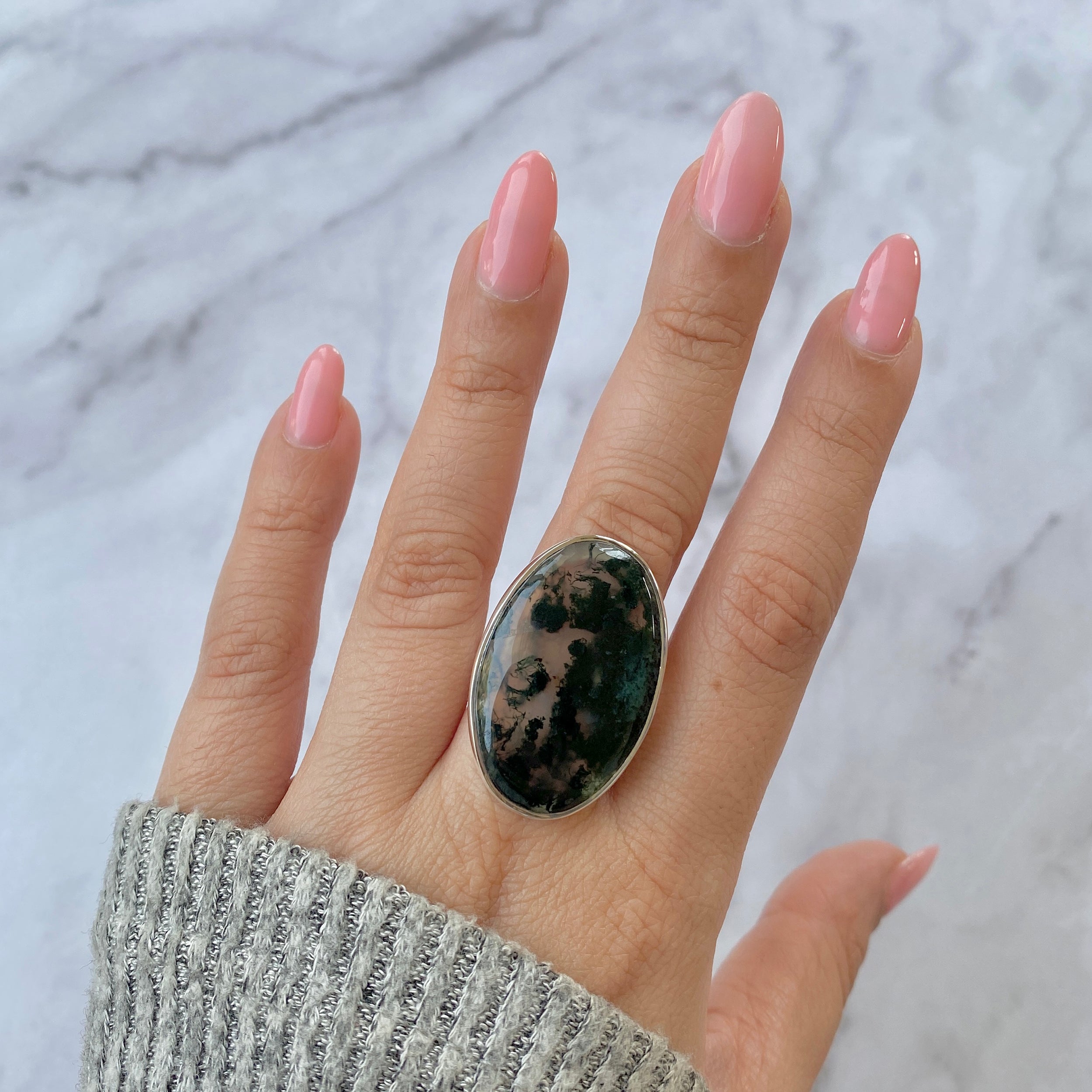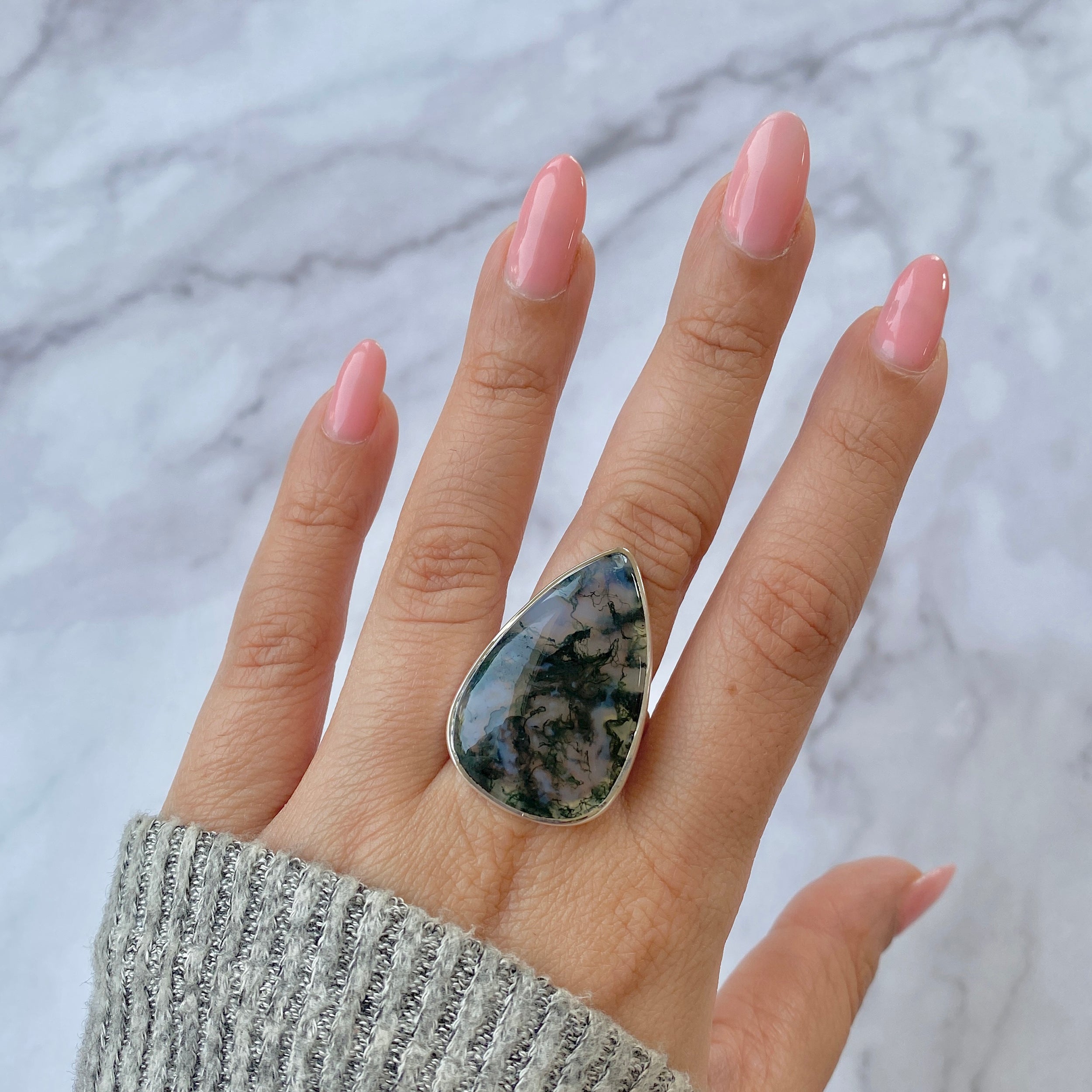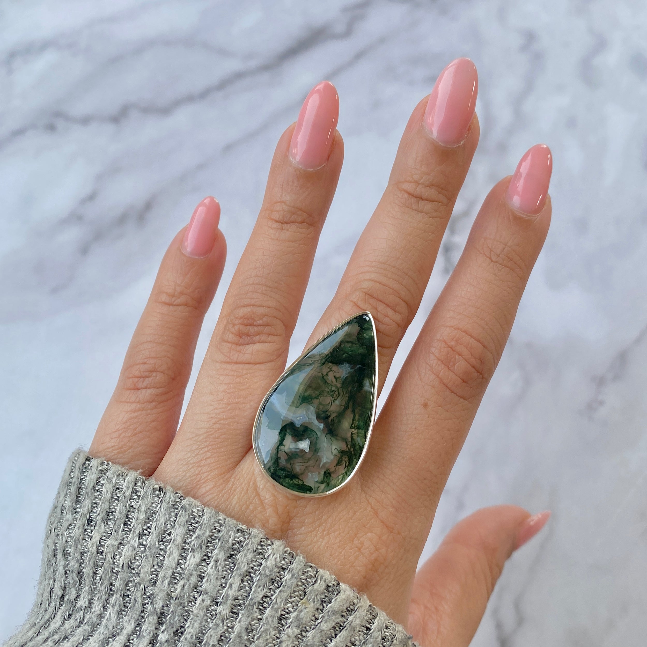 A moss agate ring is considered a perfect jewelry piece because of its beauty and appearance. A statement ring can be an excellent option for those who love to accessorize themselves. Moss agate is an eye-catching stone that will look amazing when worn as jewelry, such as pendants, necklaces, bracelets, rings, and earrings. Wearing a Moss agate ring is believed to bring good luck and fortune. Moss agate rings can be styled with other gemstone jewelry, such as stunning amethyst rings, enhancing the wearer's appearance and personality. Other gemstone jewelry that can be paired with moss agate are tiger eye rings and Rhodochrosite rings. If moss agate rings are crafted with 925 sterling silver, it will bring satisfaction to your life and may boost your self-esteem.
