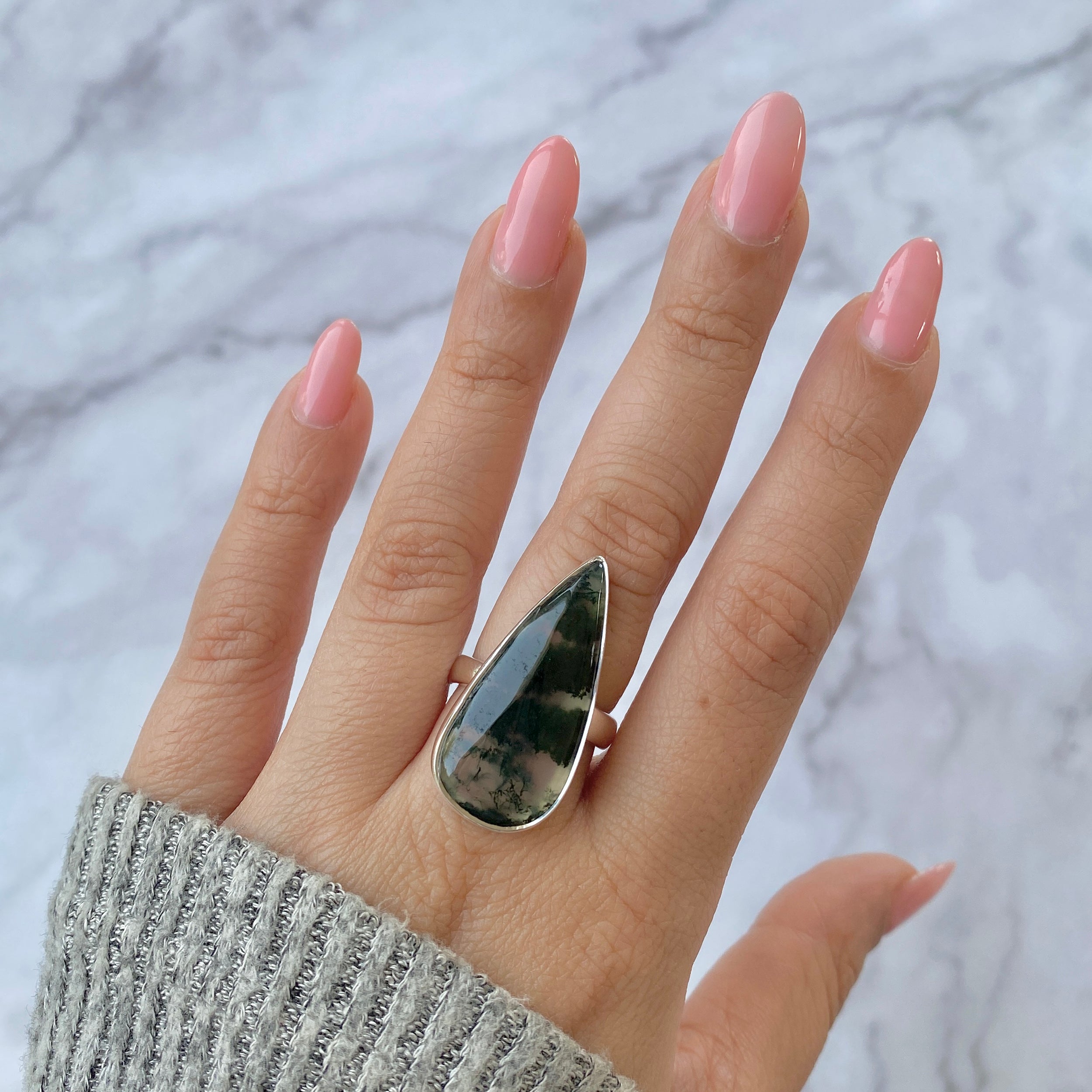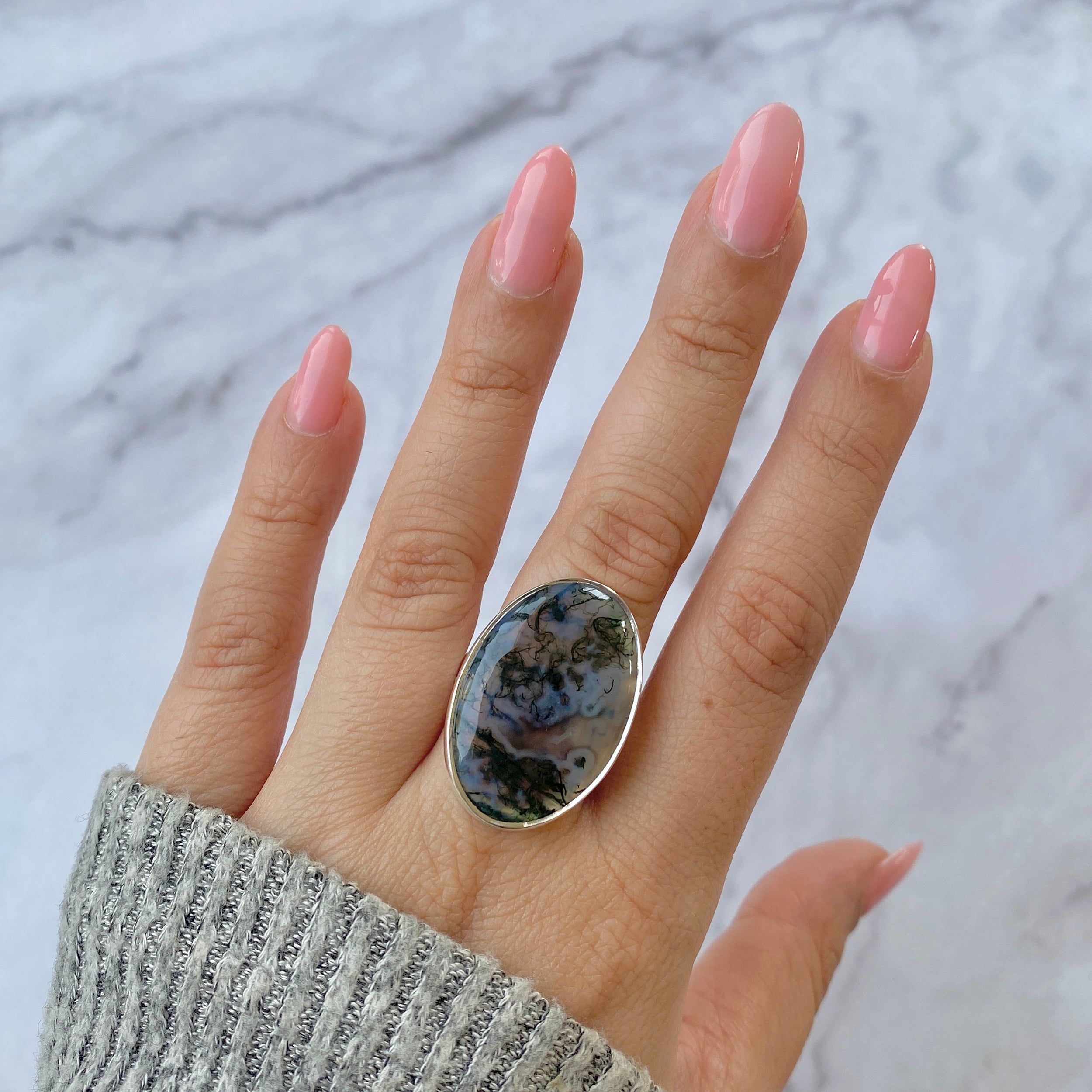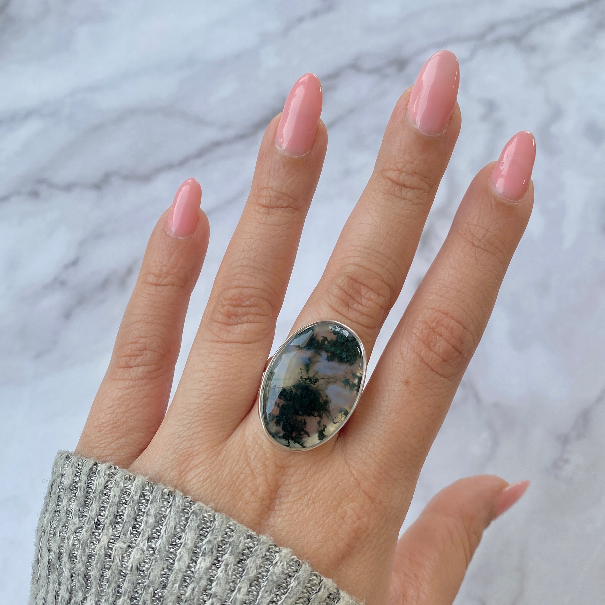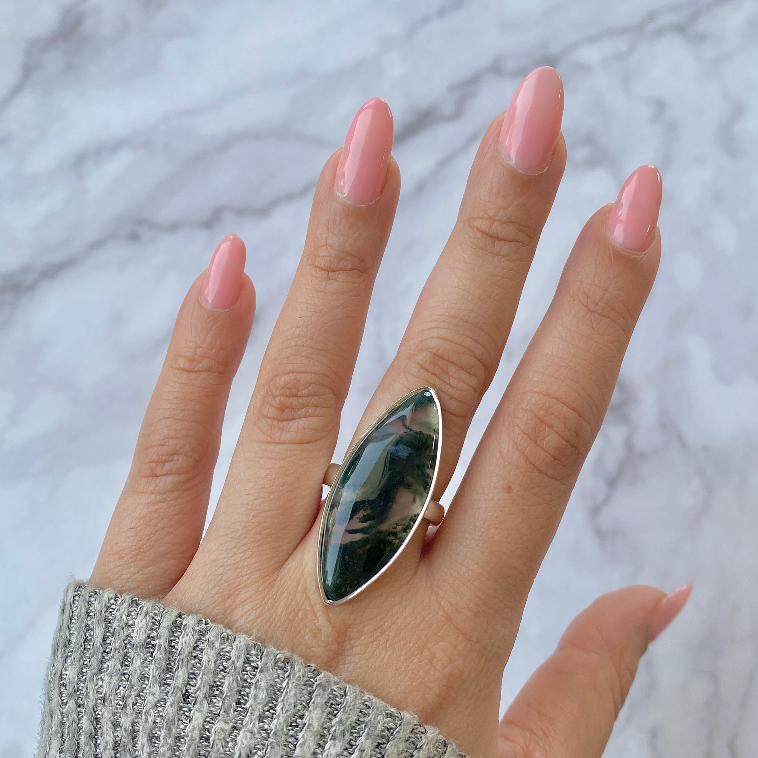 A moss agate ring is considered a perfect jewelry piece because of its beauty and appearance. A statement ring can be an excellent option for those who love to accessorize themselves. Moss agate is an eye-catching stone that will look amazing when worn as jewelry, such as pendants, necklaces, bracelets, rings, and earrings. Wearing a Moss agate ring is believed to bring good luck and fortune. Moss agate rings can be styled with other gemstone jewelry, such as stunning amethyst rings, enhancing the wearer's appearance and personality. Other gemstone jewelry that can be paired with moss agate are tiger eye rings and Rhodochrosite rings. If moss agate rings are crafted with 925 sterling silver, it will bring satisfaction to your life and may boost your self-esteem.