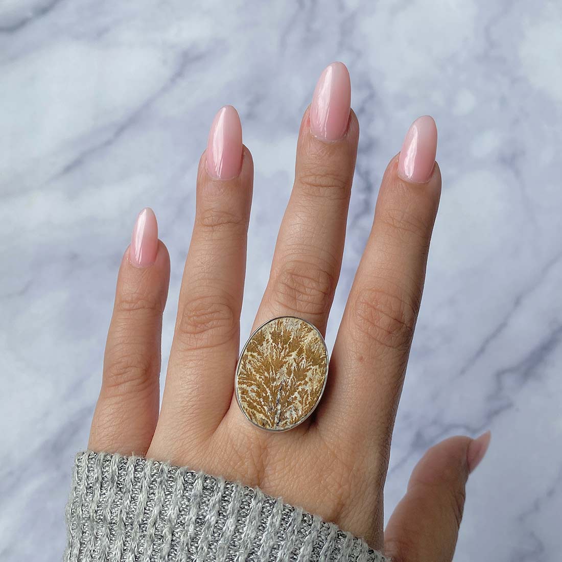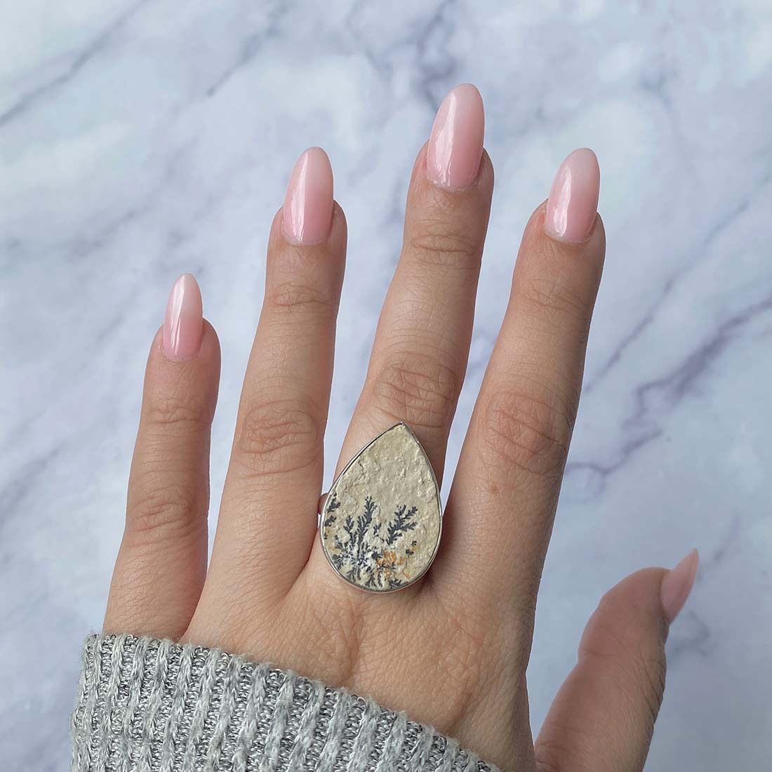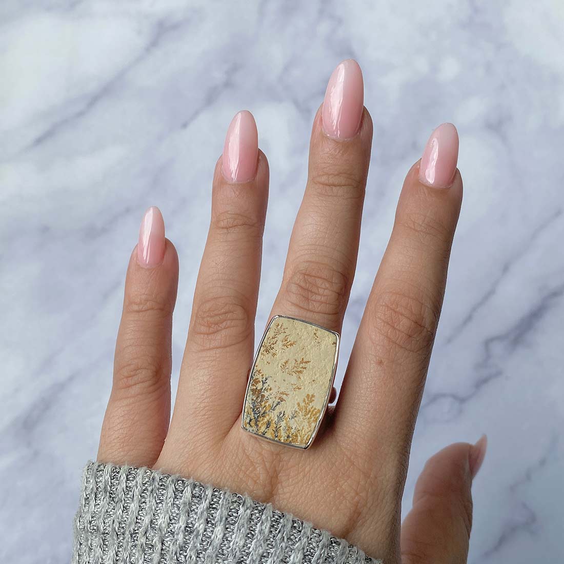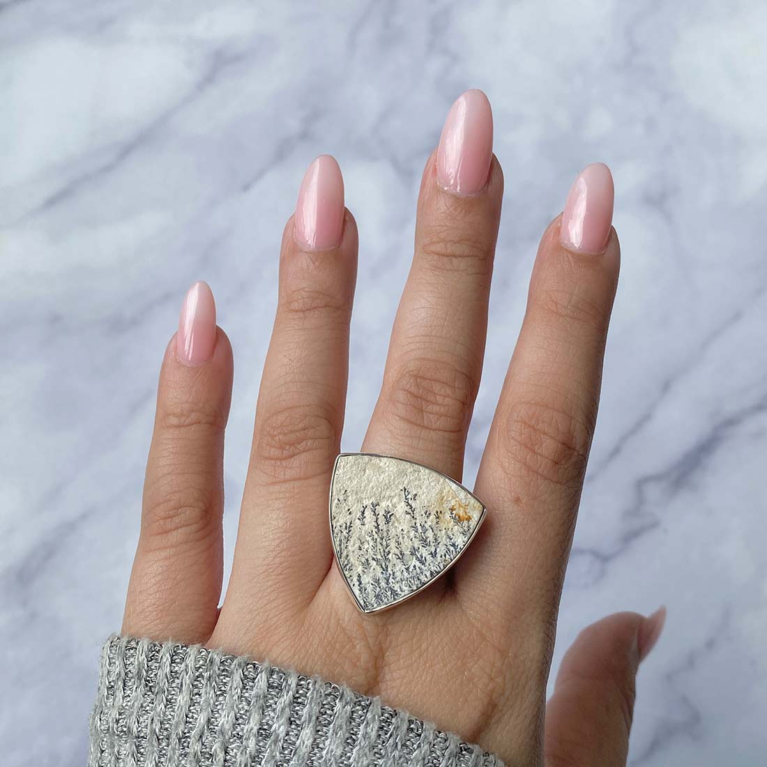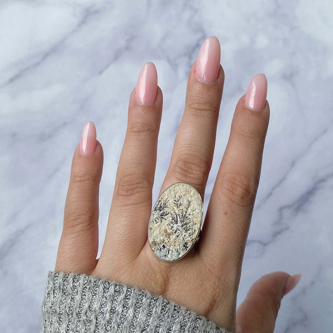 Rings make great statement pieces, plus they are so beautiful and easy to pair with outfits, making them a perfect accessory for a complementing personality. Moreover, you can mix and match them with other dainty silver or golden bands to create an outgoing, bohemian-inspired look. If you're searching for an ideal piece of statement ring, we recommend them with the added beauty of colored gemstones. On this page, you can find one of our classic findings from the astonishing world of gemstones that would complement your personal style and color scheme of the entire ensemble.  It is Psilomelane Dendrite which is being highly celebrated in Psilomelane Dendrite Jewelry pieces, especially Psilomelane Dendrite rings that exude nature's refinement and splendor wrapped through our fingers.