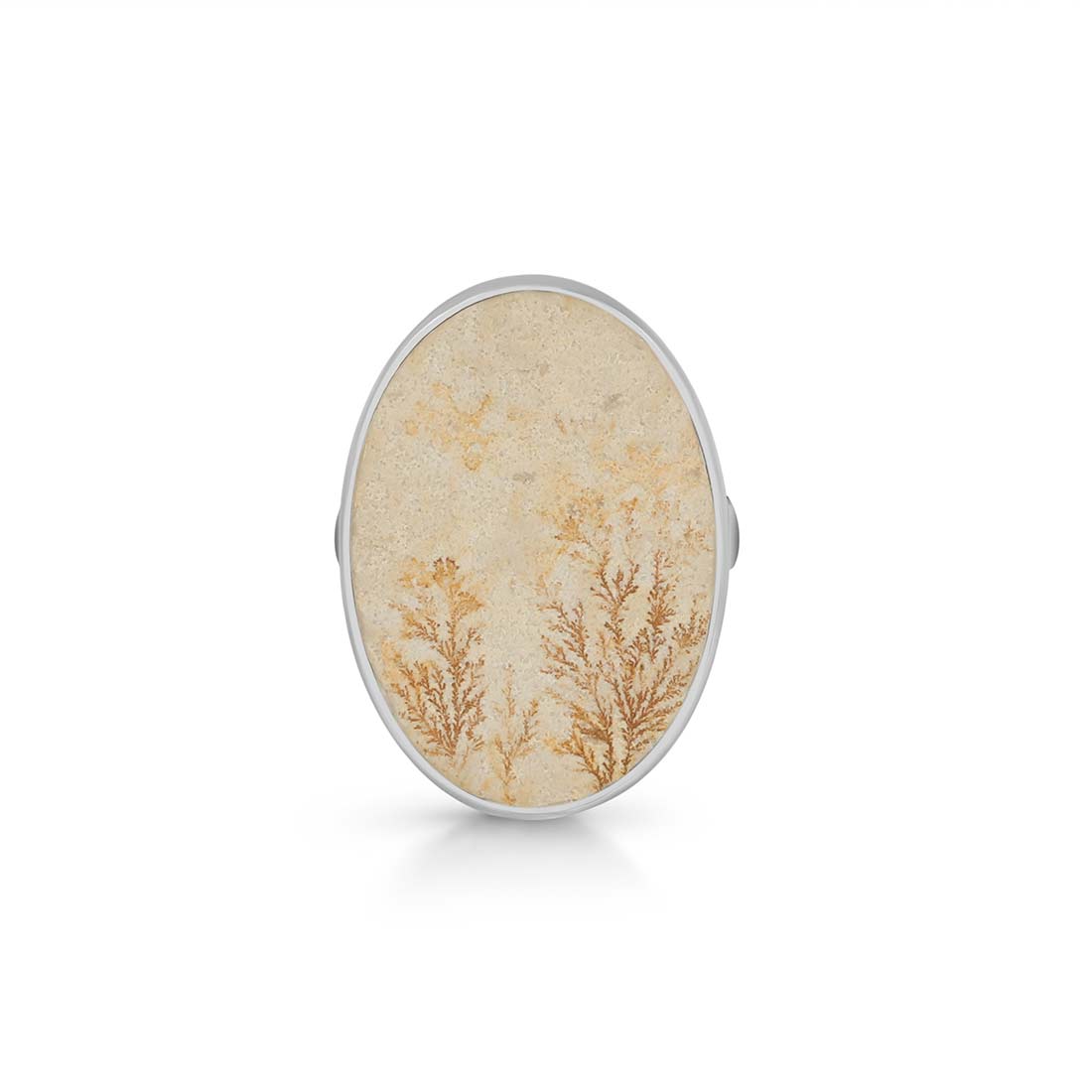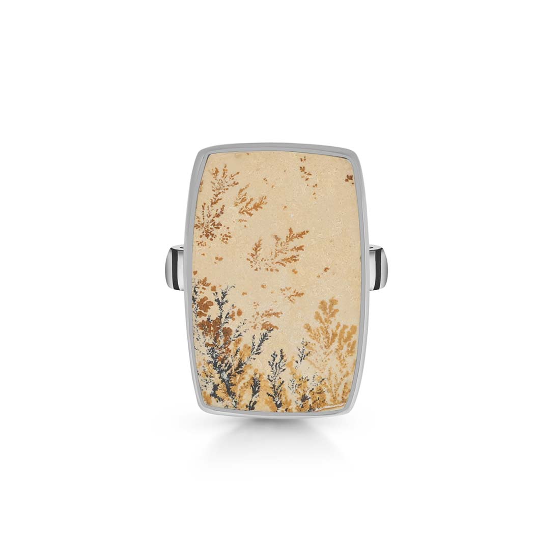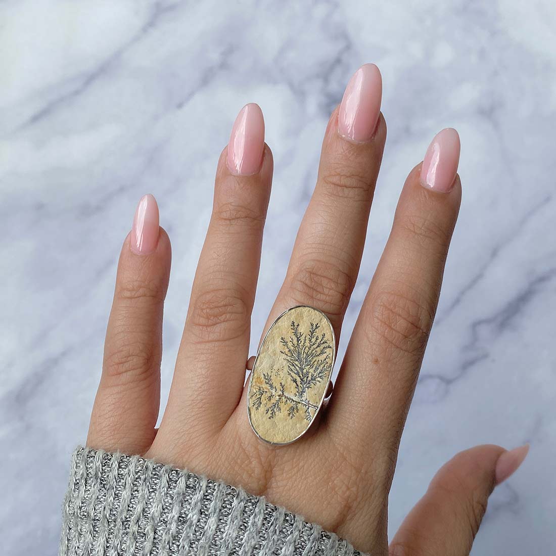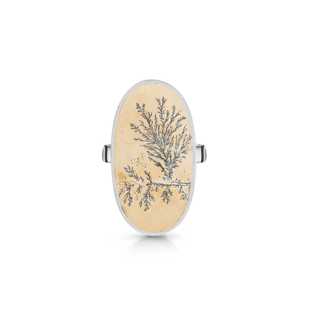 Well, Dendritic stone is a variety of chalcedony that comprises trace elements like iron oxides and manganese minerals during its formation, causing these tree-like patterns that can range from black and gray to brown. A rare example of Mother Nature's creativity, Psilomelane Dendrite ranks 5 to 6 on the Mohs scale, making it a relatively soft and delicate stone. It means you can flaunt your Psilomelane Dendrite rings on specific occasions to create a show-stealer appearance. Despite its softness, it is less likely to get broken as it has no cleavage.